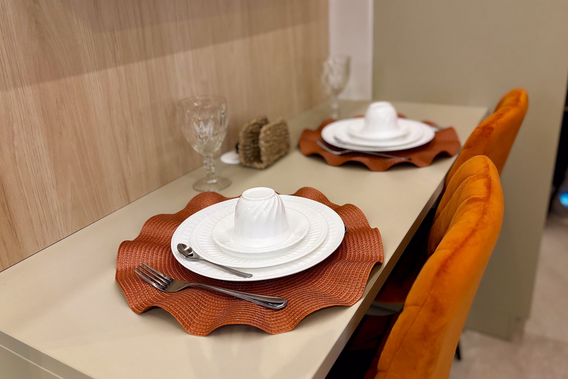 - Utensílios básicos (copos, xícaras, taças, pratos, talheres, jogo de panelas básico e utensílios de cozinha)