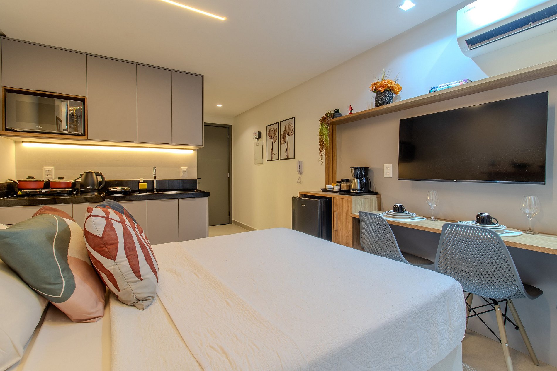 Você terá a disposição cozinha equipada, enxoval completo de cama e banho, Wi-Fi privativo, SmarTV, vaga de garagem e diversas outras comodidades essenciais ao seu bem estar!