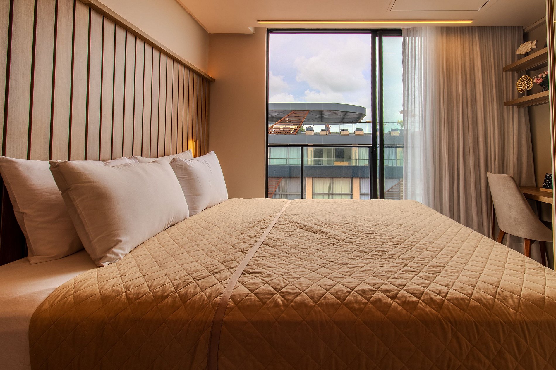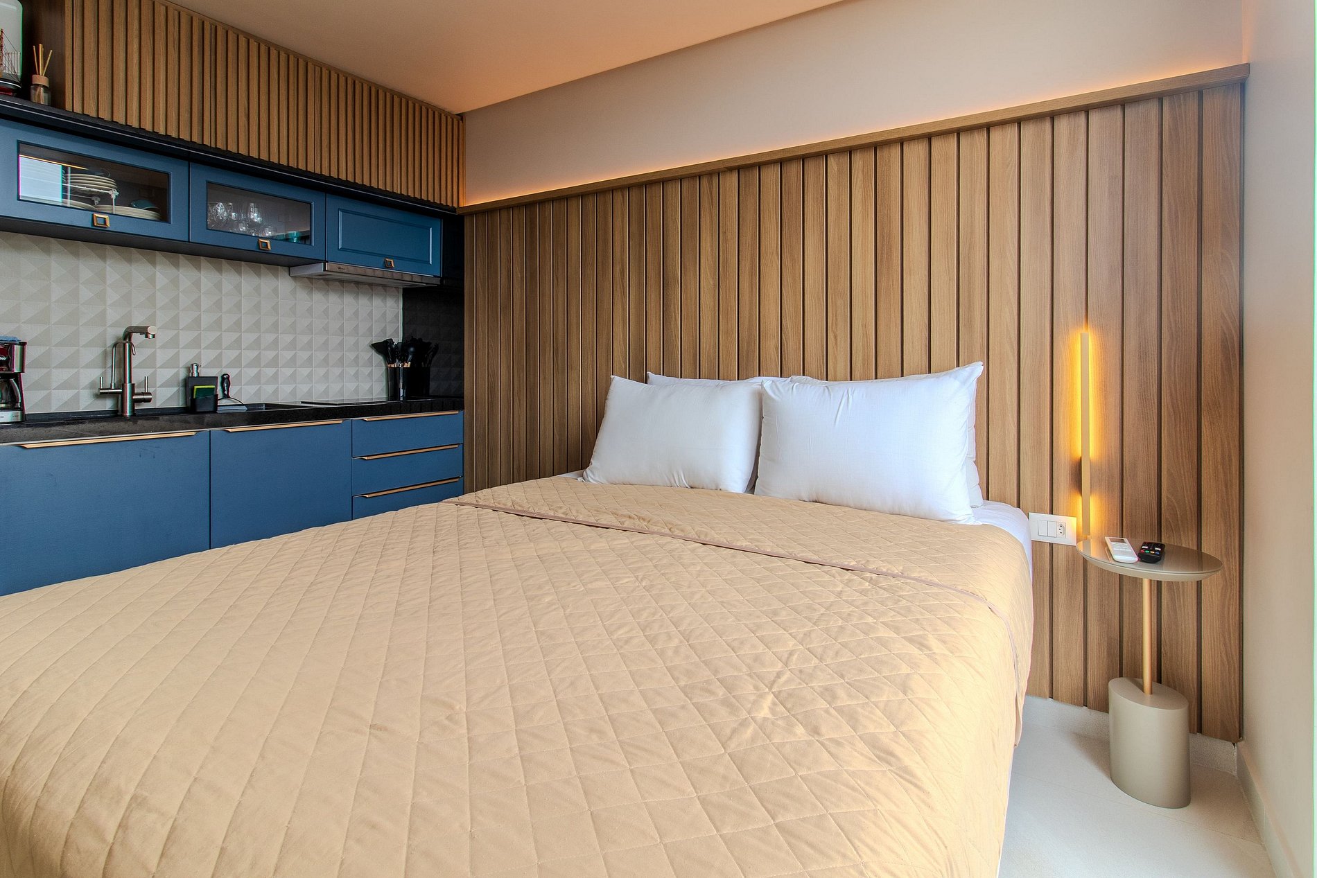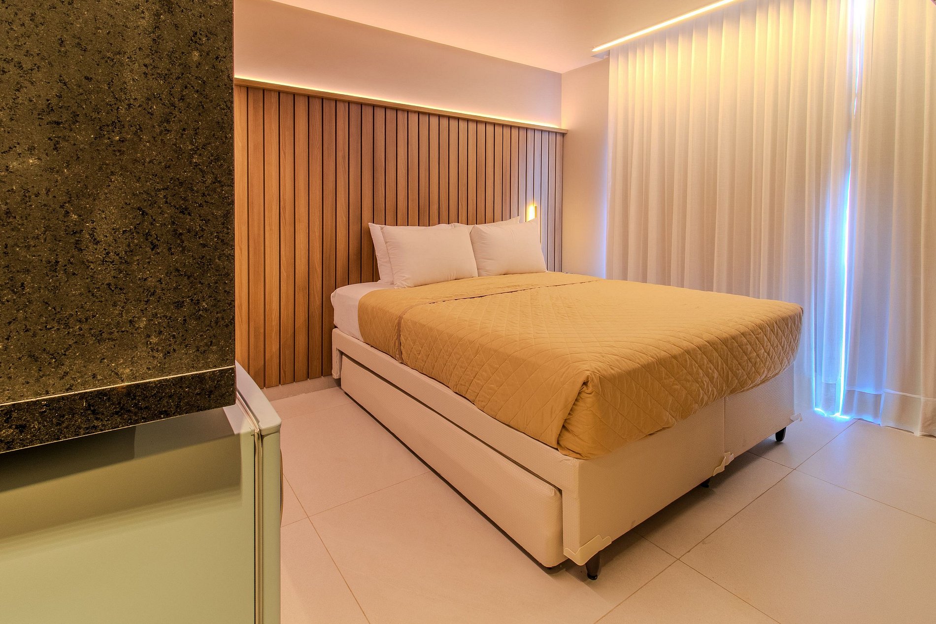 - Cama casal com 1 cama solteiro acoplada com cabeceira projetada