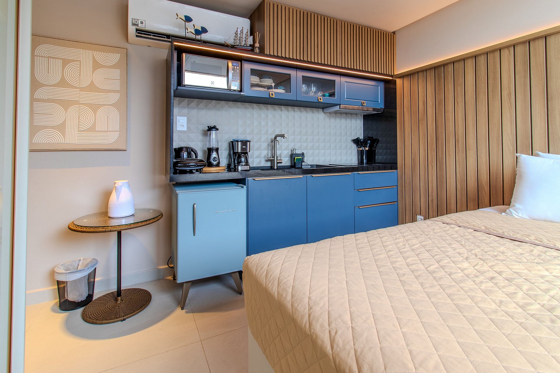 - Utensílios básicos (copos, xícaras, taças, pratos, talheres, jogo de panelas básico e utensílios de cozinha)