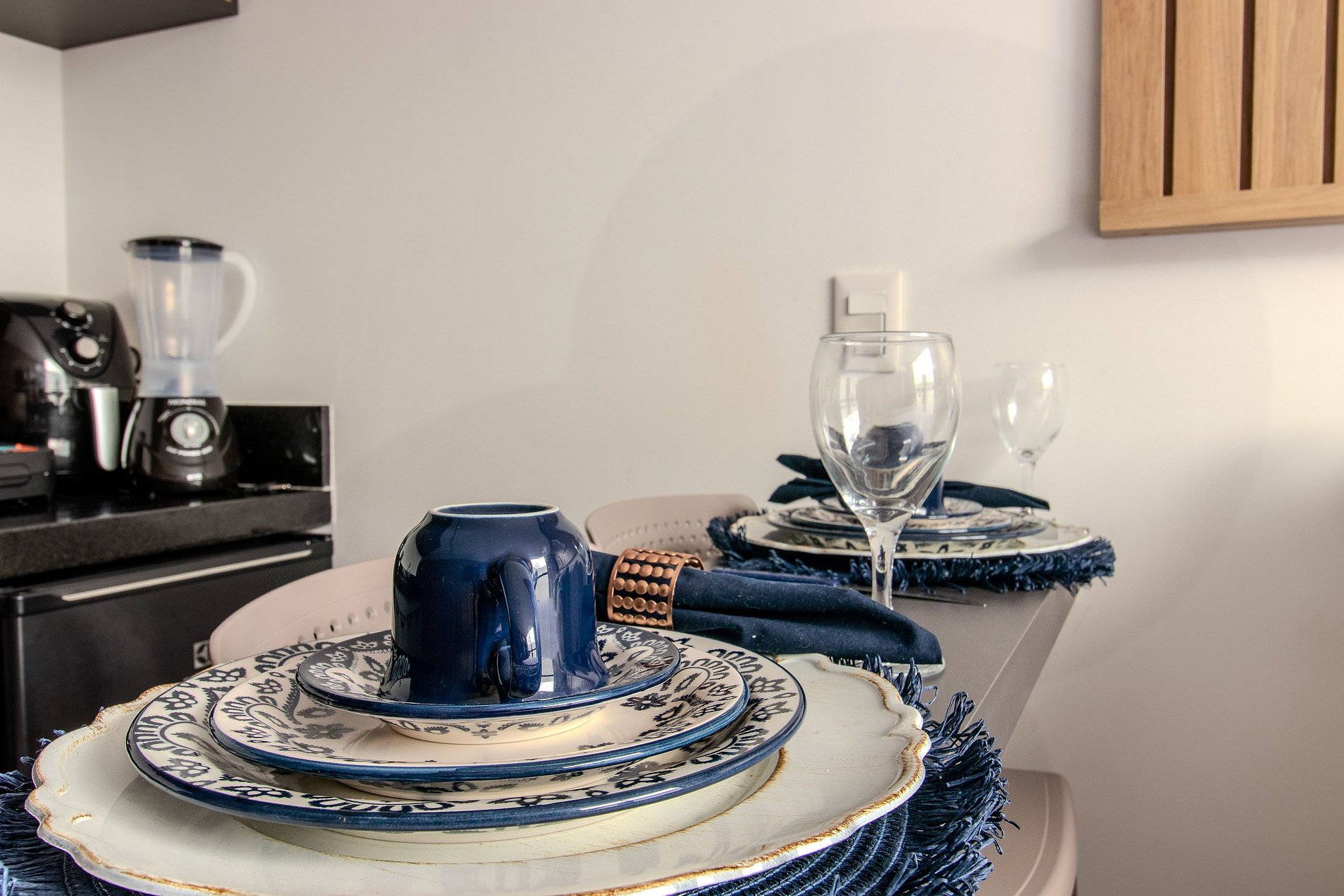 - Utensílios básicos (copos, xícaras, pratos, talheres)