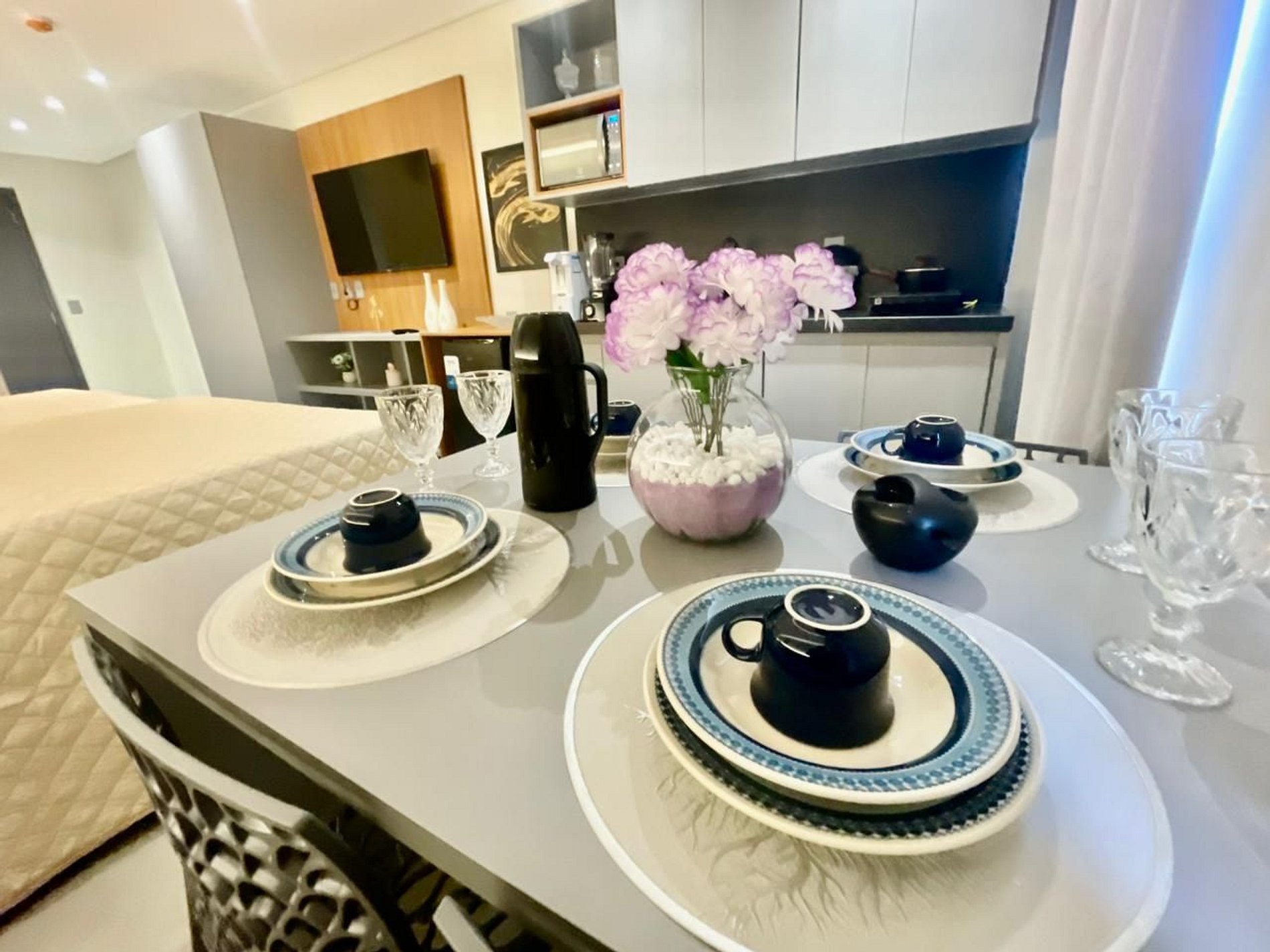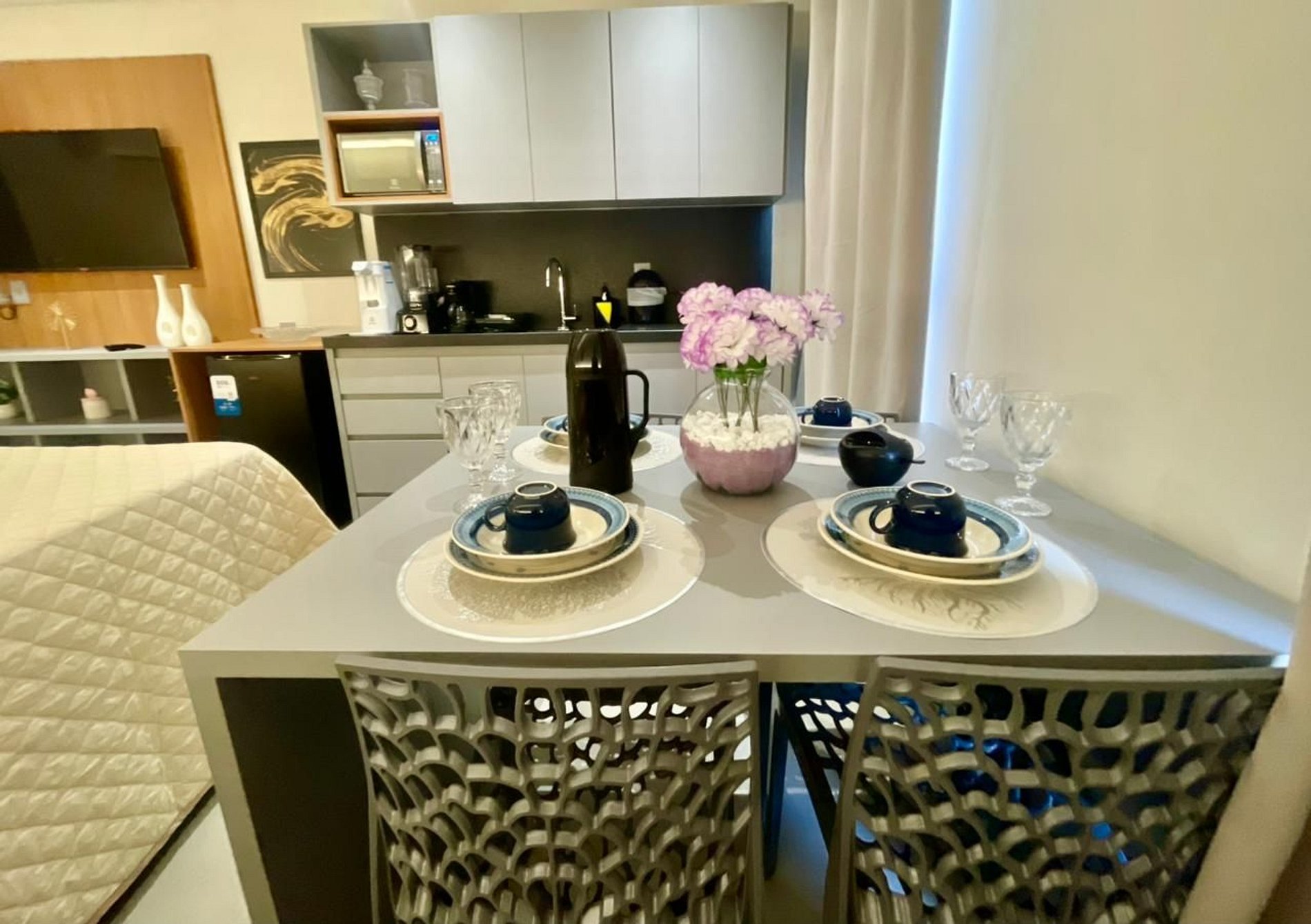 - Utensílios básicos (copos, xícaras, taças, pratos, talheres, jogo de panelas básico e utensílios de cozinha) (No item comodidade não dispomos de óleo, tigelas, vasilhas, pimenta e Hashi).