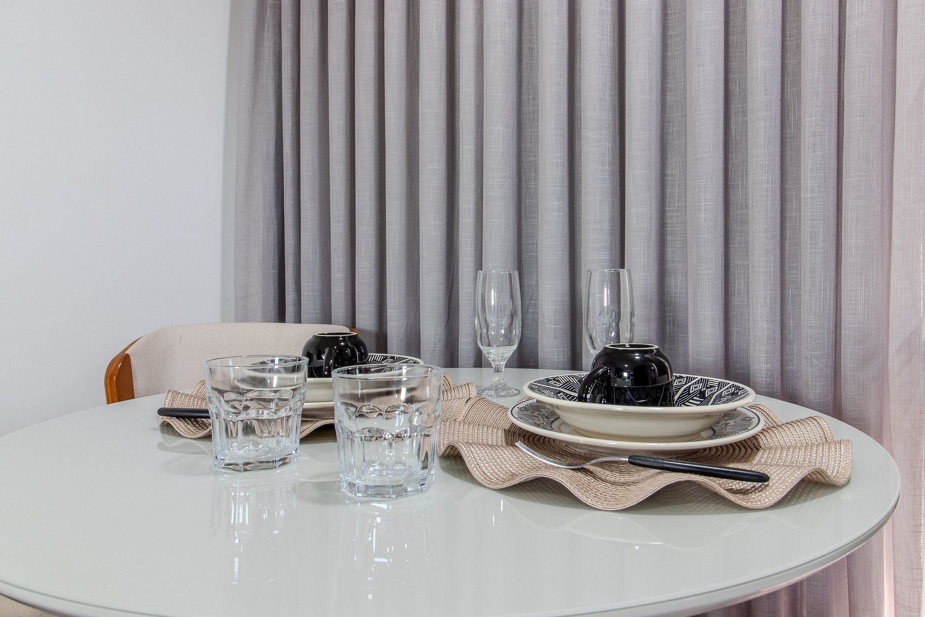 - Utensílios básicos de cozinha (taças, copos, xícaras, pratos, talheres, jogo de panelas e utensílios)