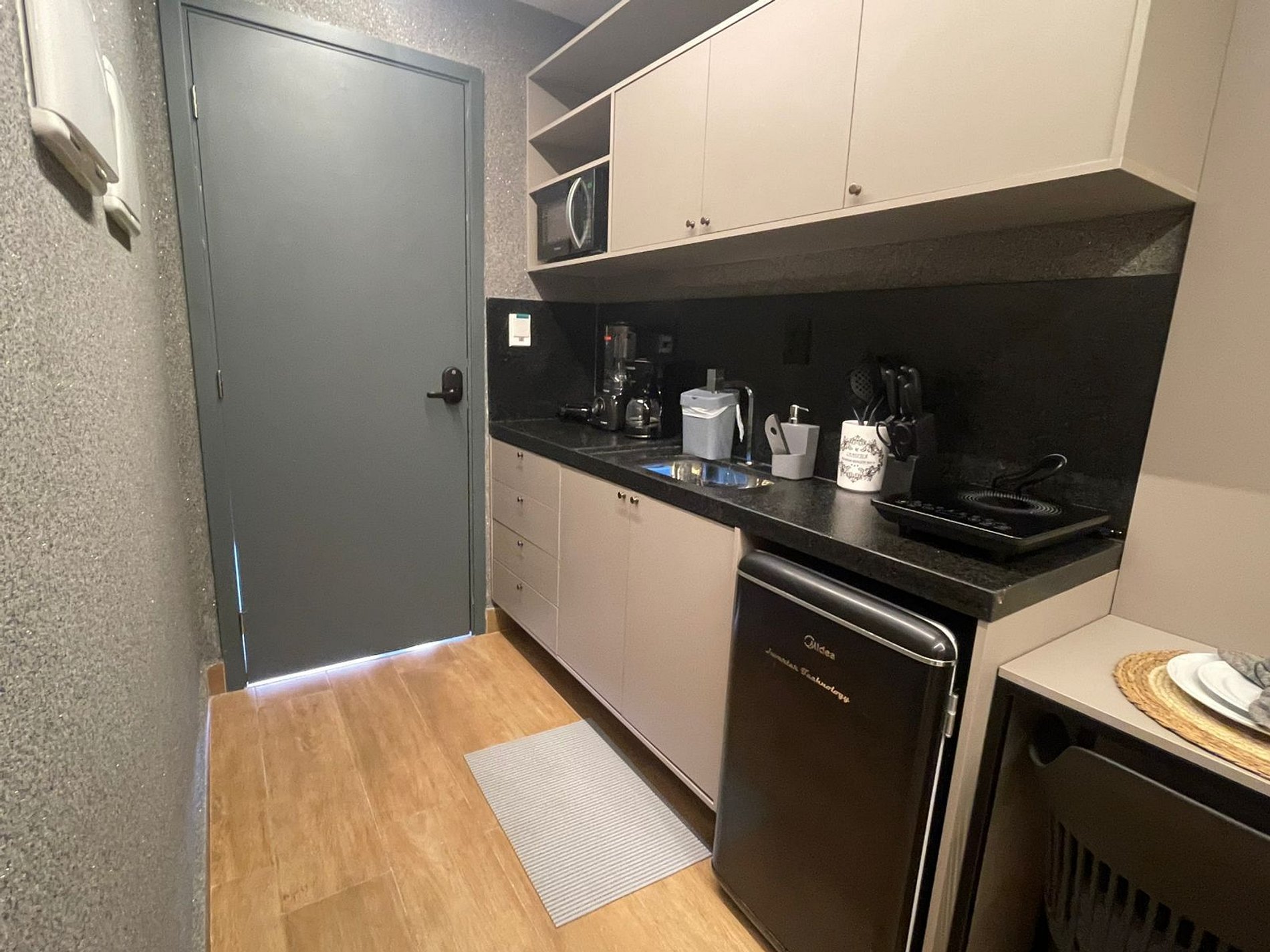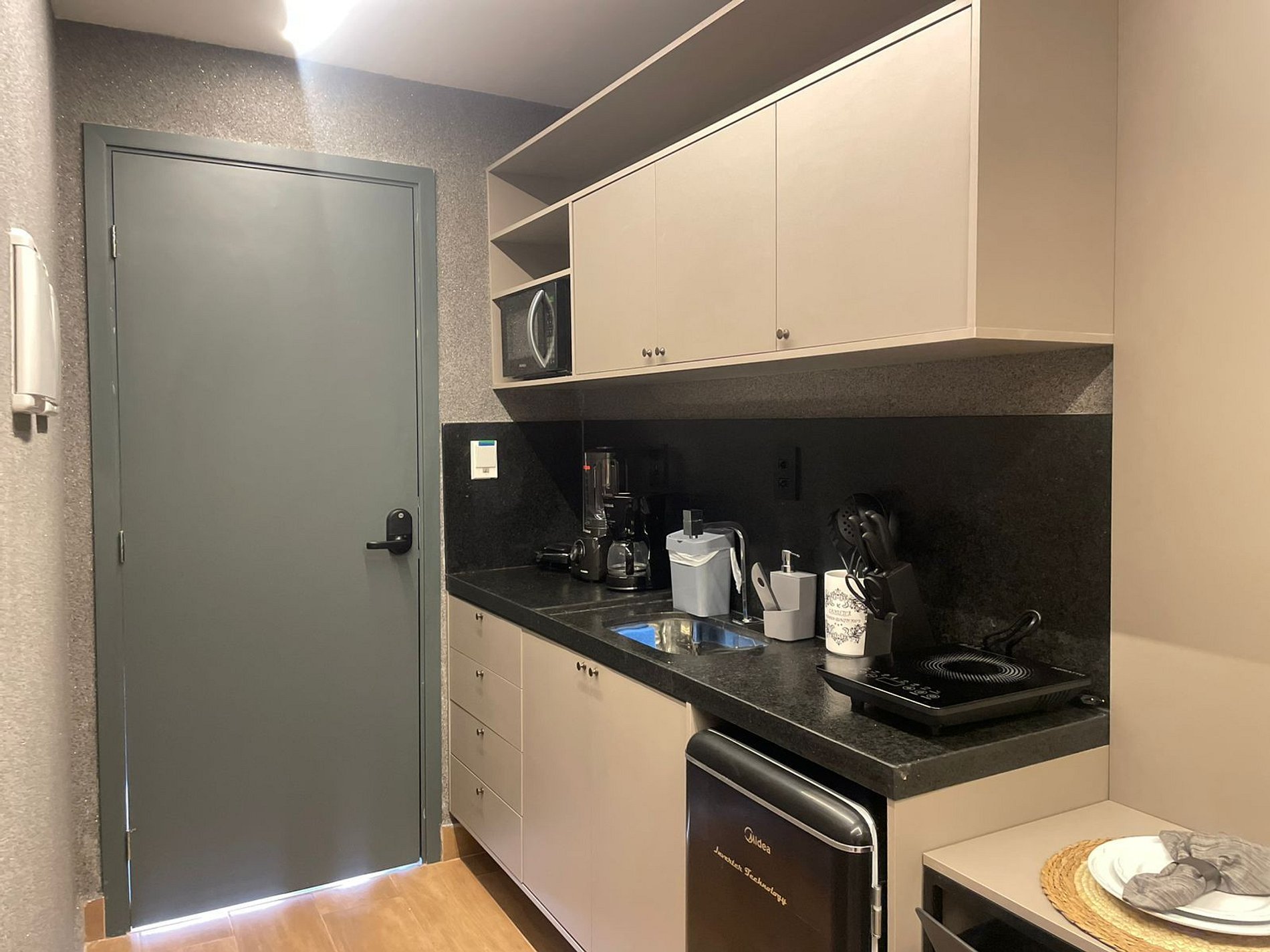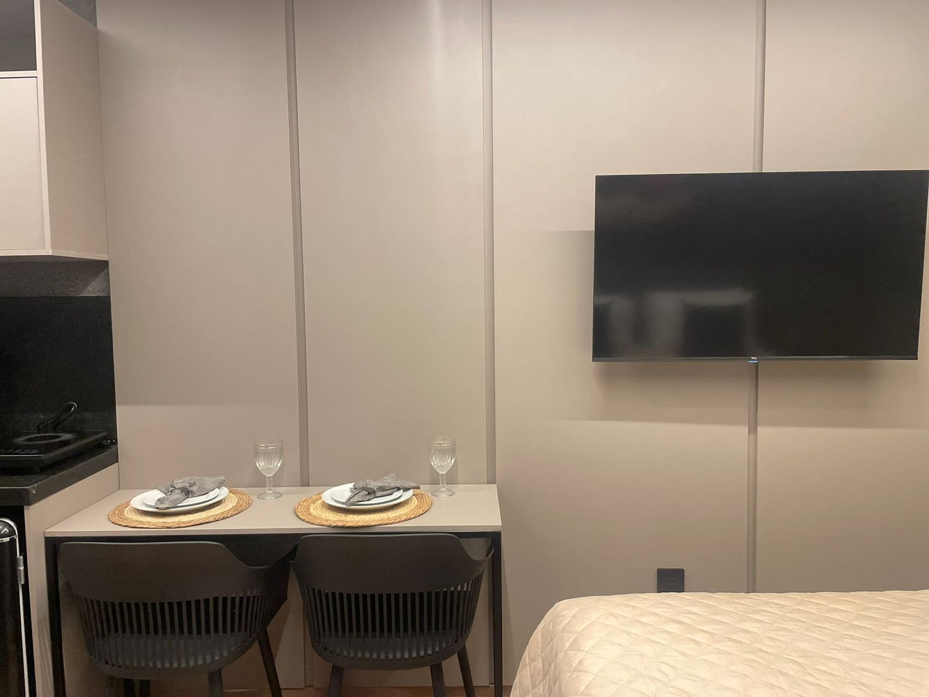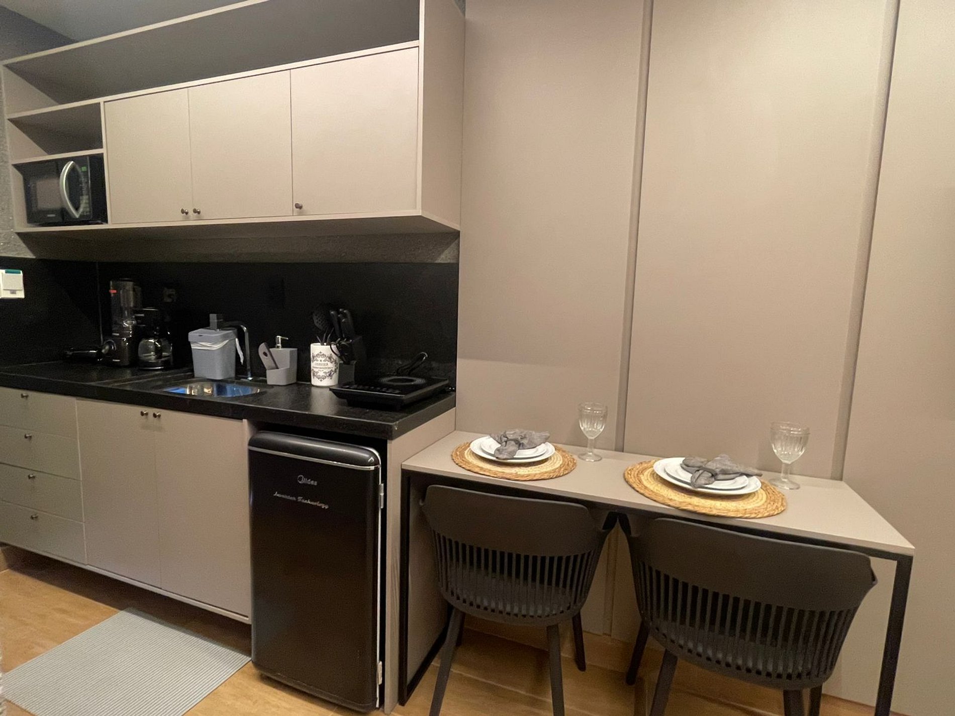 - Utensílios básicos (copos, xícaras, taças, pratos, talheres, kit com 3 panelas básicas e utensílios de cozinha) (No item comodidade não dispomos de óleo, tigelas, vasilhas, pimenta e Hashi)