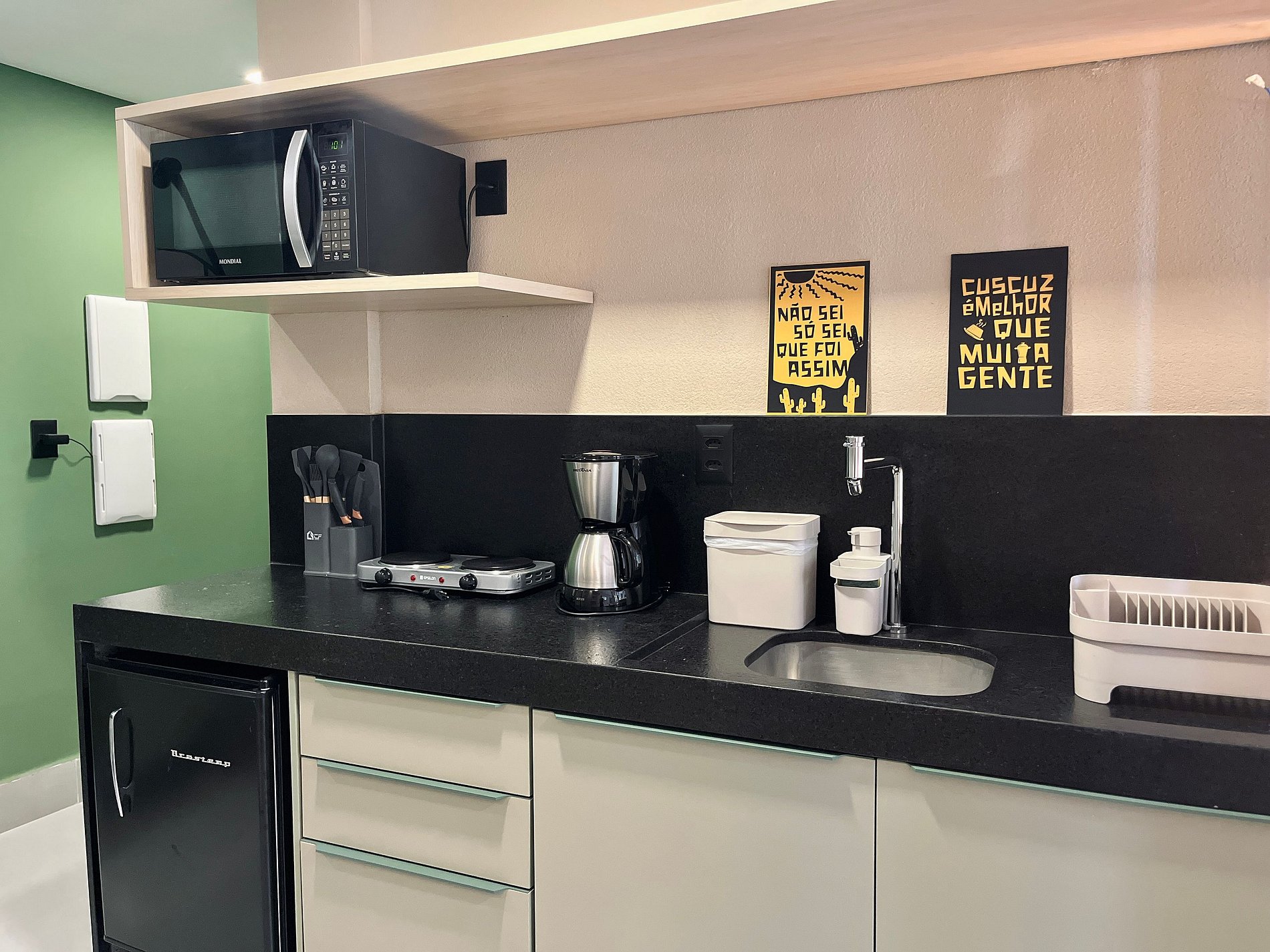 - Utensílios básicos (copos, xícaras, pratos, talheres, jogo de panelas básico e utensílios de cozinha) (No item comodidade não dispomos de óleo, tigelas, vasilhas, pimenta e Hashi)