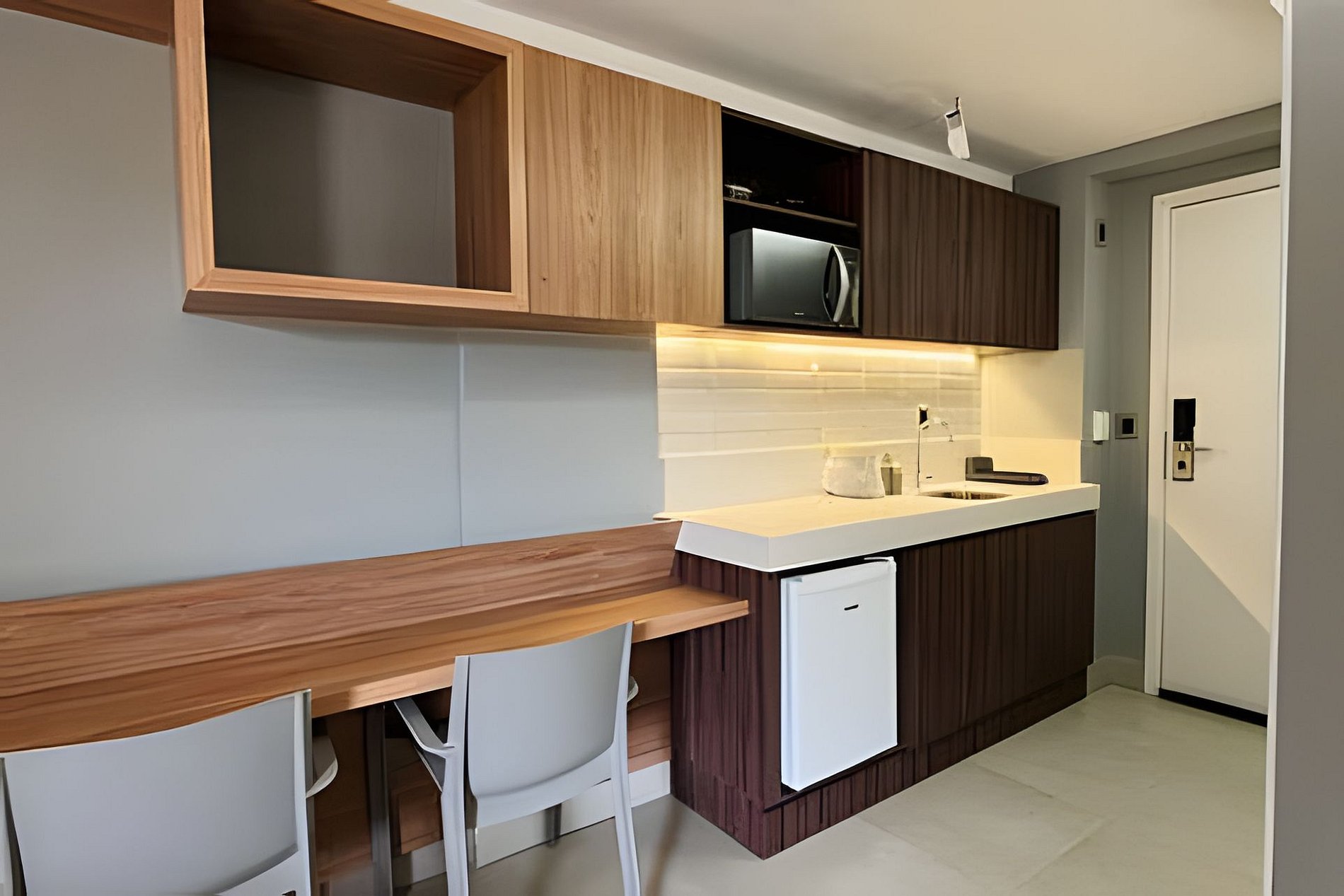 - Cozinha completa com Microondas, Frigobar, Fogão 1 boca, Cafeteira (cápsulas por conta do hóspede), Liquidificador, Sanduicheira e Torradeira. Além de utensílios domésticos como pratos, copos, taças, xícaras, talheres; (No item comodidade não dispomos de óleo, tigelas, vasilhas, pimenta e Hashi).