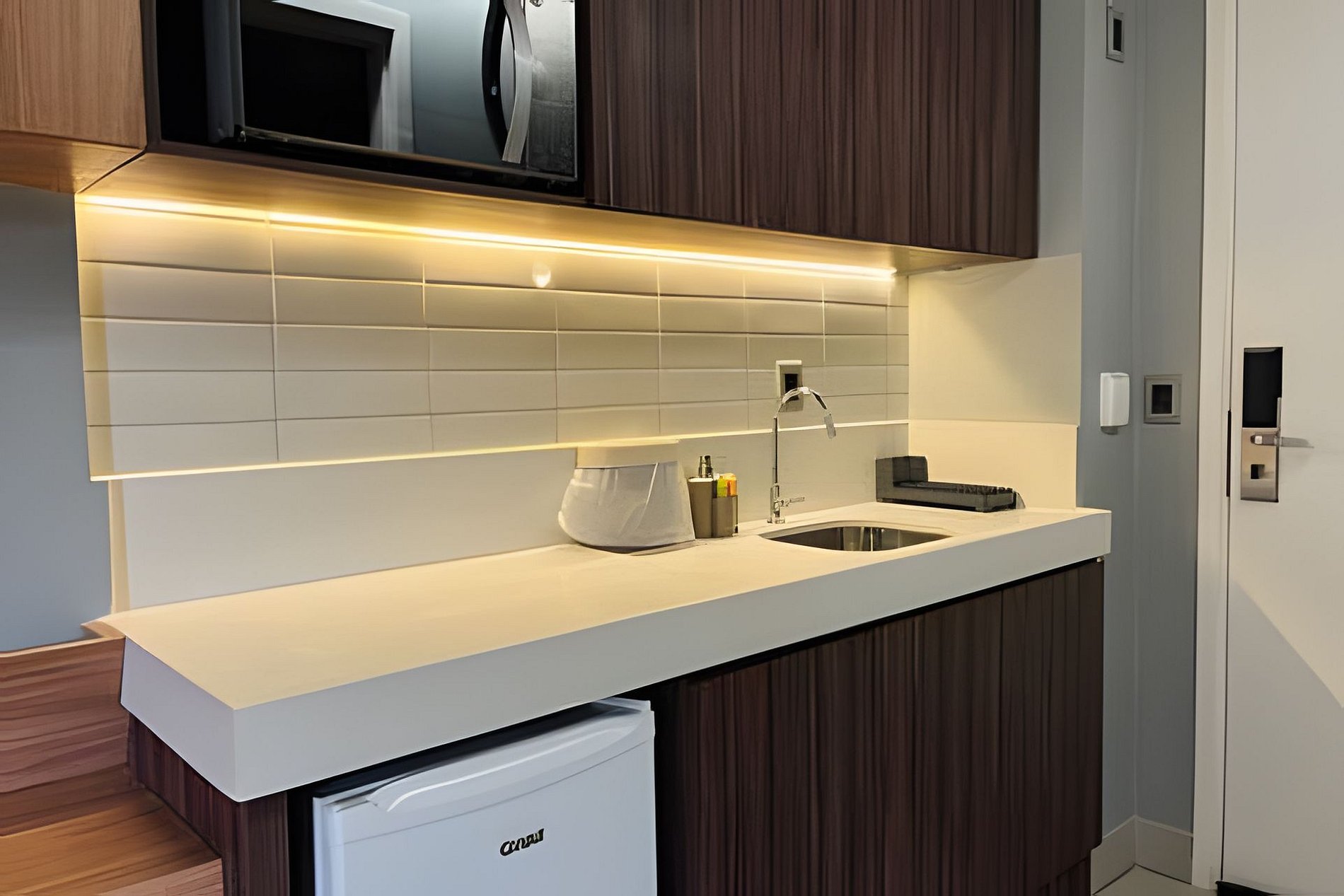 - Cozinha completa com Microondas, Frigobar, Fogão 1 boca, Cafeteira (cápsulas por conta do hóspede), Liquidificador, Sanduicheira e Torradeira. Além de utensílios domésticos como pratos, copos, taças, xícaras, talheres; (No item comodidade não dispomos de óleo, tigelas, vasilhas, pimenta e Hashi).