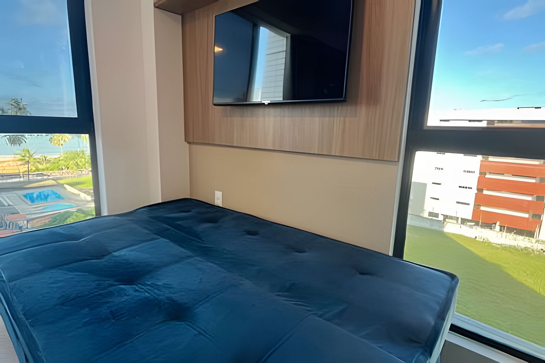 - Suíte com vista frente mar, cama tamanho Queen, sofá cama casal , SmarTV, Espaço para guardar as roupas e Ar condicionado;