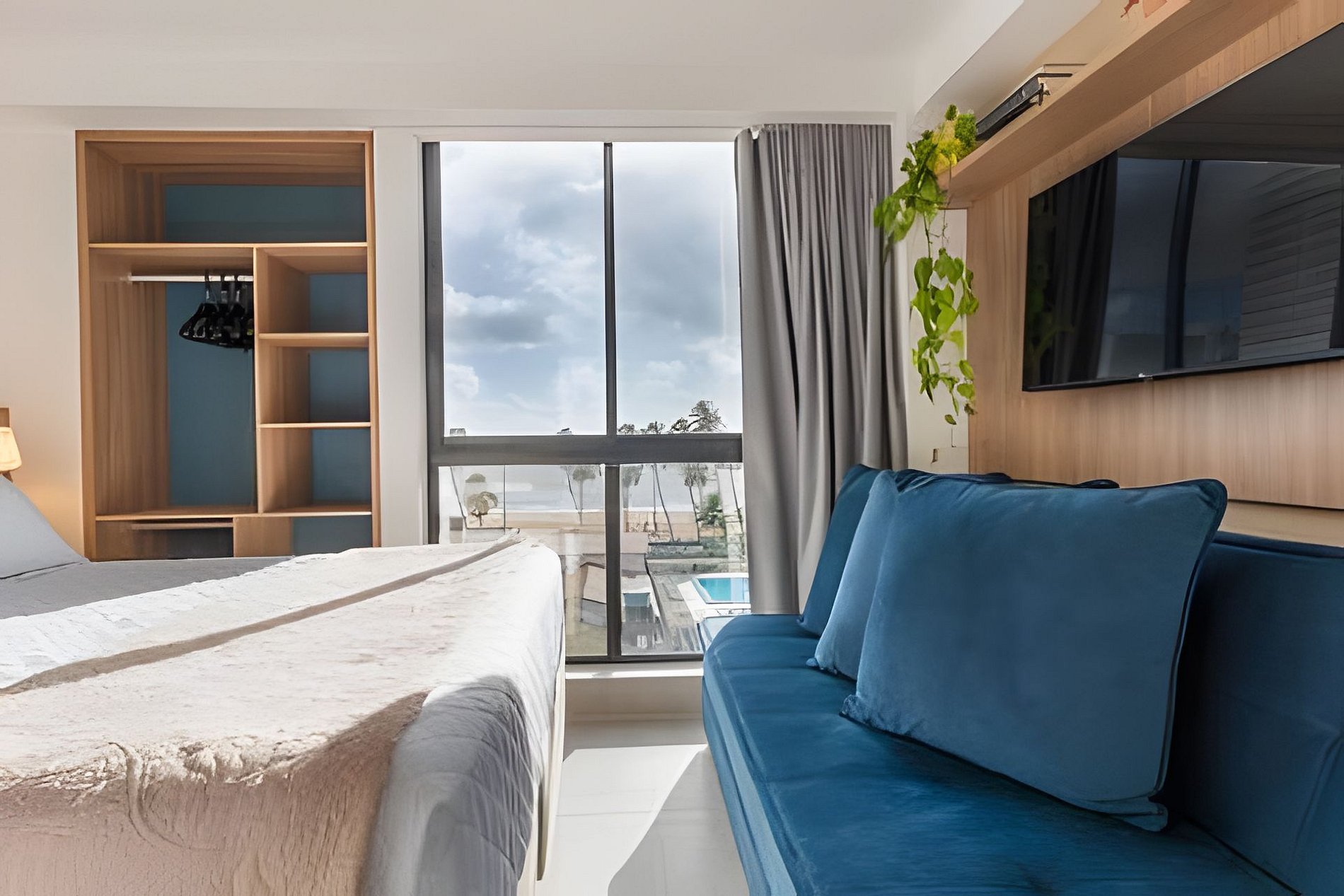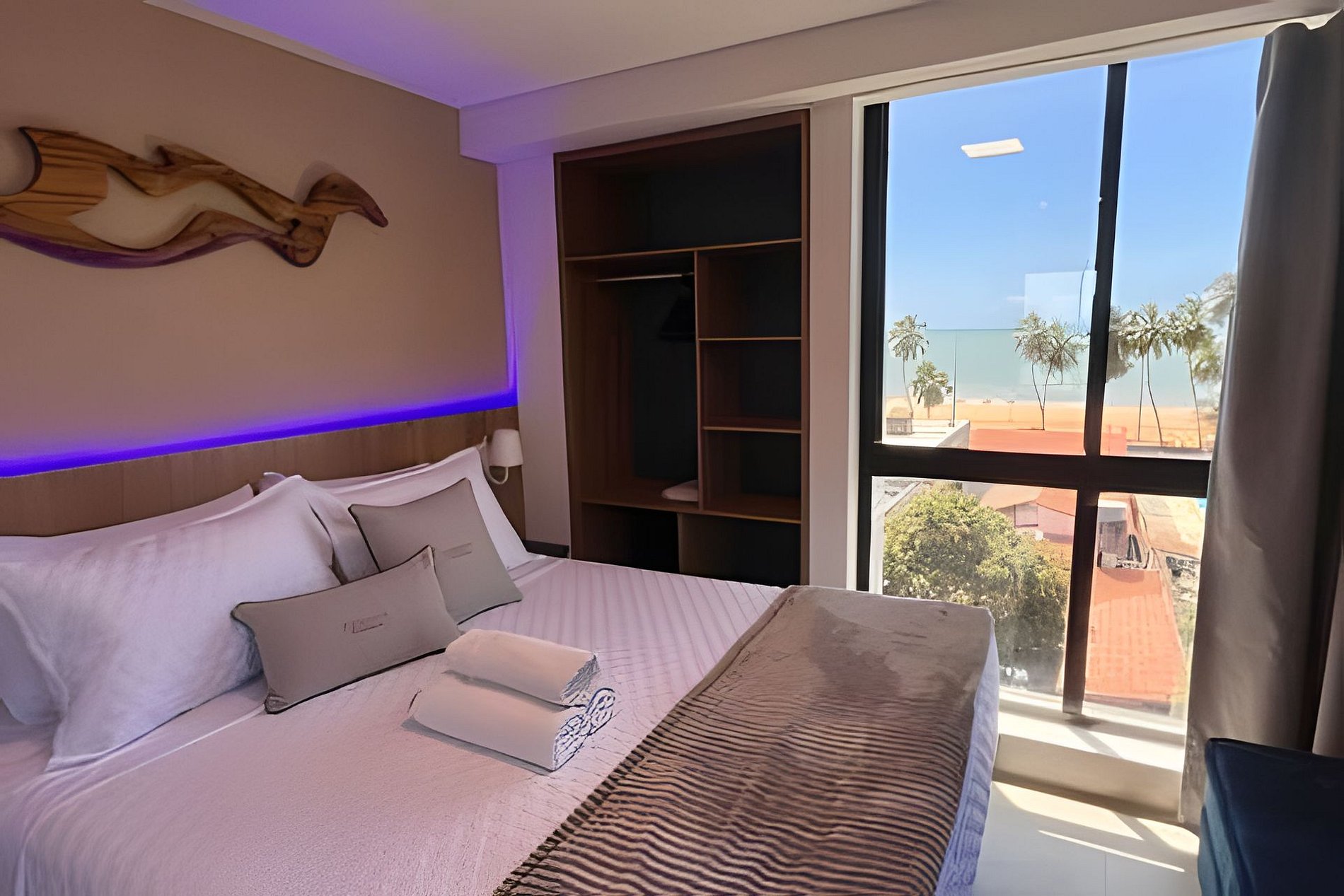 - Suíte com vista frente mar, cama tamanho Queen, sofá cama casal , SmarTV, Espaço para guardar as roupas e Ar condicionado;