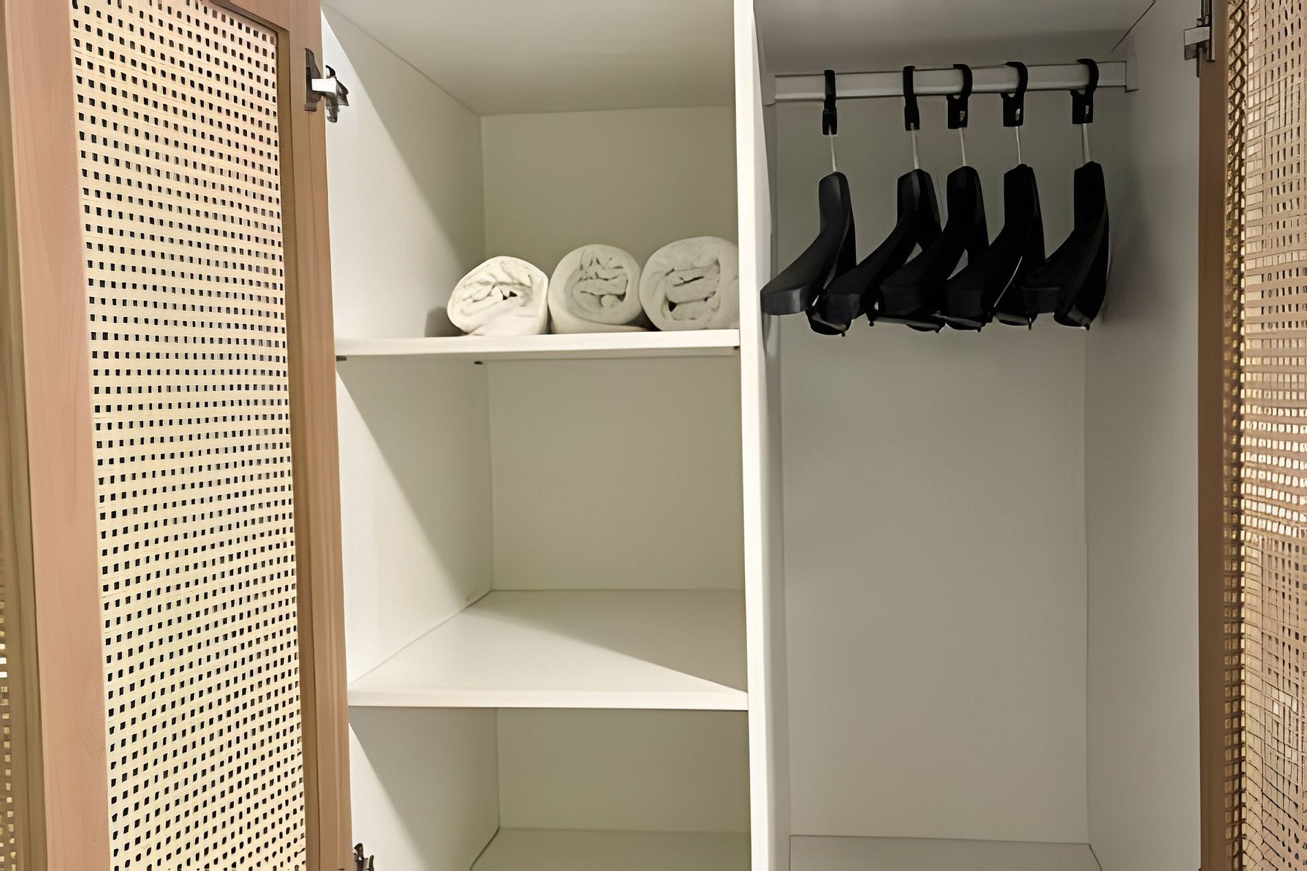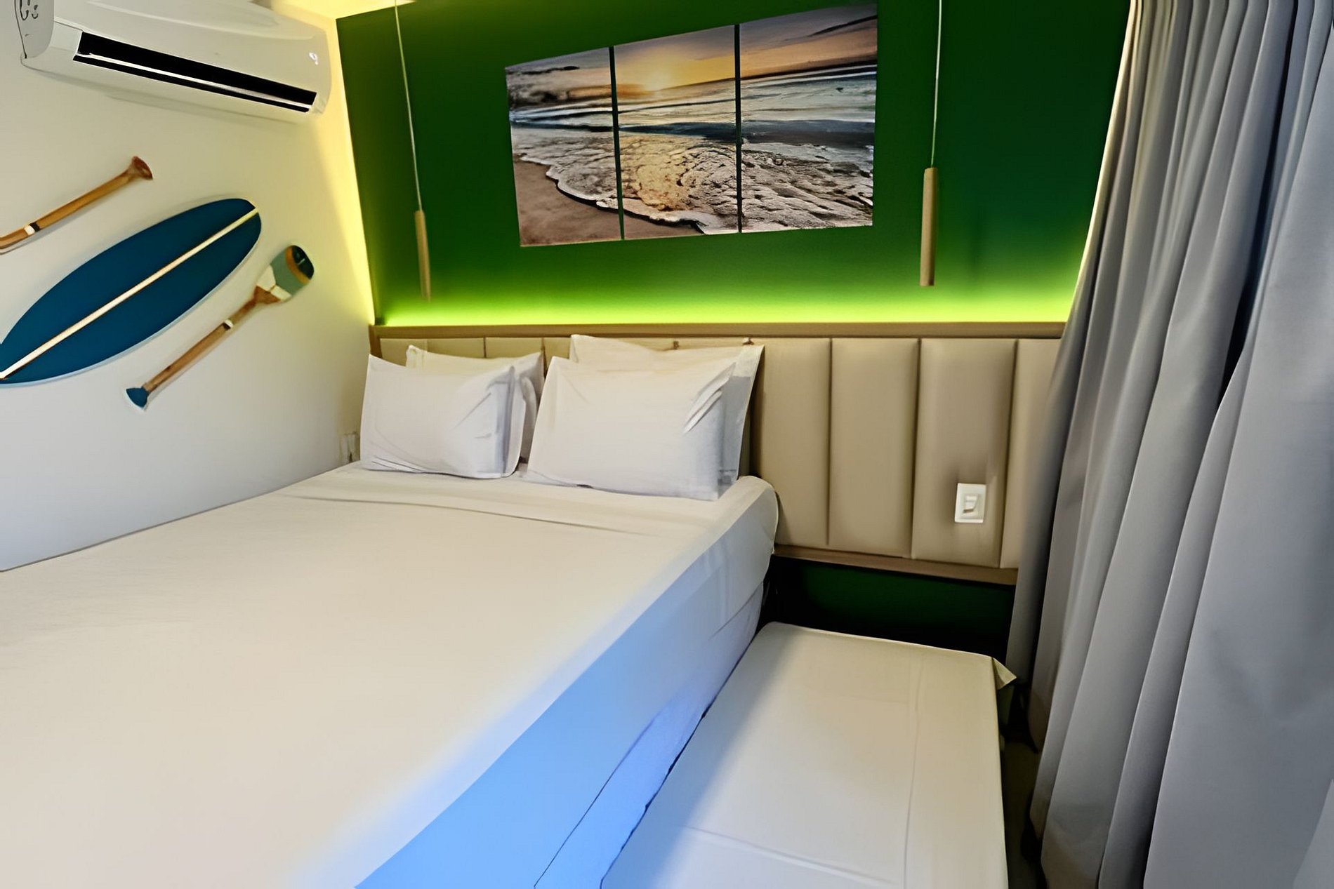 - Quarto com cama Queen e cama auxiliar acoplada, SmarTV, Guarda roupa com cabides e Ar condicionado;
