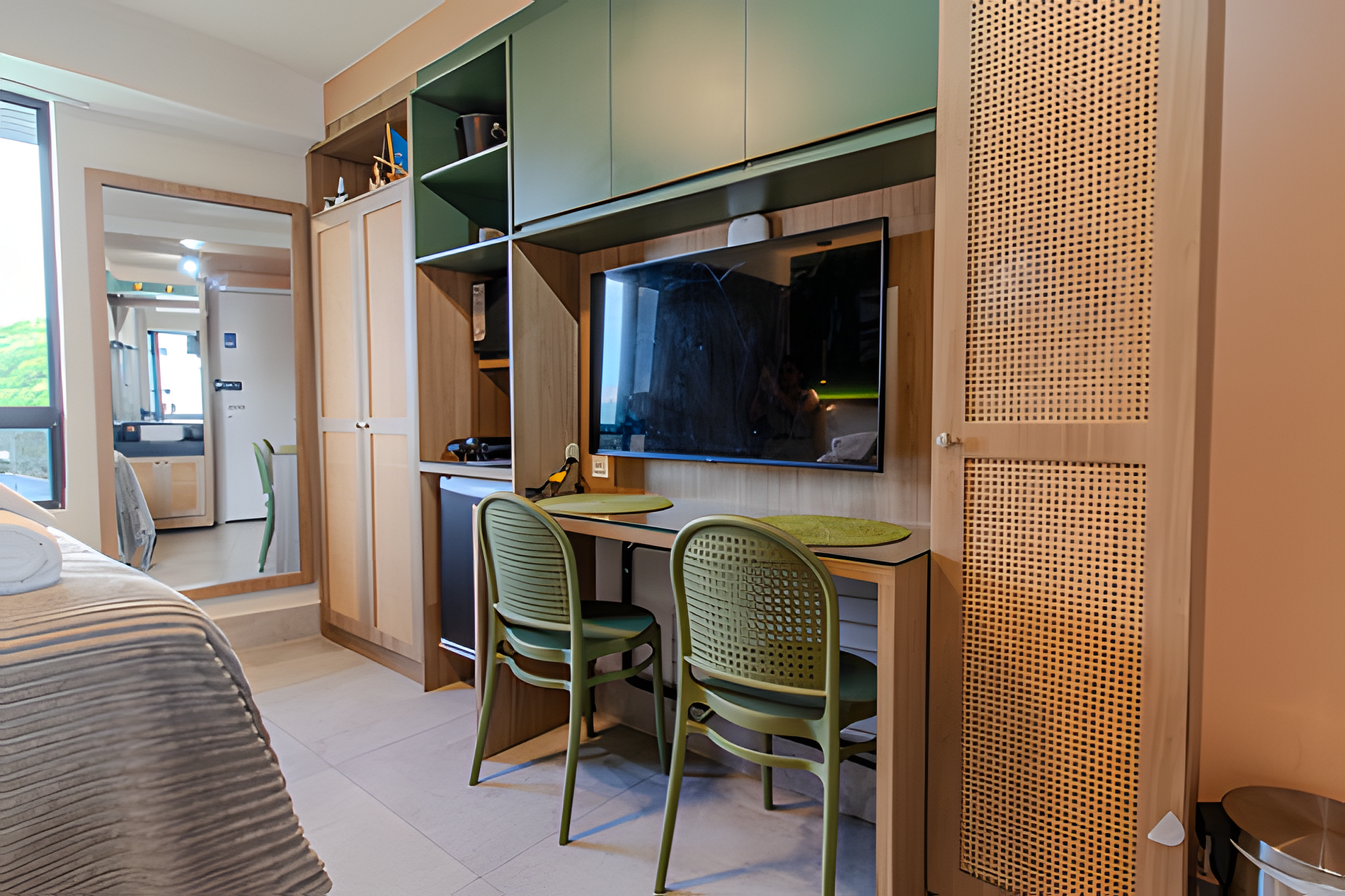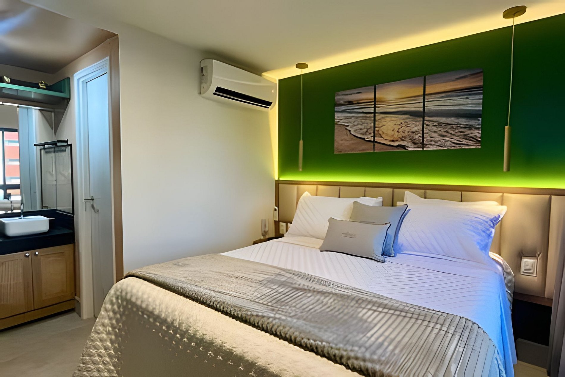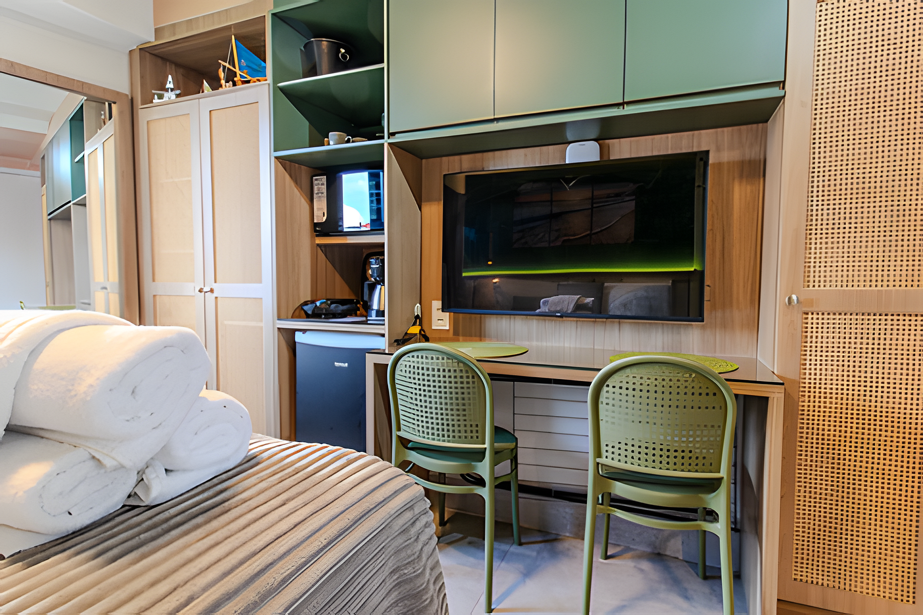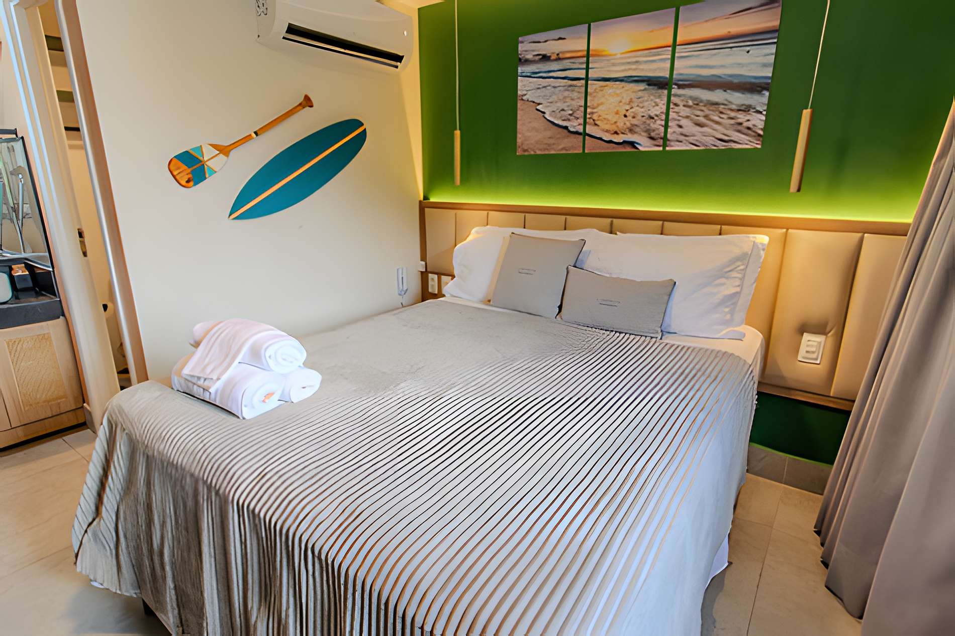 - Quarto com cama Queen e cama auxiliar acoplada, SmarTV, Guarda roupa com cabides e Ar condicionado;