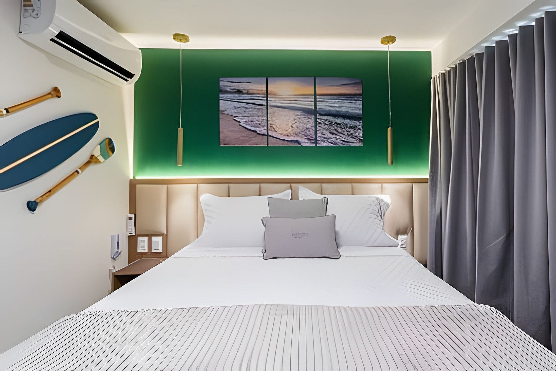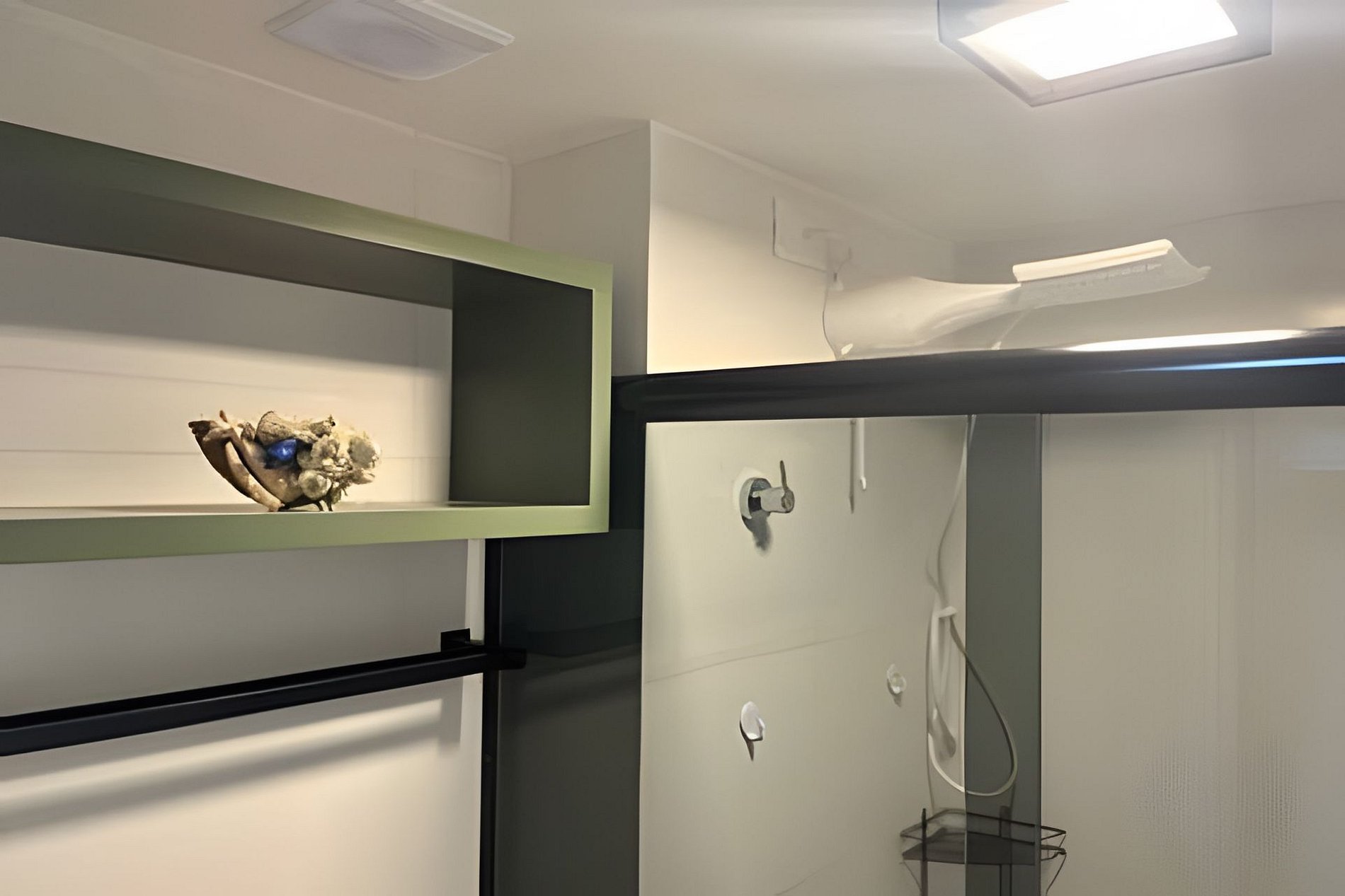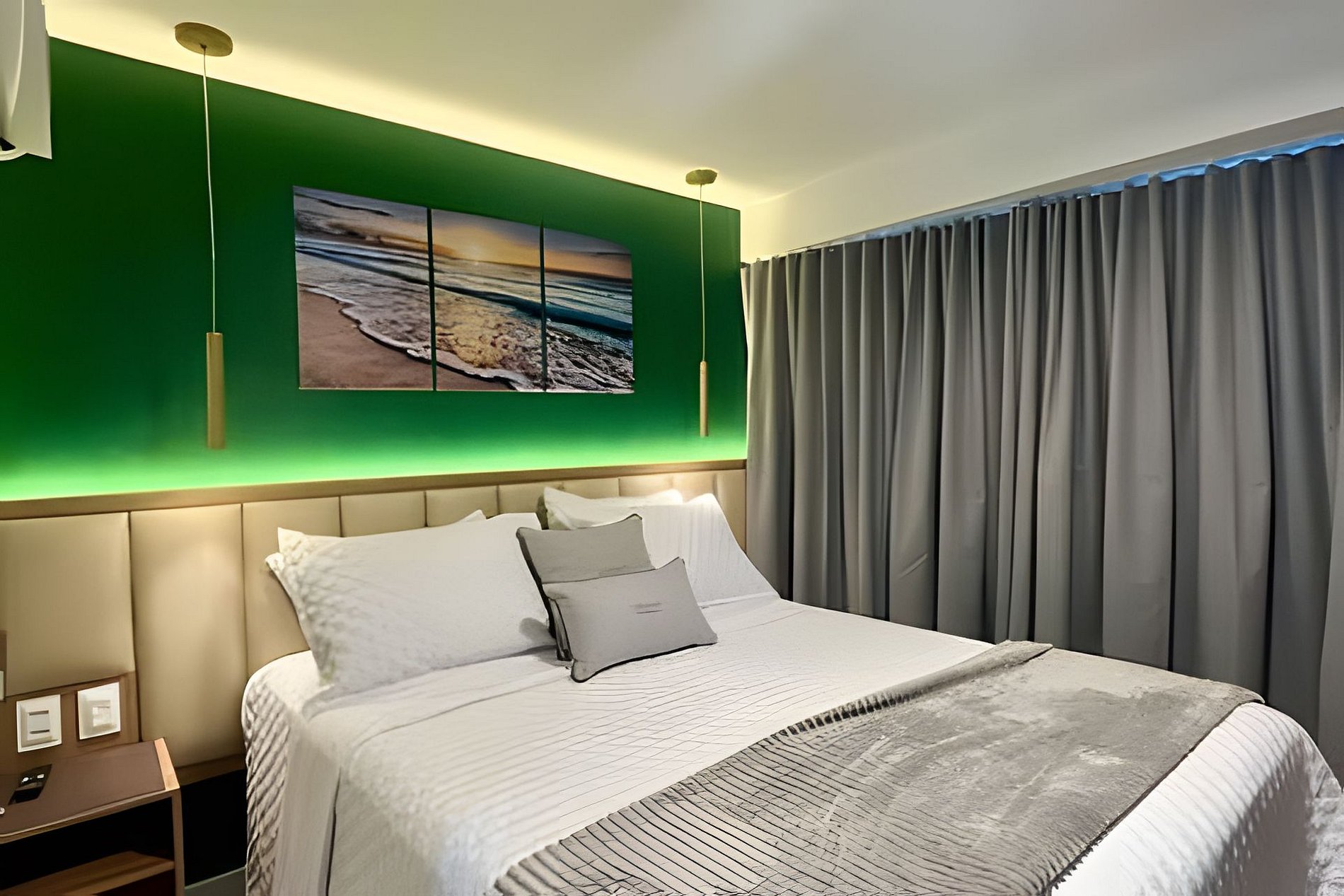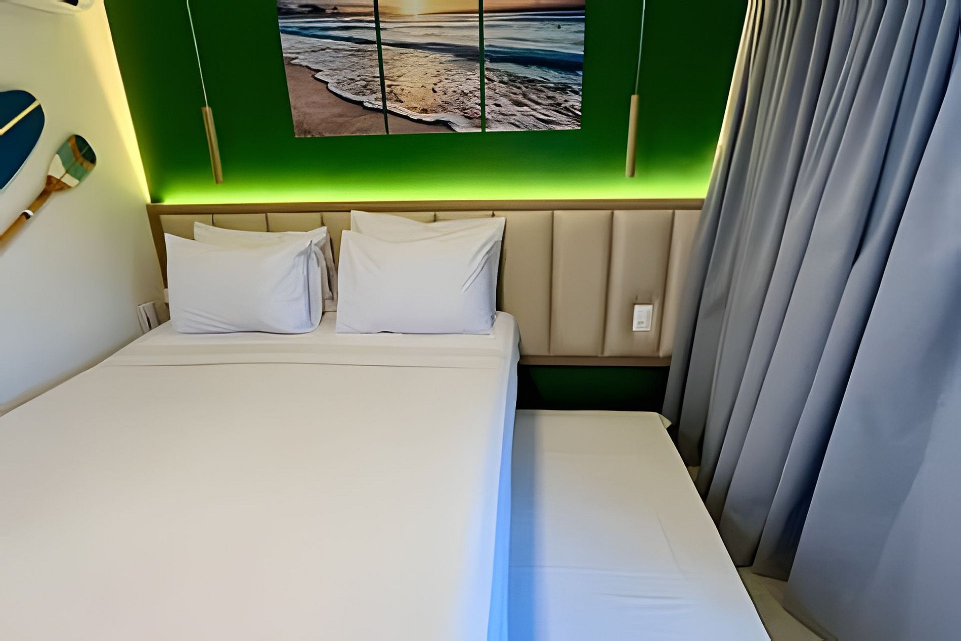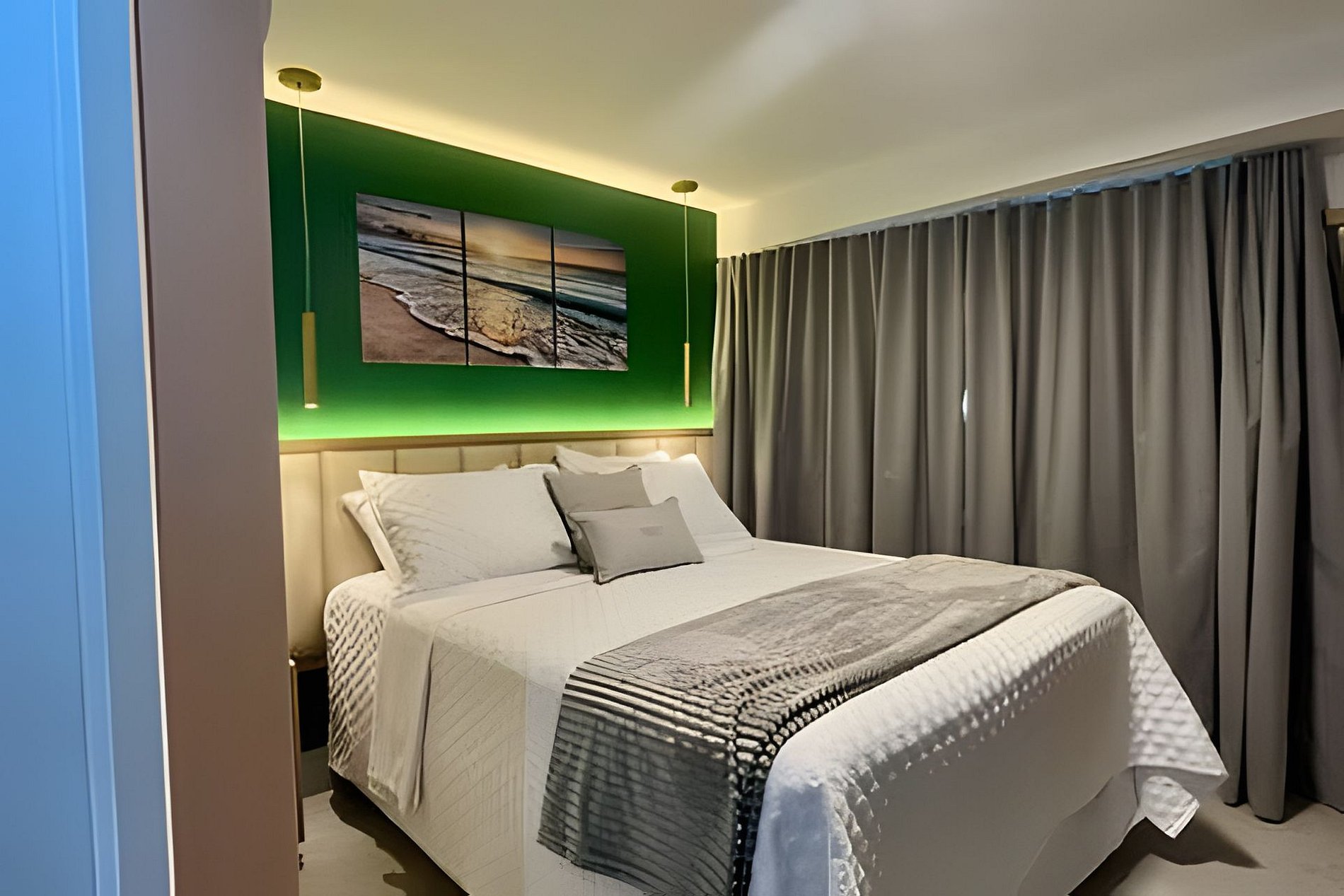 - Quarto com cama Queen e cama auxiliar acoplada, SmarTV, Guarda roupa com cabides e Ar condicionado;
