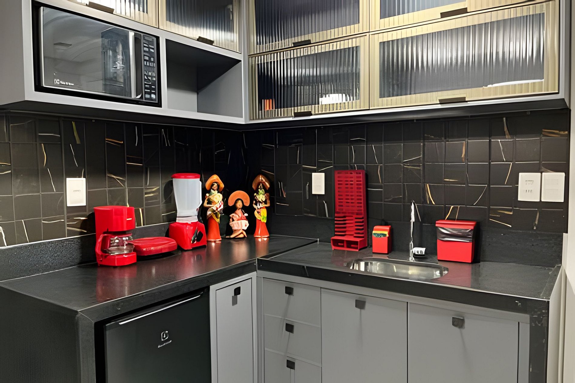 - Cozinha equipada com purificador de água , Frigobar, Micro-ondas, Cafeteira, Liquidificador e Sanduicheira. Além de utensílios básicos de cozinha como copos, xícaras, pratos e talheres.