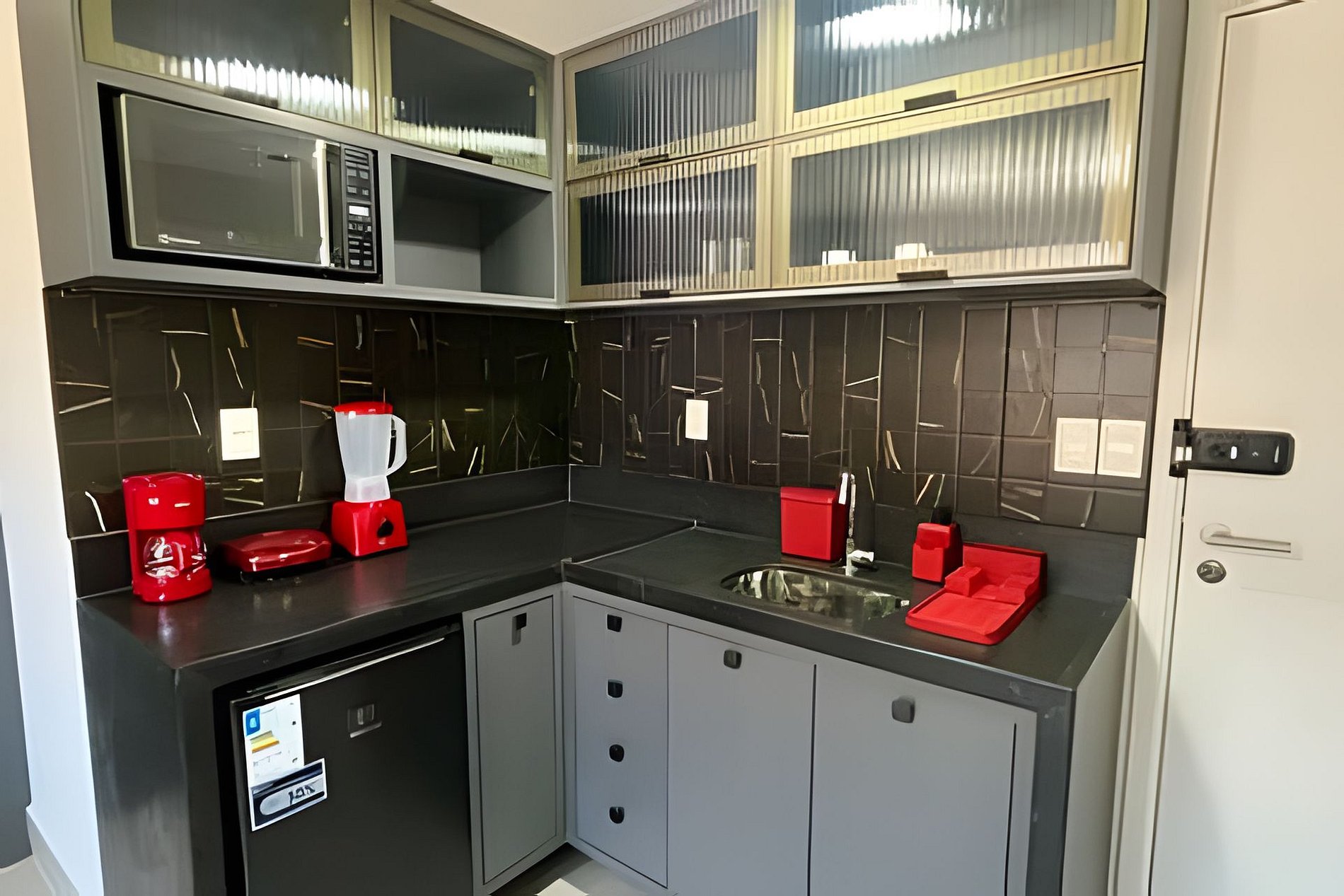- Cozinha equipada com purificador de água , Frigobar, Micro-ondas, Cafeteira, Liquidificador e Sanduicheira. Além de utensílios básicos de cozinha como copos, xícaras, pratos e talheres.