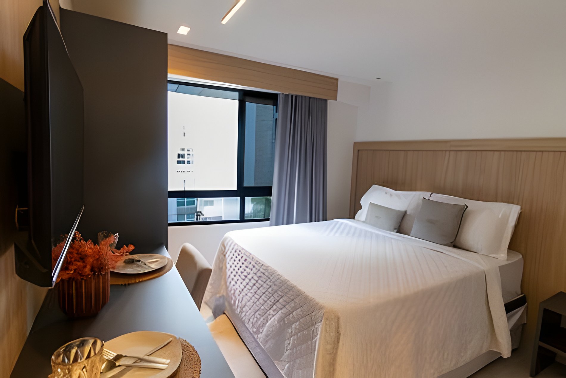 - Quarto com cama Queen, Espaço para guardar roupas, Mesa com 2 lugares, SmarTV e Ar condicionado;