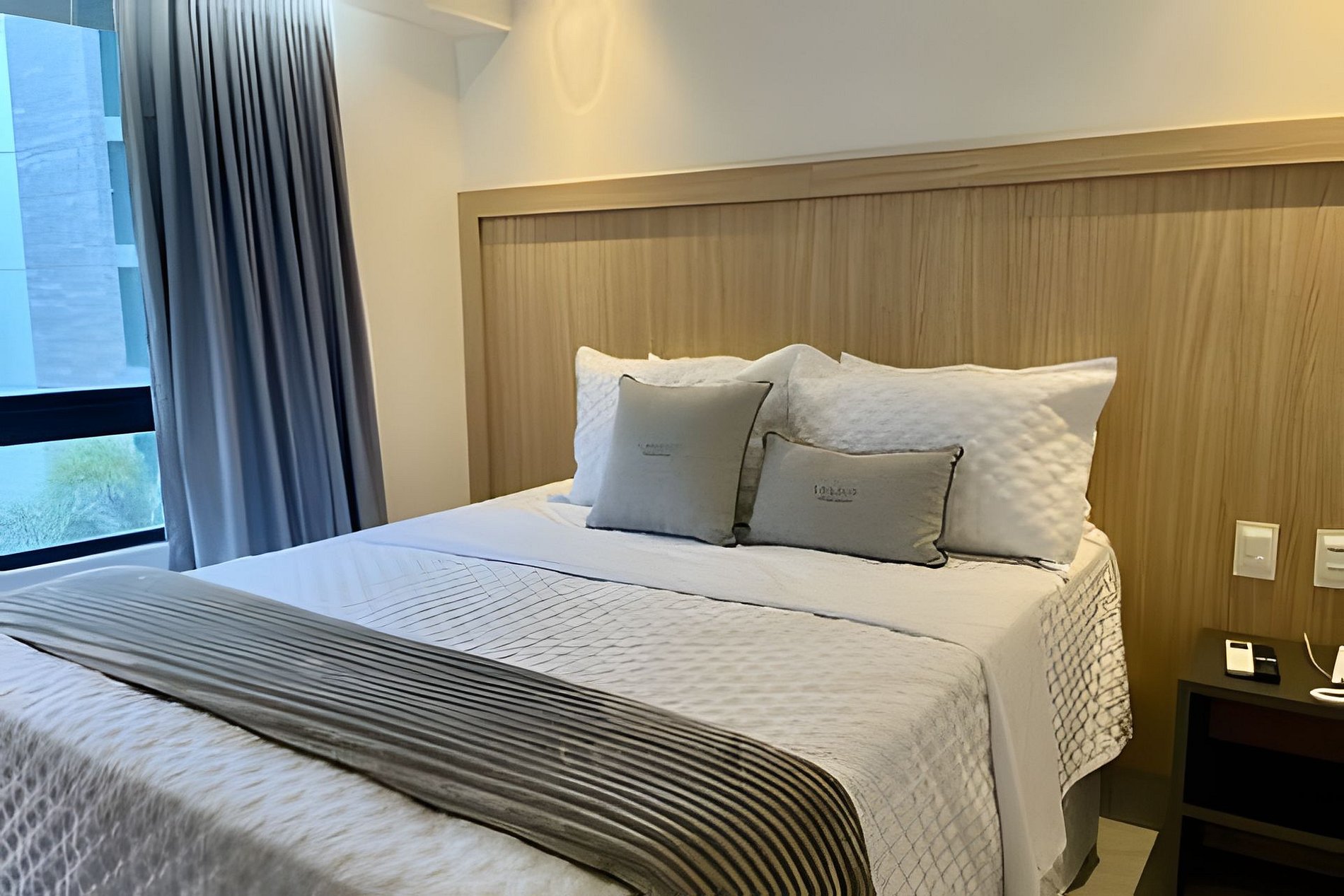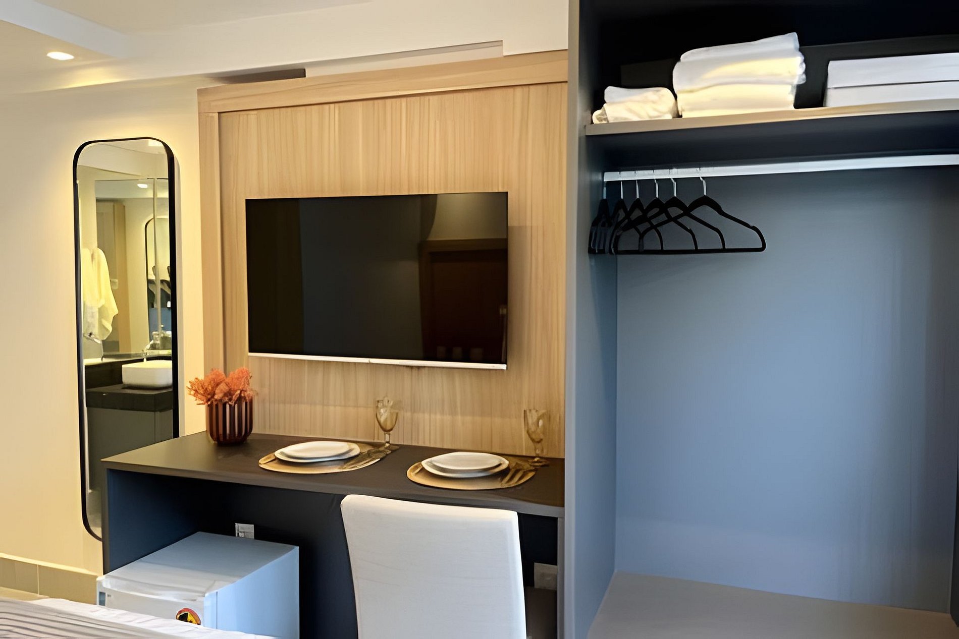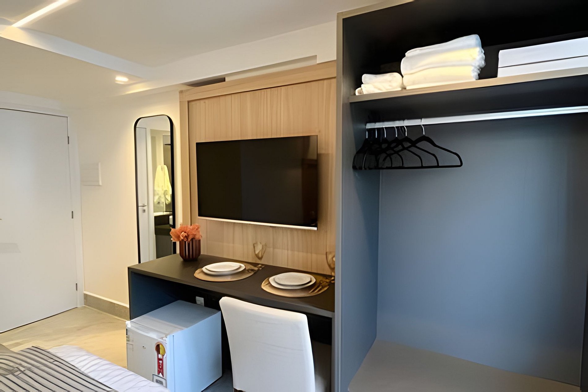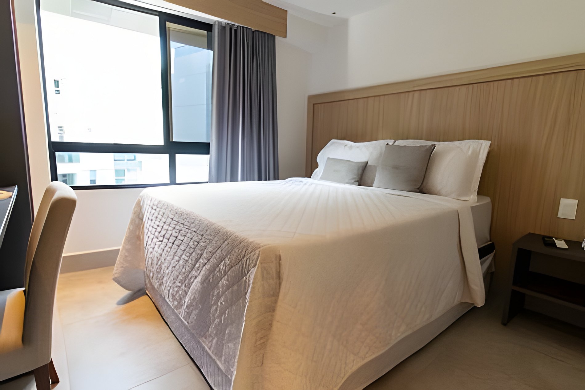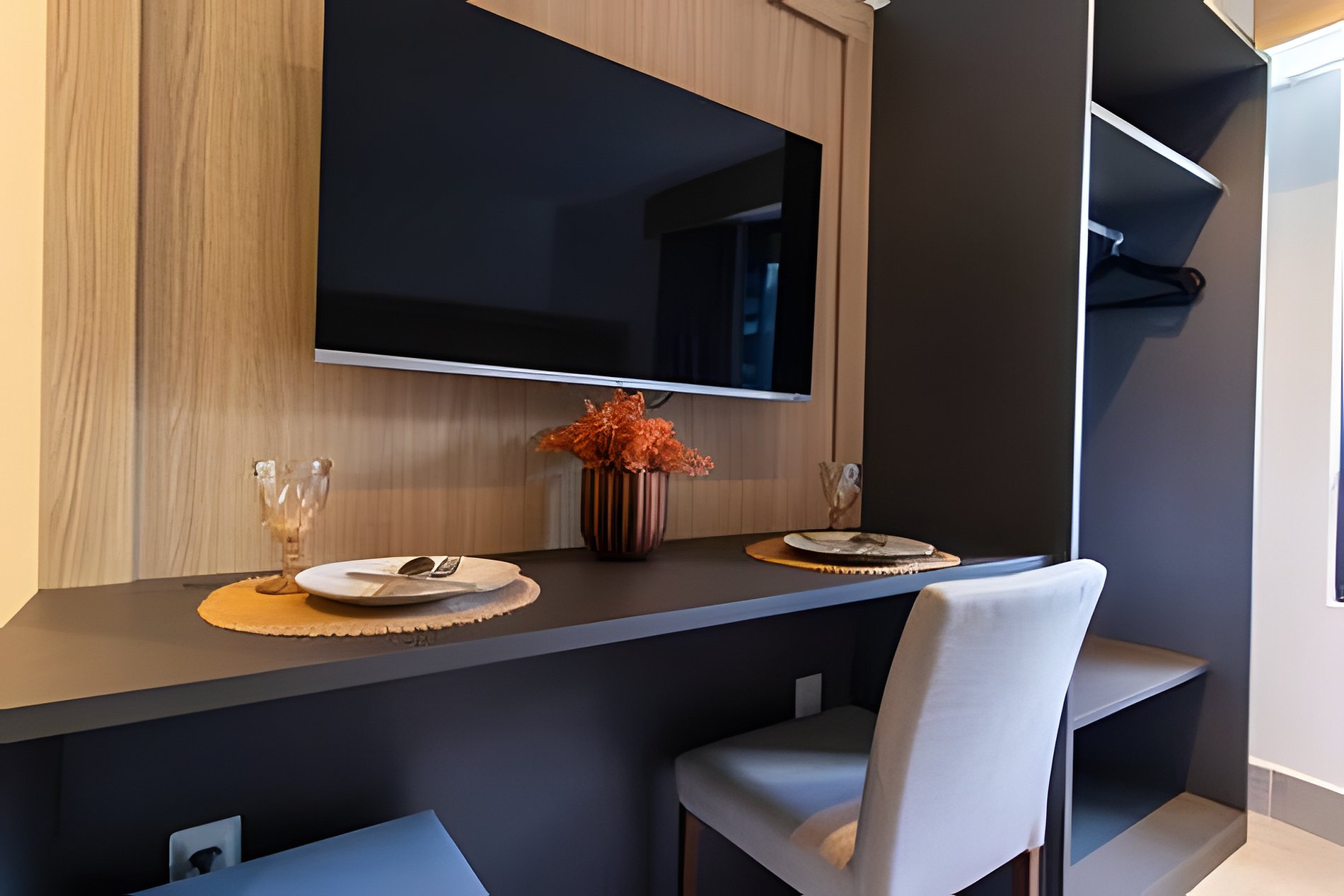 - Quarto com cama Queen, Espaço para guardar roupas, Mesa com 2 lugares, SmarTV e Ar condicionado;