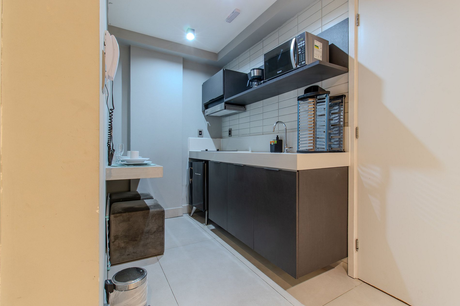 - Cozinha completa com Frigobar, Microondas, Cooktop, Cafeteira e Sanduicheira. Além de utensílios domésticos como pratos, copos, xícaras, talheres, jogo de panelas básico; (No item comodidade não dispomos de óleo, tigelas, vasilhas, pimenta e Hashi).