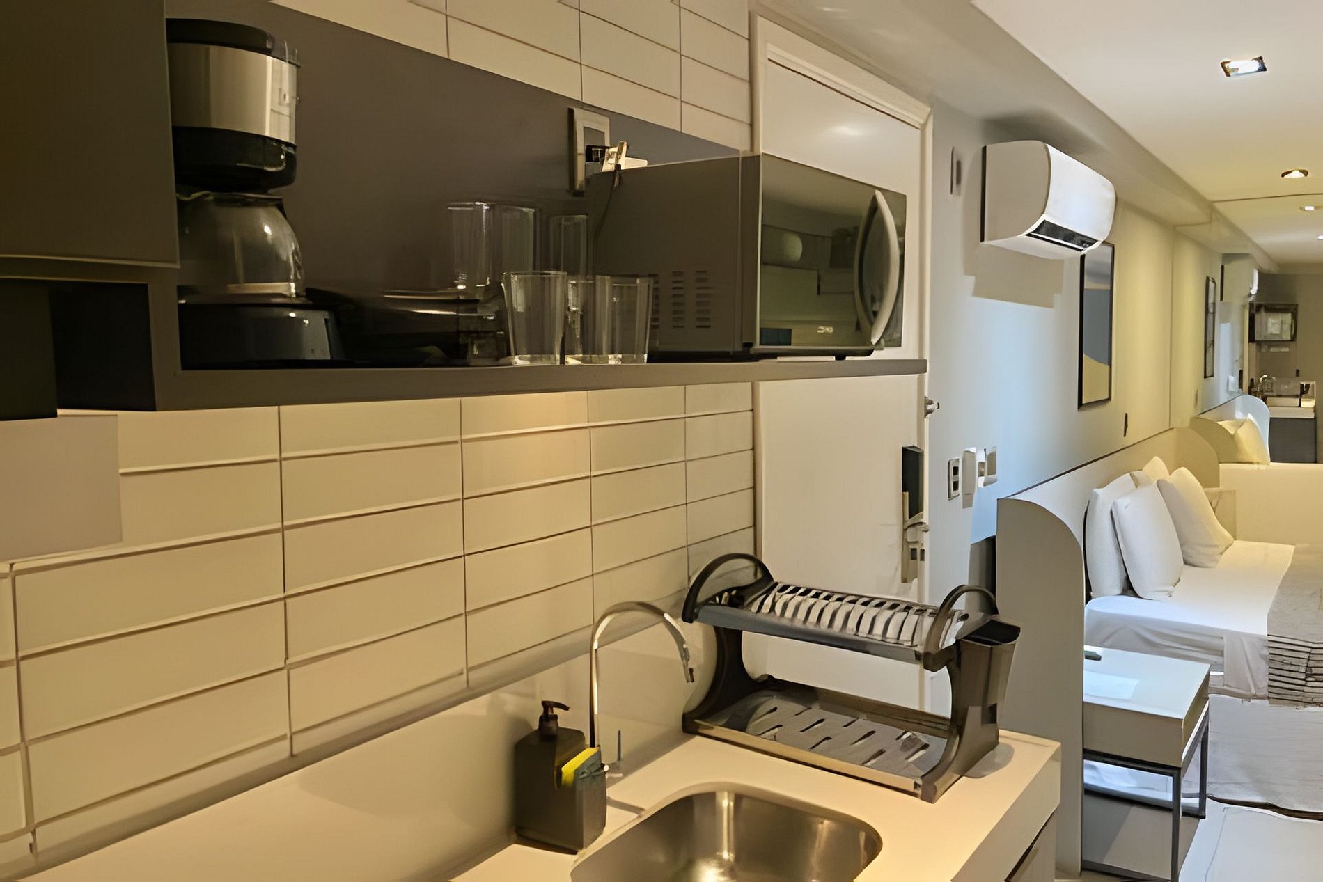- Cozinha completa com Frigobar, Microondas, Cooktop, Cafeteira e Sanduicheira. Além de utensílios domésticos como pratos, copos, xícaras, talheres, jogo de panelas básico; (No item comodidade não dispomos de óleo, tigelas, vasilhas, pimenta e Hashi).