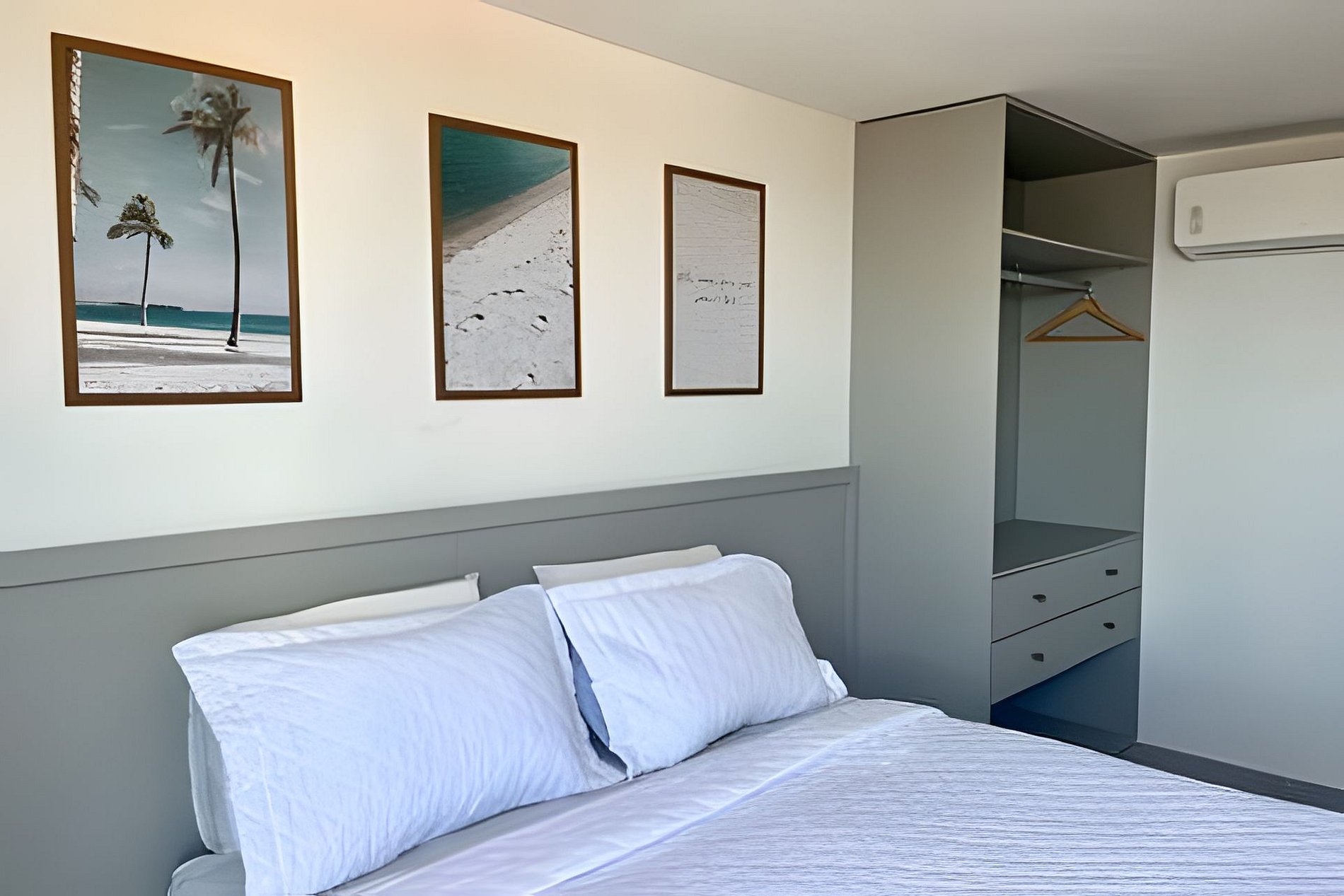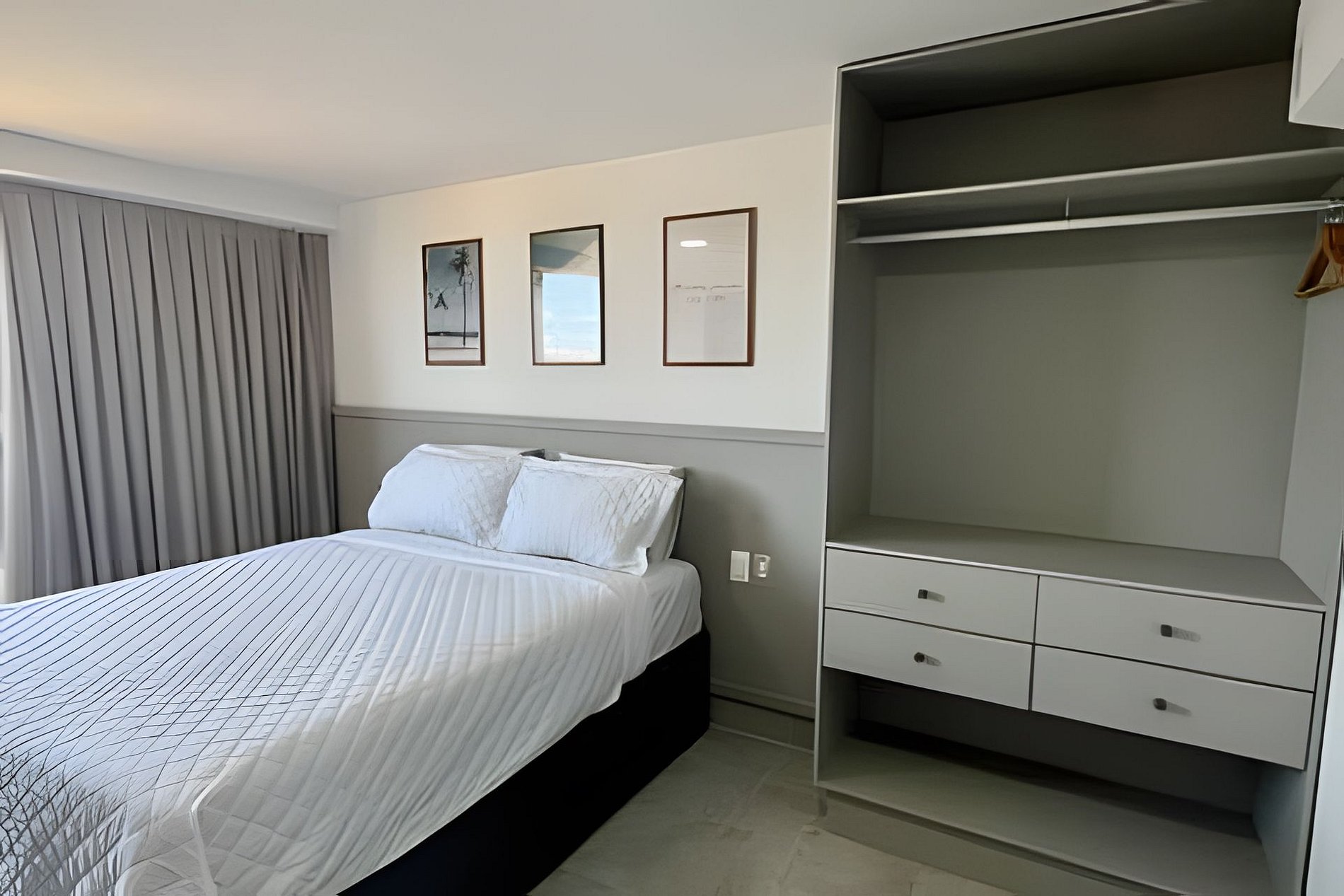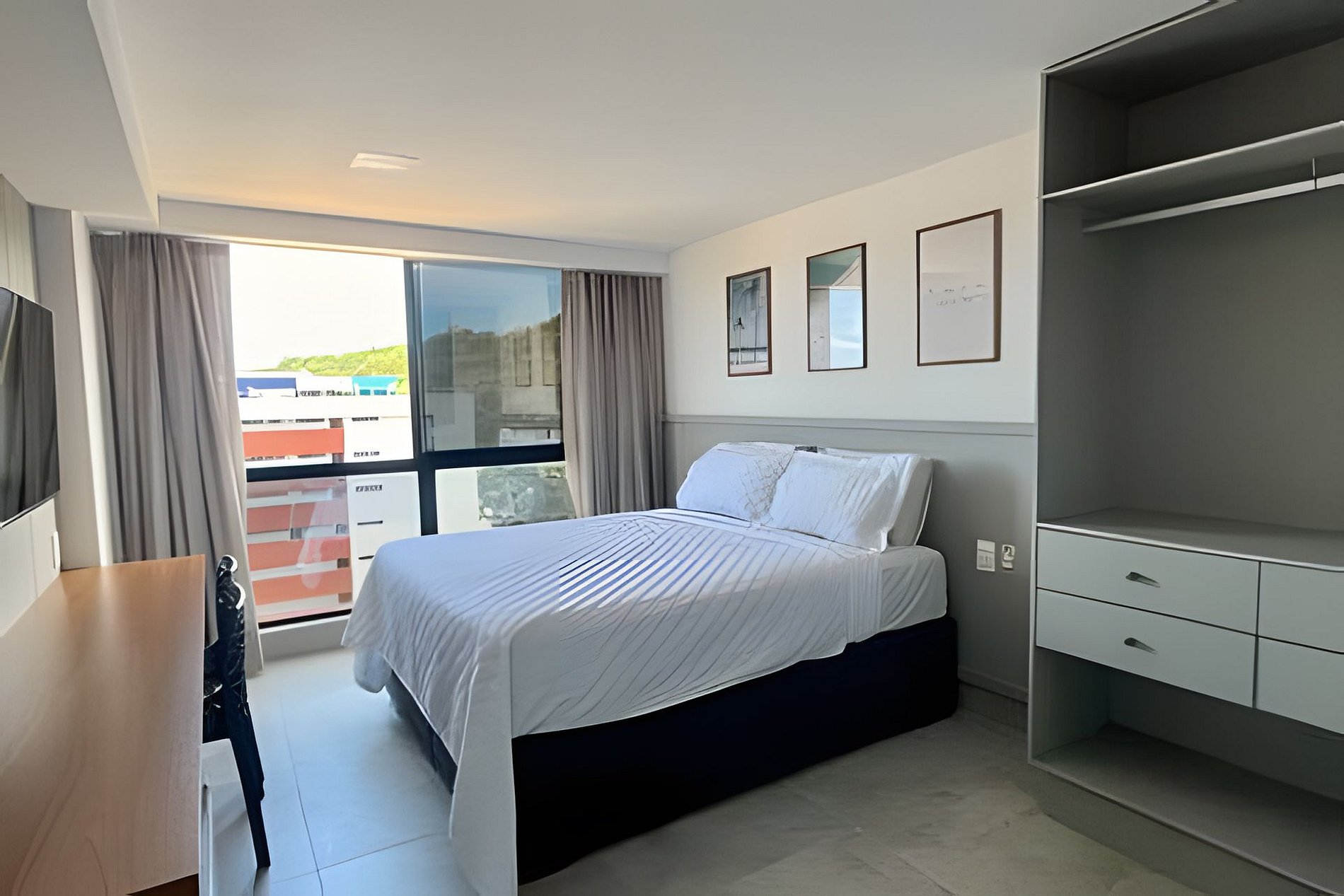 - Quarto com cama Queen e 1 colchão de solteiro, Smart TV, Espaço para guardar roupas e Ar Condicionado;