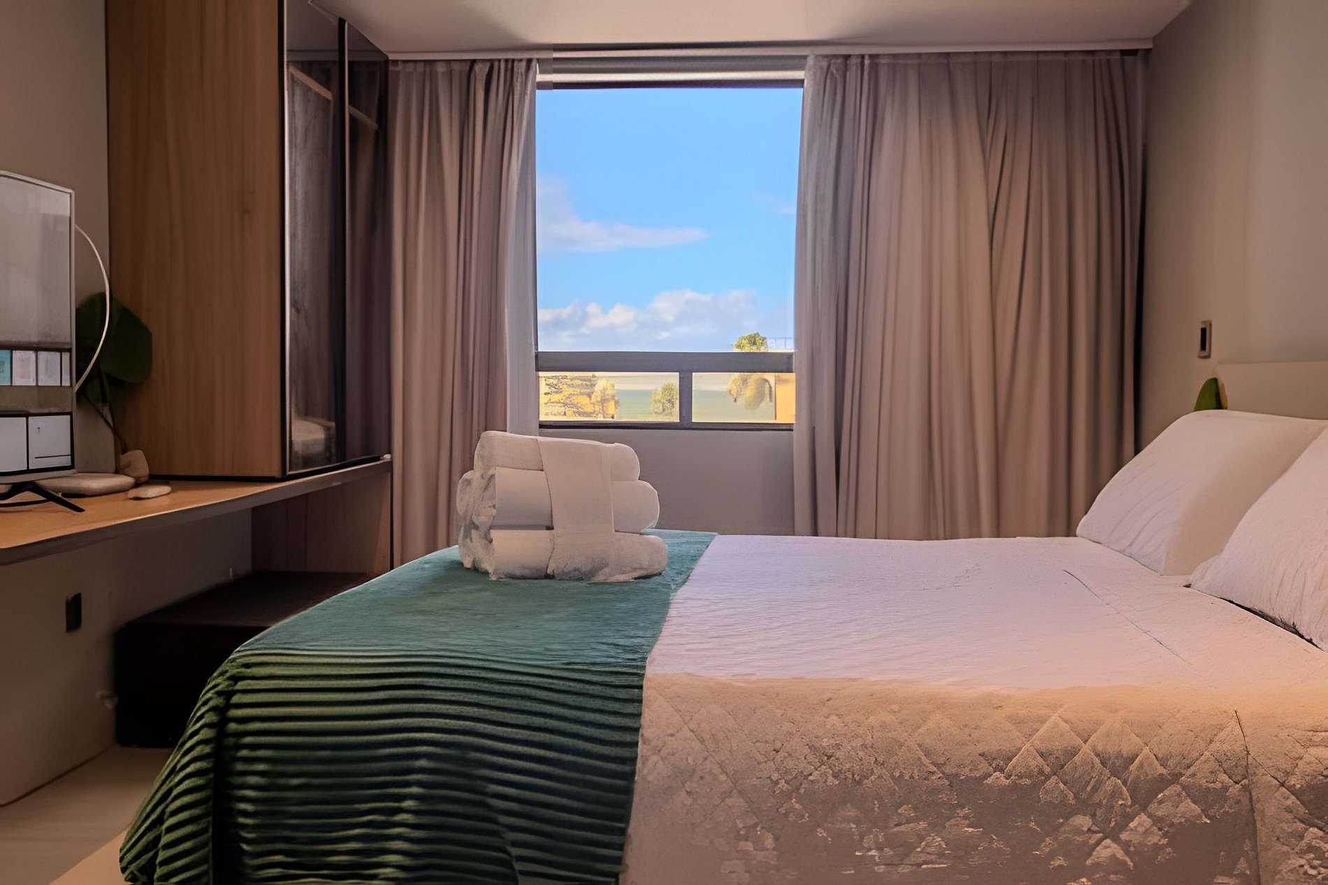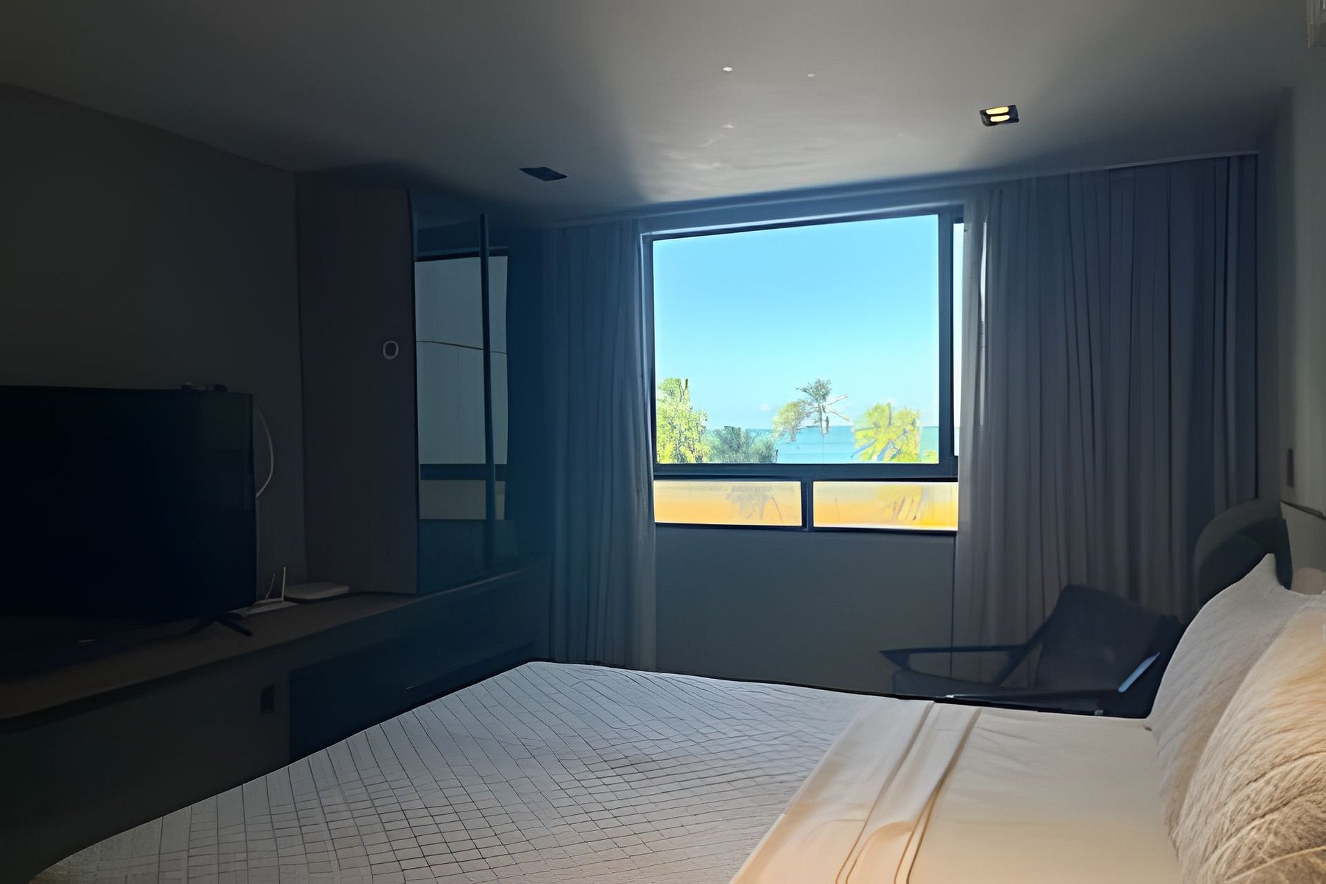 - Suíte com cama tamanho Queen, SmarTV, Ar condicionado, Guarda roupa e vista mar;