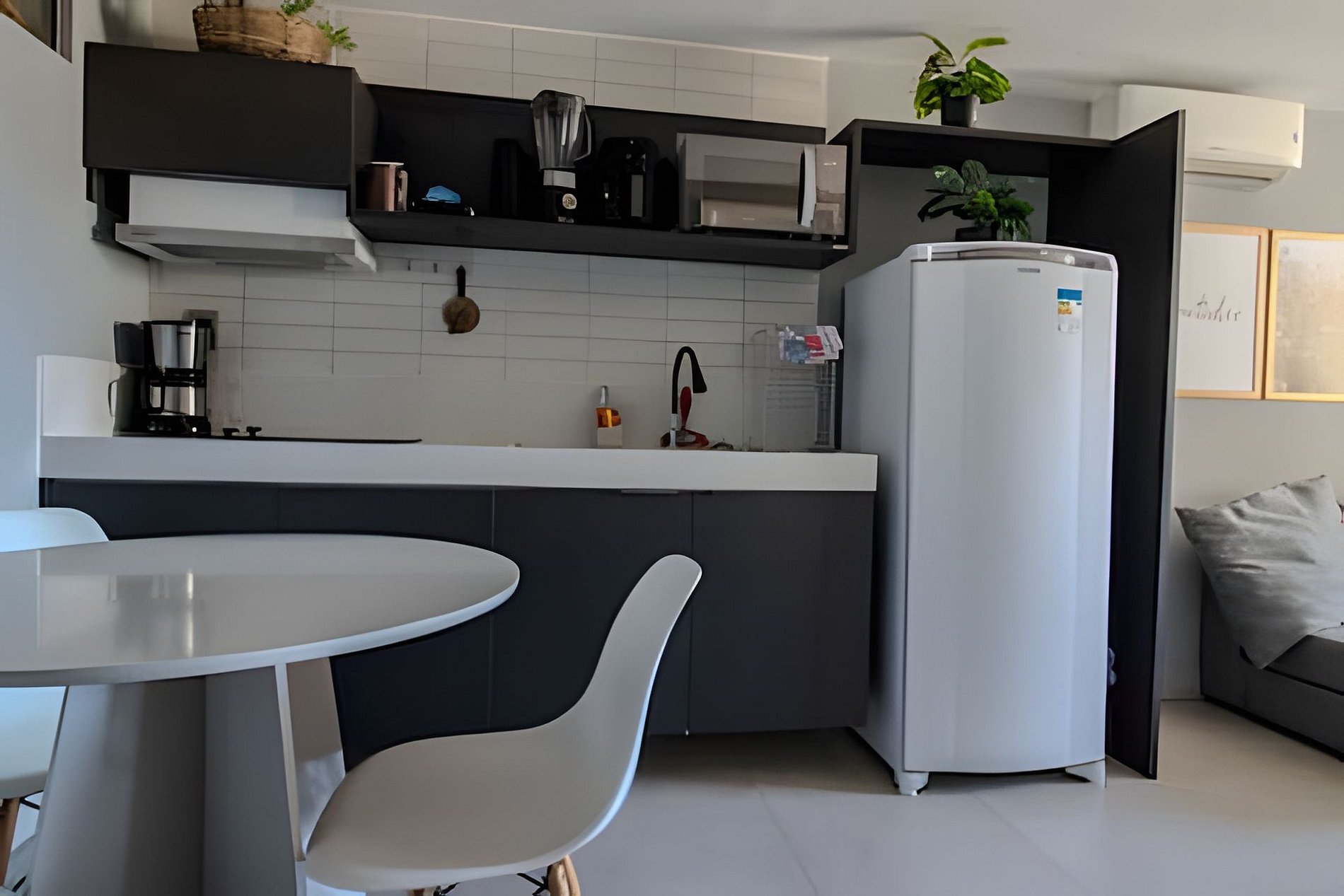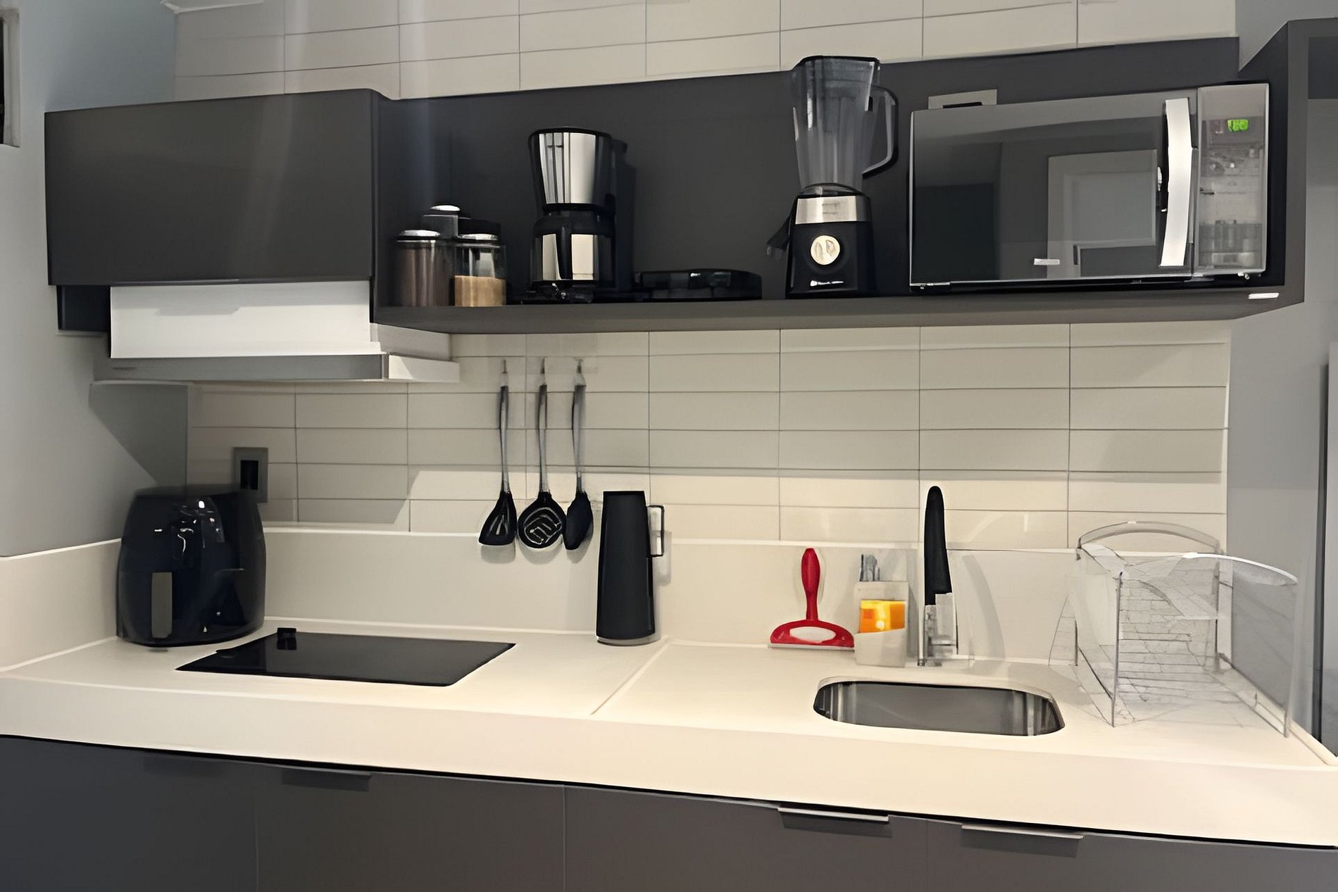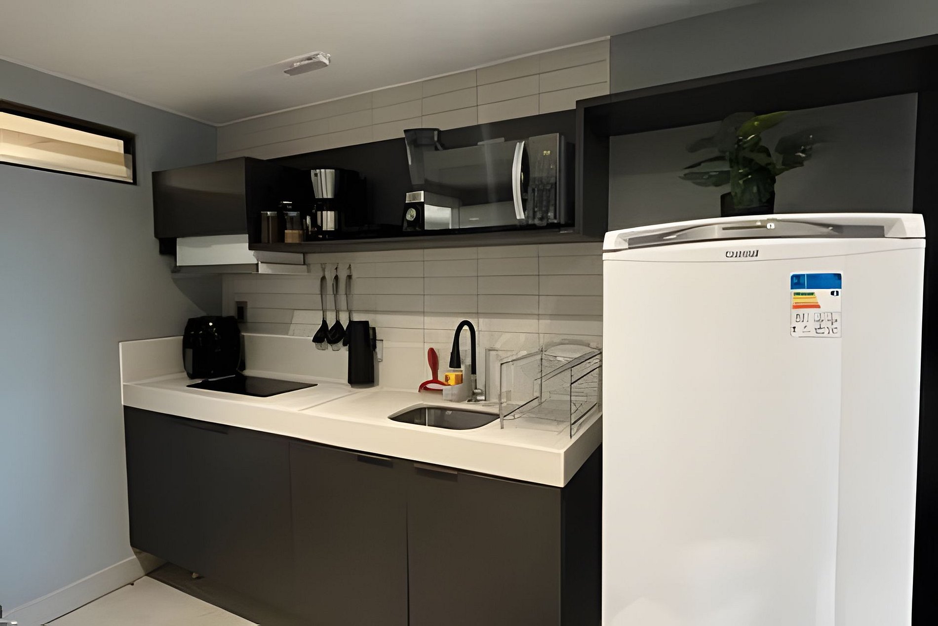 - Cozinha completa com Microondas, Cooktop 2 bocas, Geladeira, Cafeteira, Liquidificador e Sanduicheira. Além de utensílios domésticos como pratos, copos, xícaras, talheres, jogo de panelas básico; (No item comodidade não dispomos de óleo, tigelas, vasilhas, pimenta e Hashi).