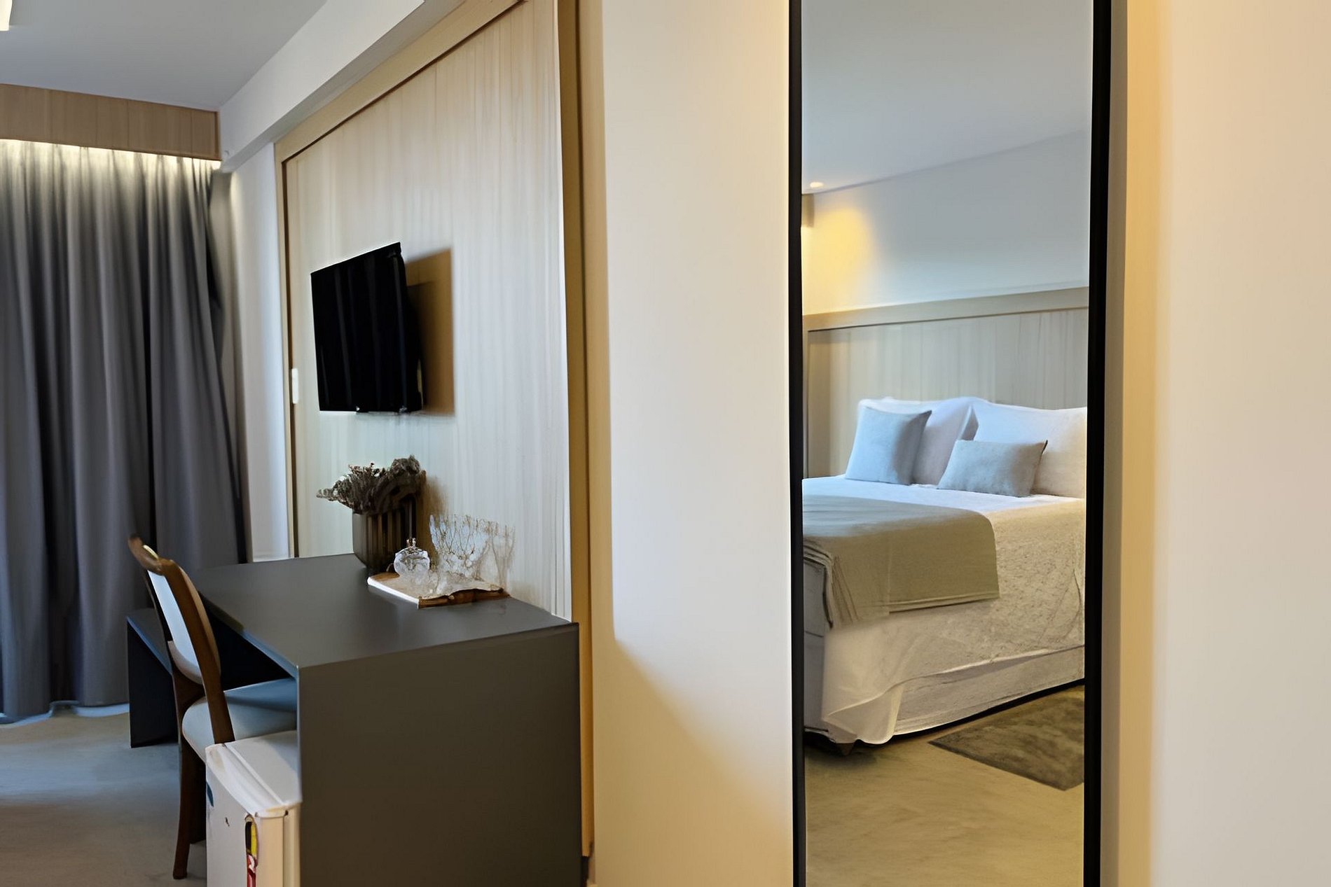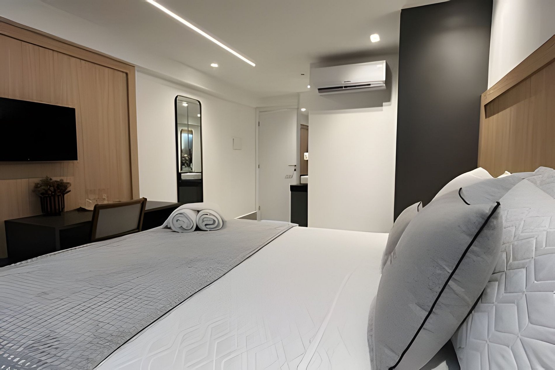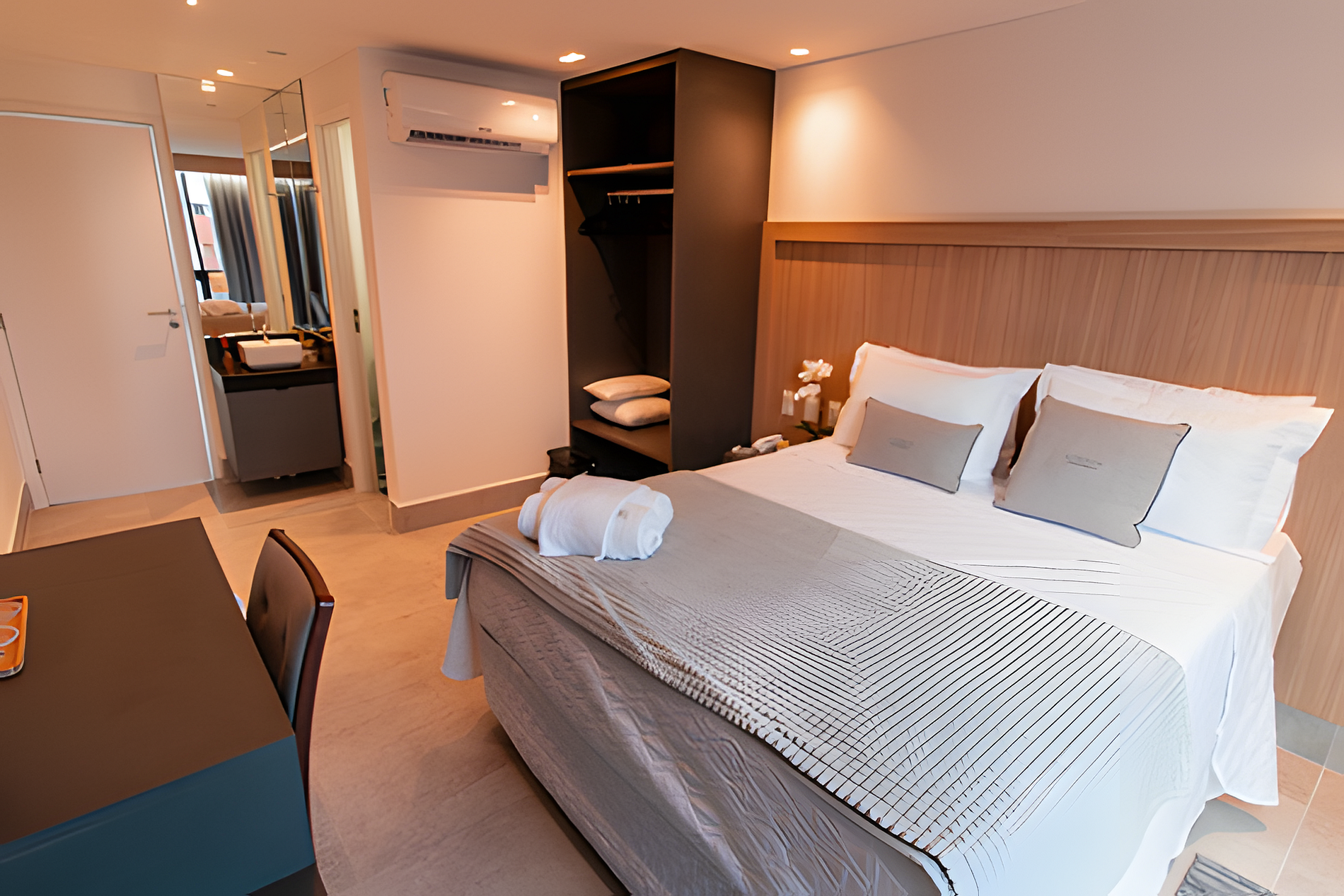 - Quarto com cama Queen, Espelho, Espaço para guardar roupas, Ar-condicionado, SmarTV e mesa com 1 lugar;