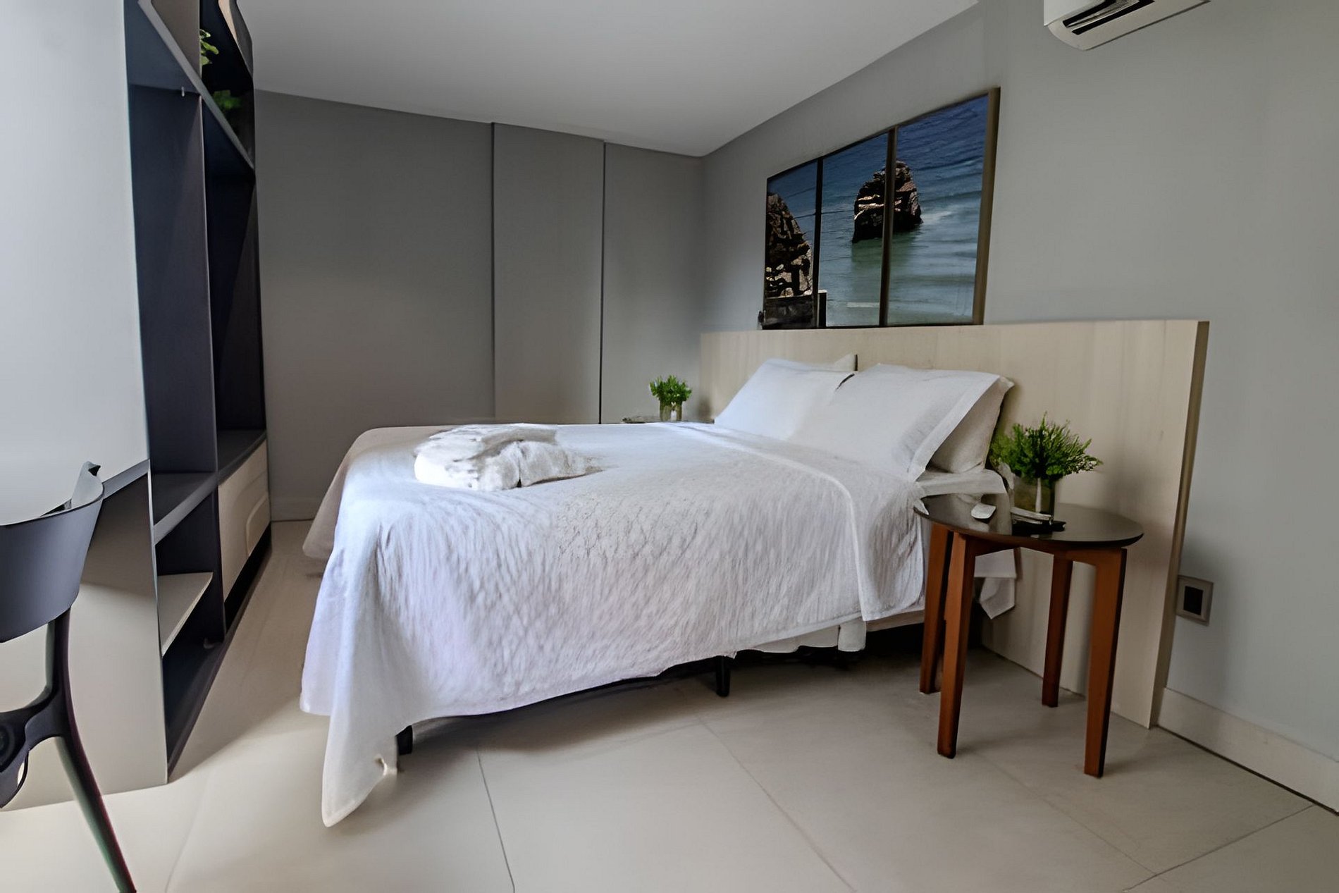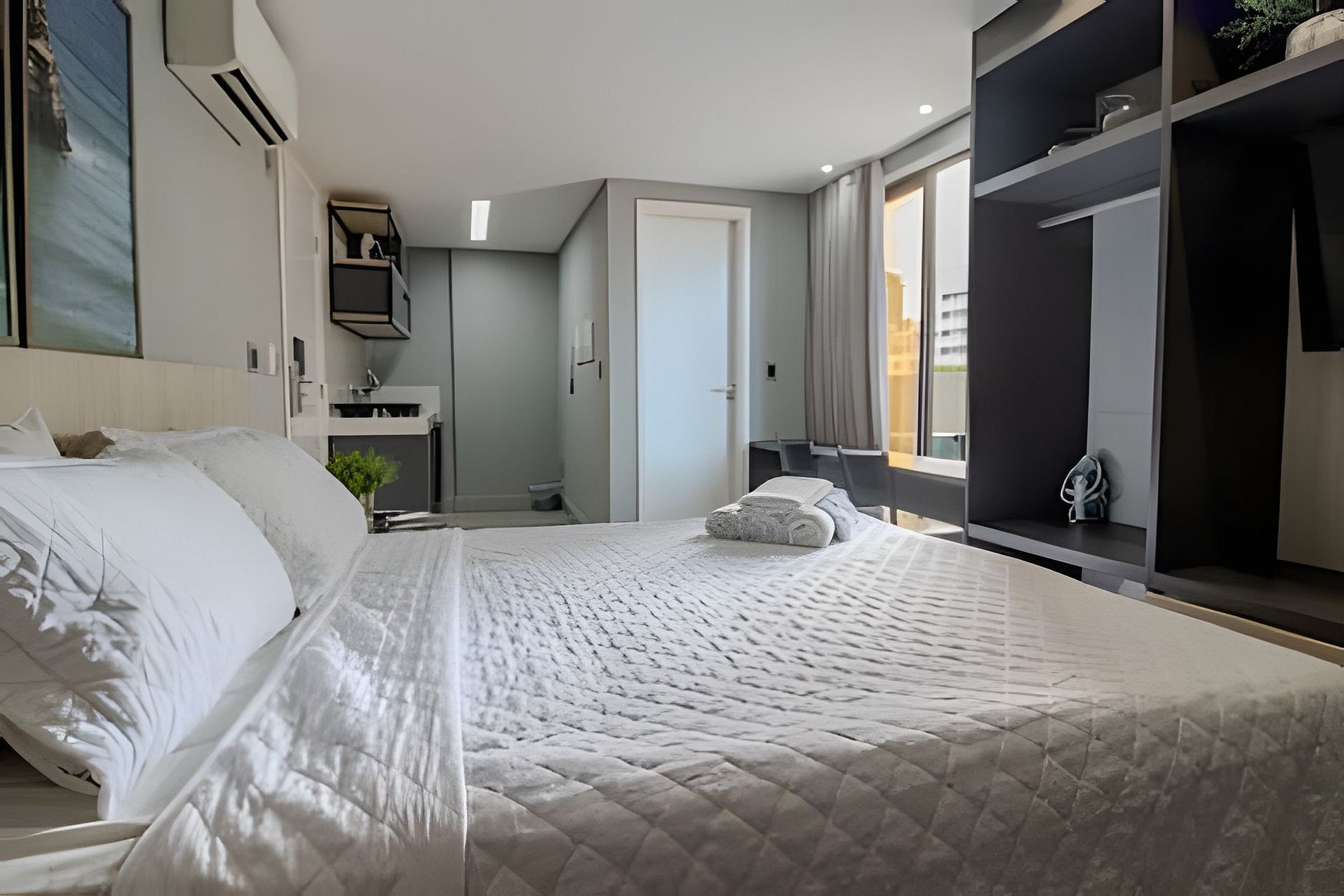 - Quarto com cama casal, SmarTV, TV a Cabo, Espaço para guardar roupas e Ar condicionado;