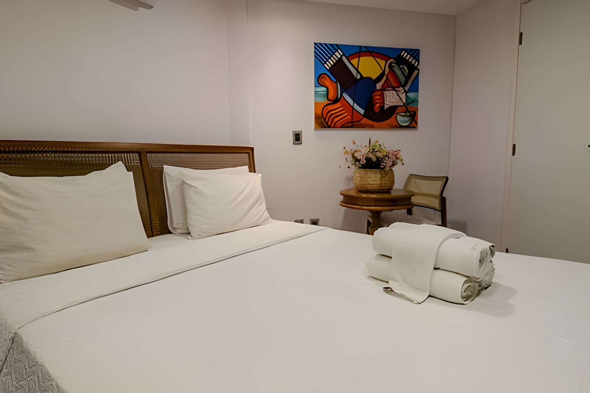 - Suíte com cama tamanho Queen, SmarTV, Ar condicionado, Closet e mesa redonda com 4 lugares;