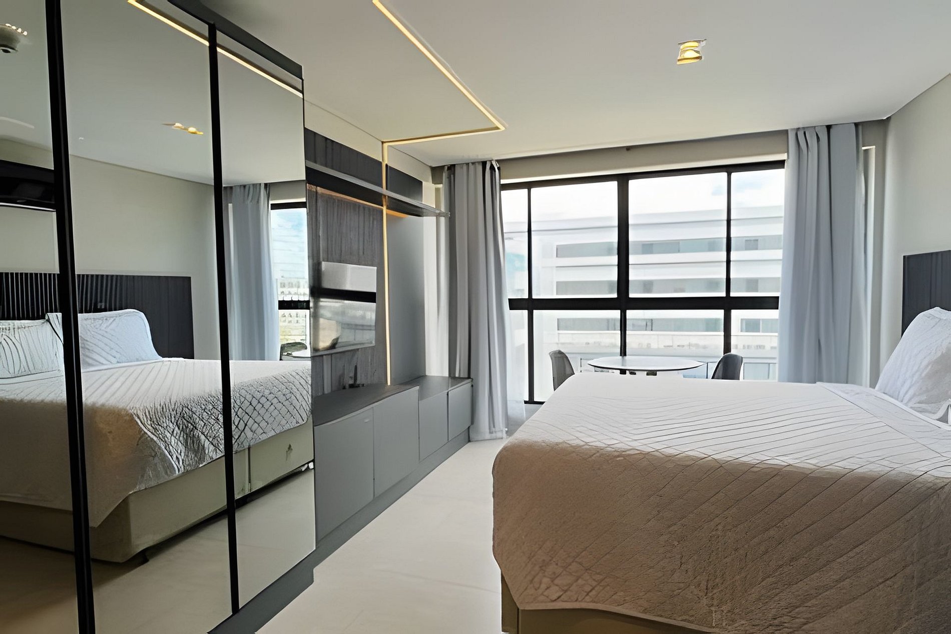 - Quarto com cama Queen e 2 camas de solteiro acopladas, Guarda-roupa, SmartTV e Ar condicionado;