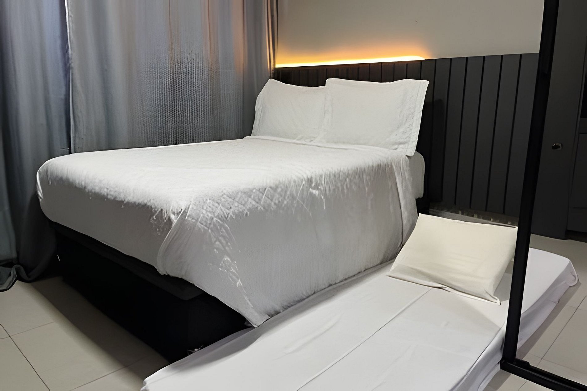 - Enxoval de cama incluso (travesseiros, fronhas, lençóis, manta)