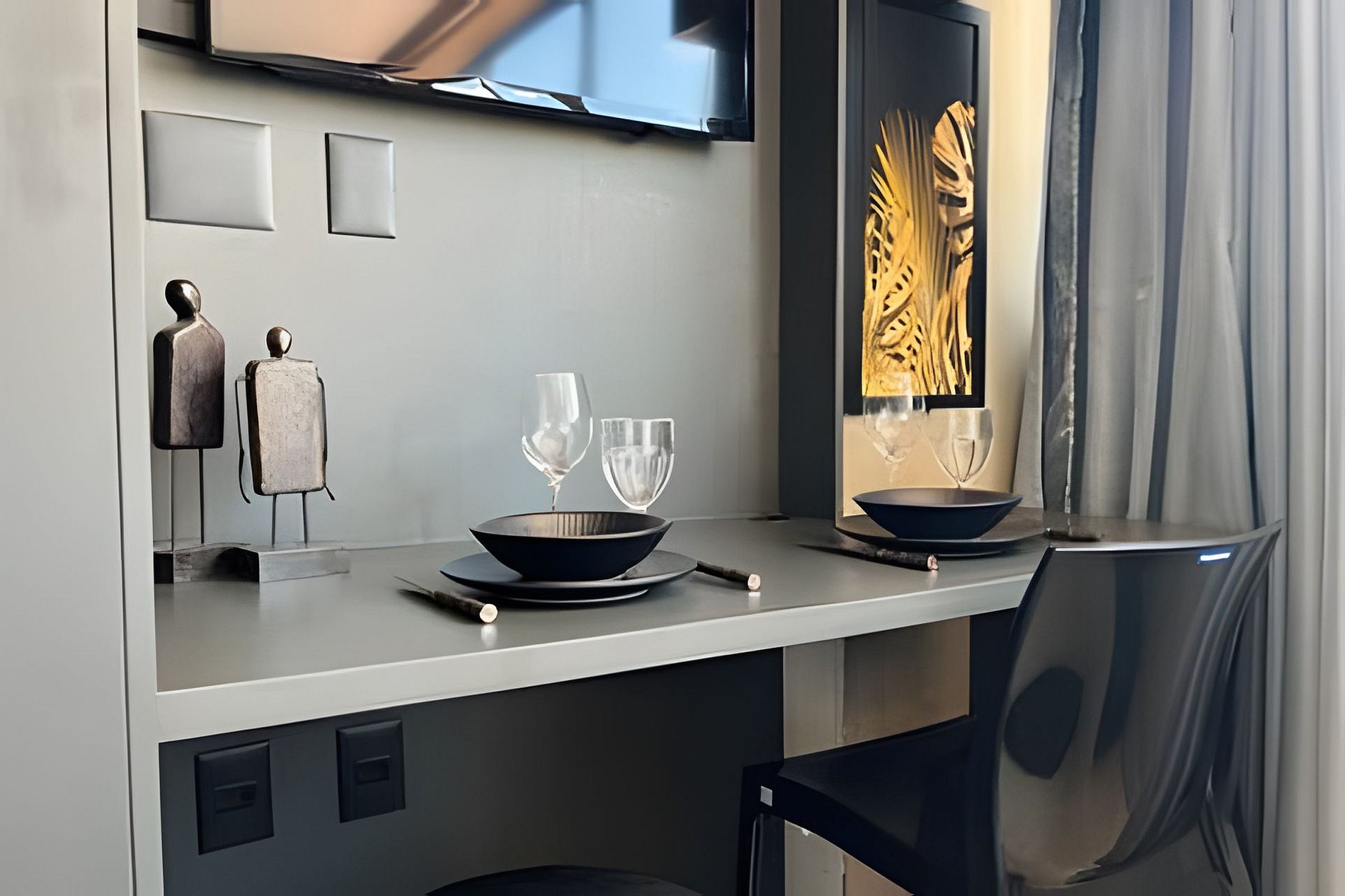 - Utensílios básicos (copos, xícaras, taças, pratos, talheres, jogo de panelas básico e utensílios de cozinha)