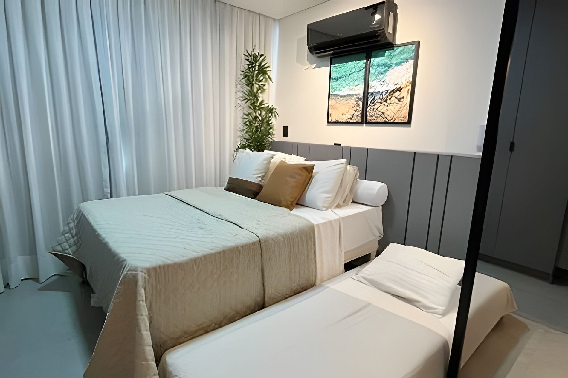 - Quarto com cama Queen e 1 cama de solteiro acoplada, Guarda-roupa, SmarTV, Ar-condicionado e Mesa com 2 lugares;