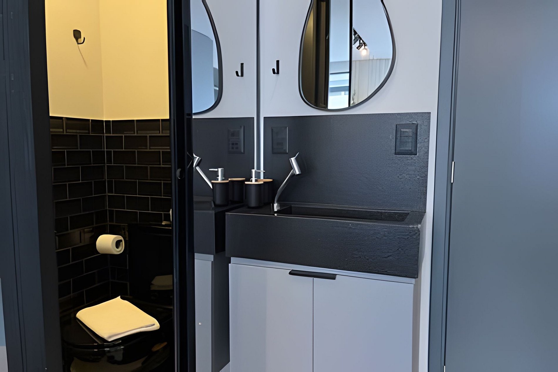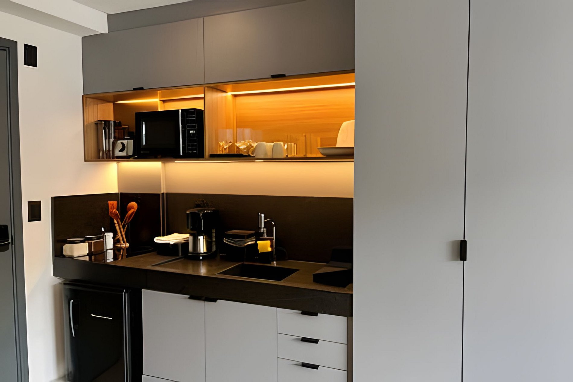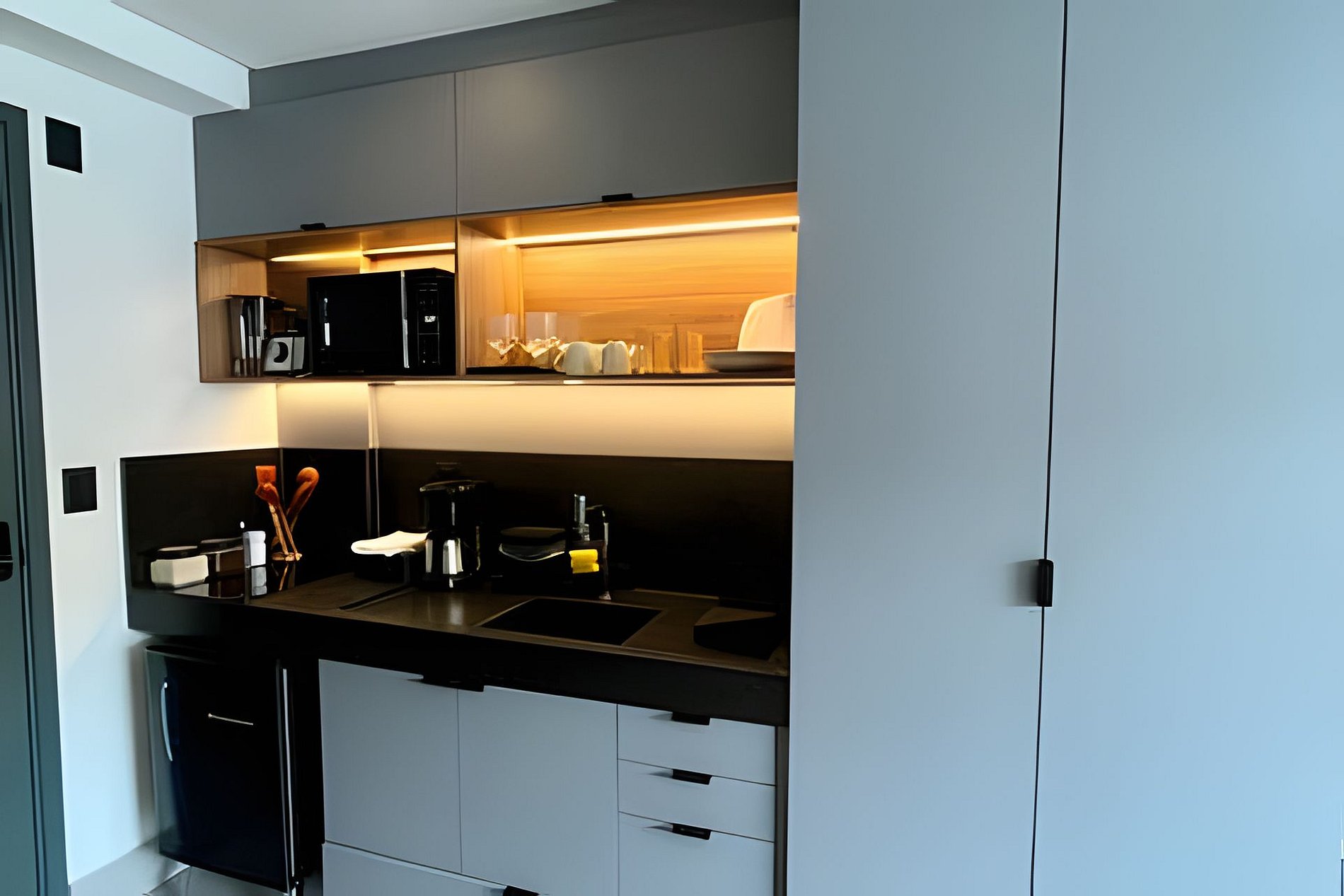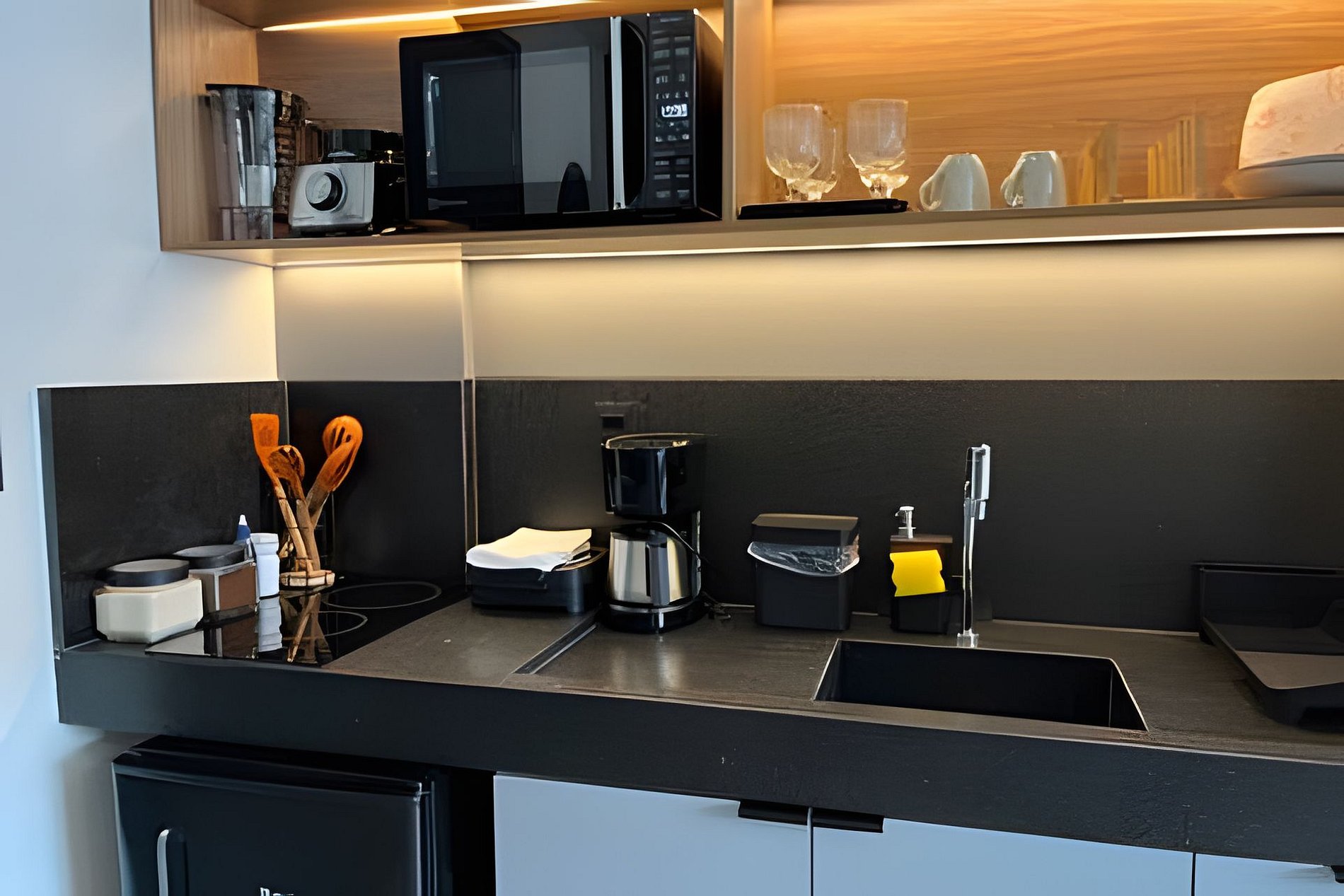 - Cozinha completa com Frigobar, Micro-ondas, Cooktop 2 bocas, Cafeteira, Liquidificador e Sanduicheira. Além de utensílios domésticos como copos, xícaras, taças, pratos, talheres, jogo de panelas básico, utensílios de cozinha; (No item comodidade não dispomos de óleo, tigelas, vasilhas, pimenta e Hashi).