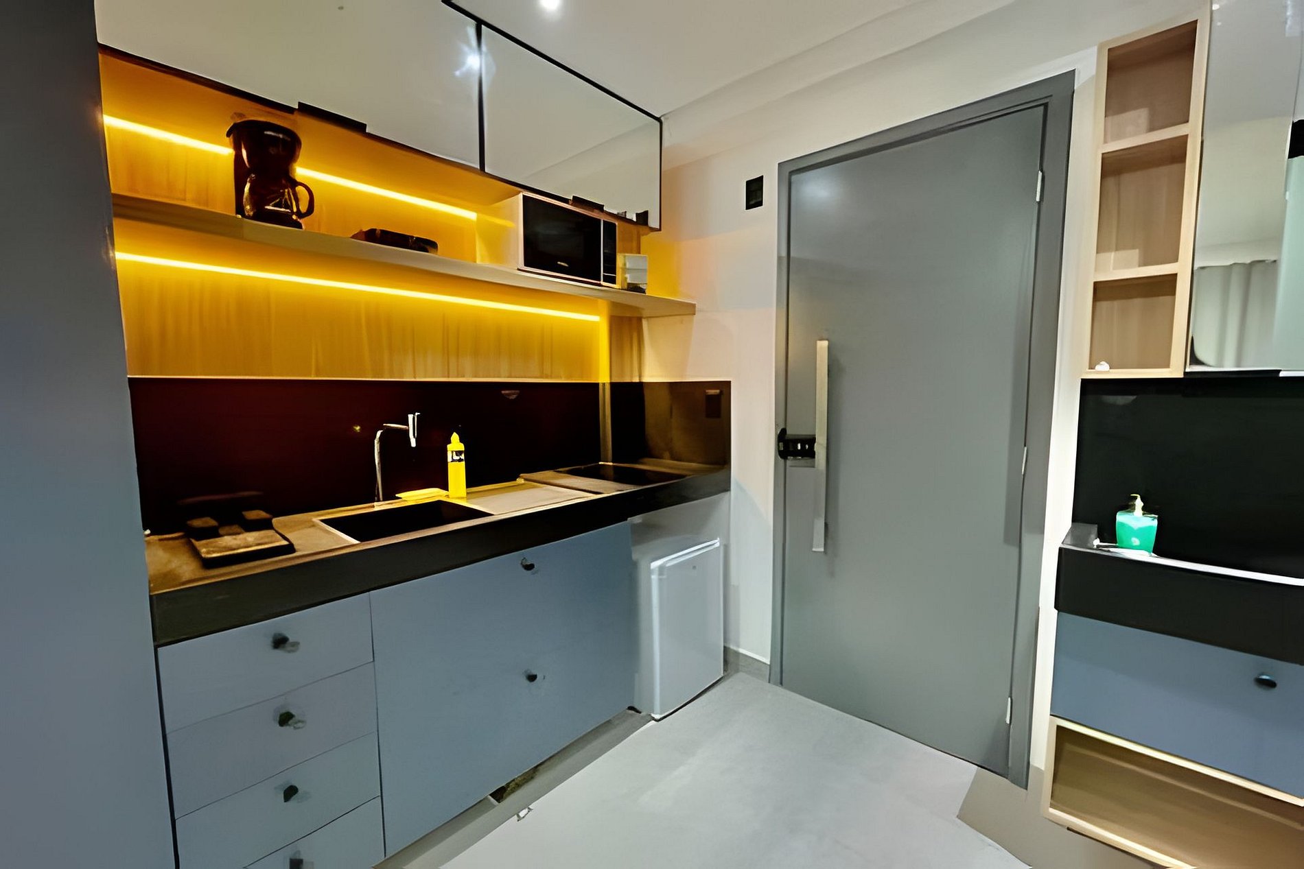 - Itens como detergente, esponja, escorredor de pratos, pano de prato e perfex (No item comodidade não dispomos de óleo, tigelas, vasilhas, pimenta e Hashi)