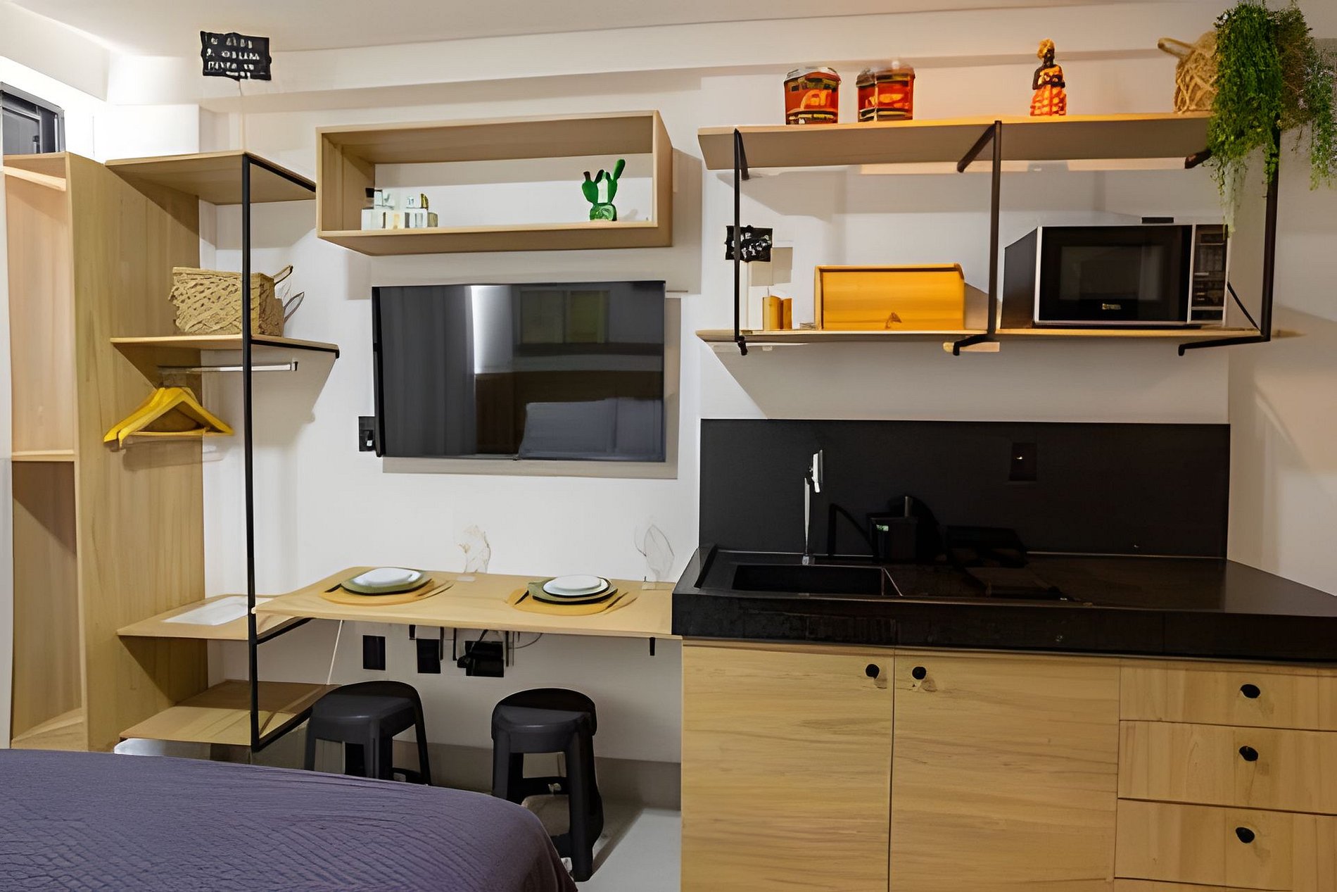 - Utensílios básicos (copos, taças, pratos, talheres, jogo de panelas básico e utensílios de cozinha)