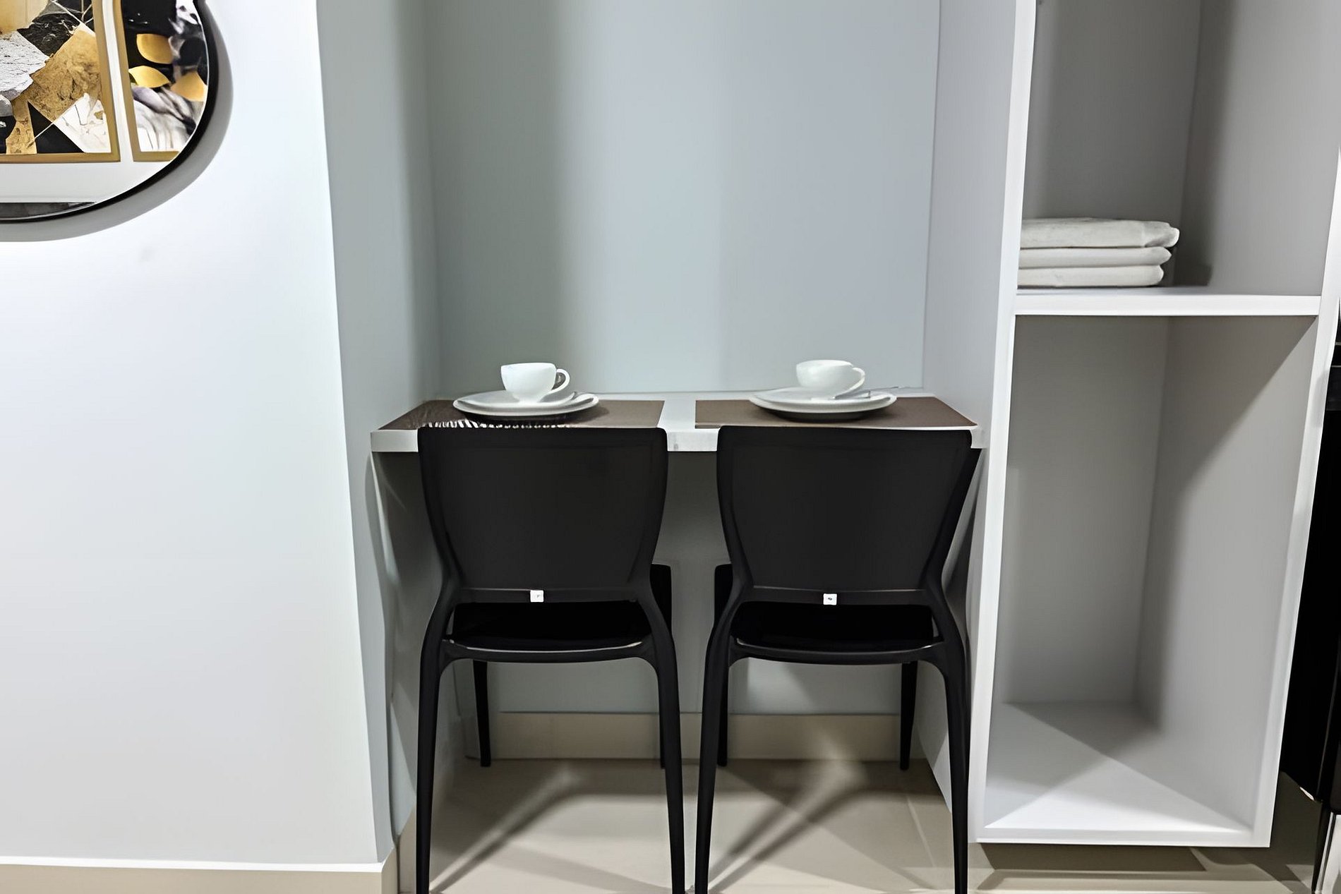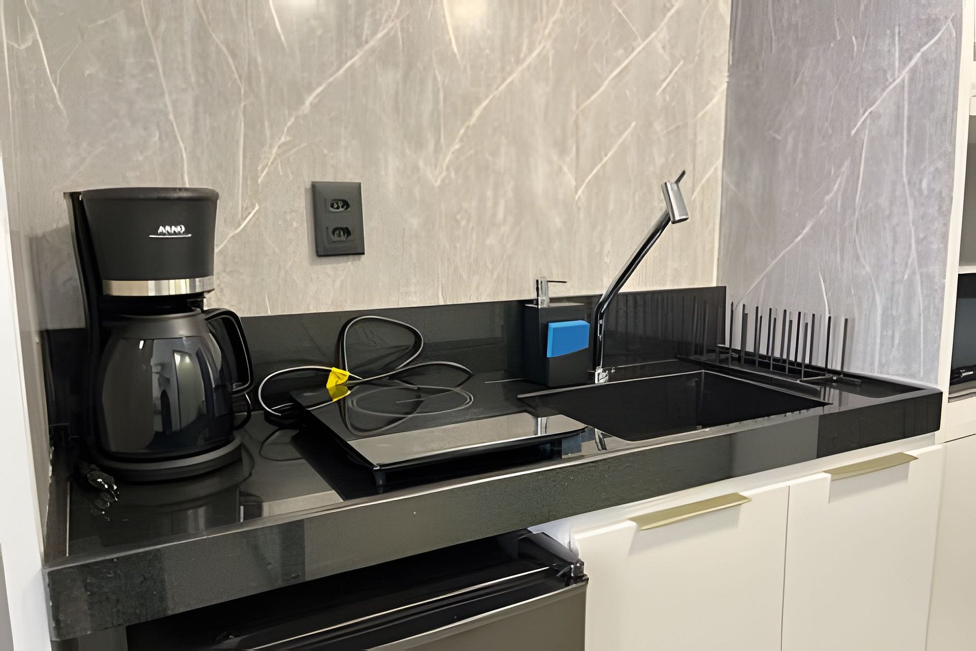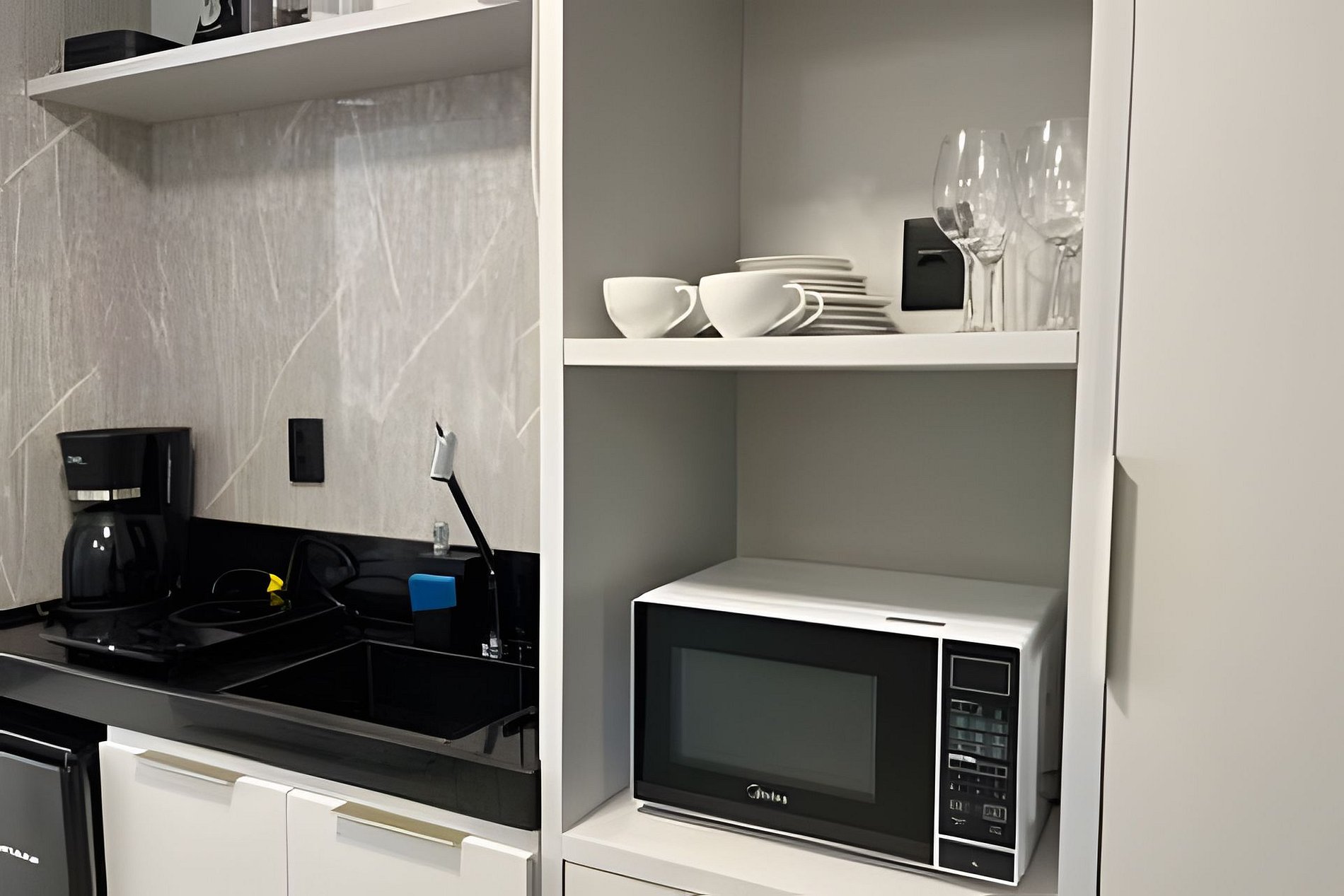 - Cozinha completa com Frigobar, Micro-ondas, Fogão (1 boca), Air Fryer, Cafeteira, Sanduicheira e Liquidificador. Além de utensílios domésticos como copos, xícaras, taças, pratos, talheres, jogo de panelas básico e utensílios de cozinha. (No item comodidade não dispomos de óleo, tigelas, vasilhas, pimenta e Hashi).