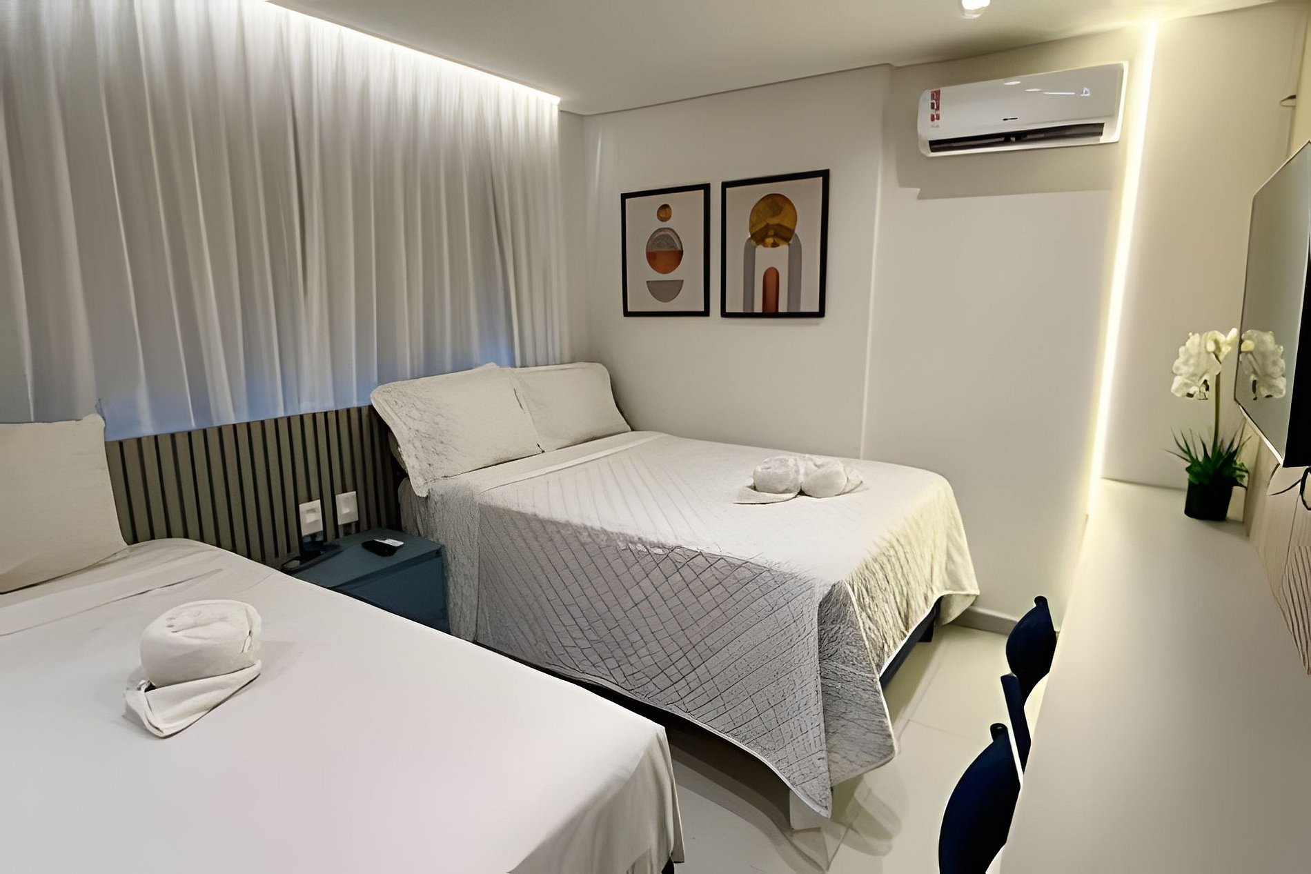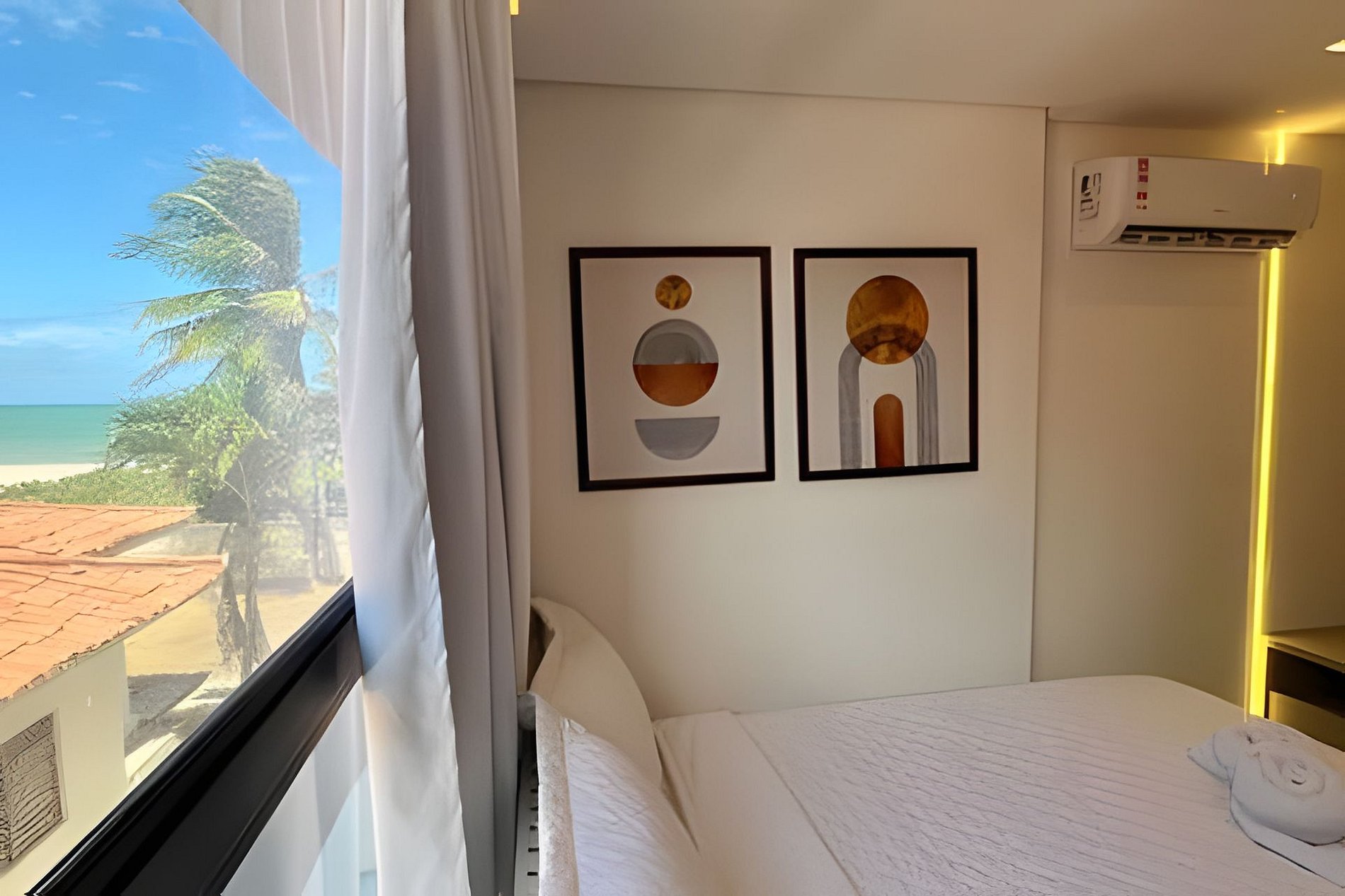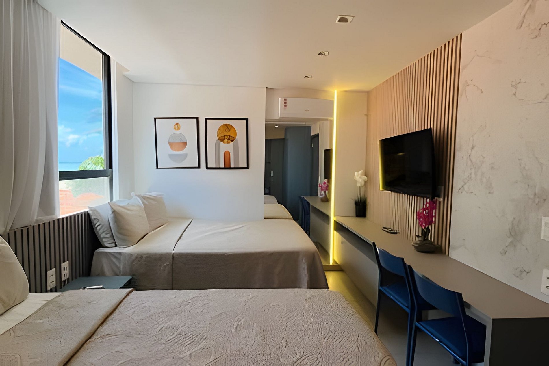 - Quarto com 1 cama casal e 1 cama de solteiro, Guarda-Roupa, Espelho, Mesa com 2 lugares, SmarTV, Ar condicionado e janelão com vista mar;