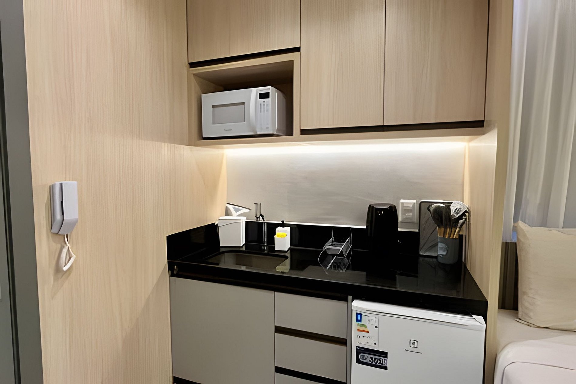 - Cozinha completa com Frigobar, Micro-ondas, Air Fryer, Liquidificador, Cafeteira (cápsulas por conta do hóspede) e Sanduicheira. Além de utensílios domésticos como pratos, copos, xícaras, taças, talheres. (No item comodidade não dispomos de óleo, tigelas, vasilhas, pimenta e Hashi).