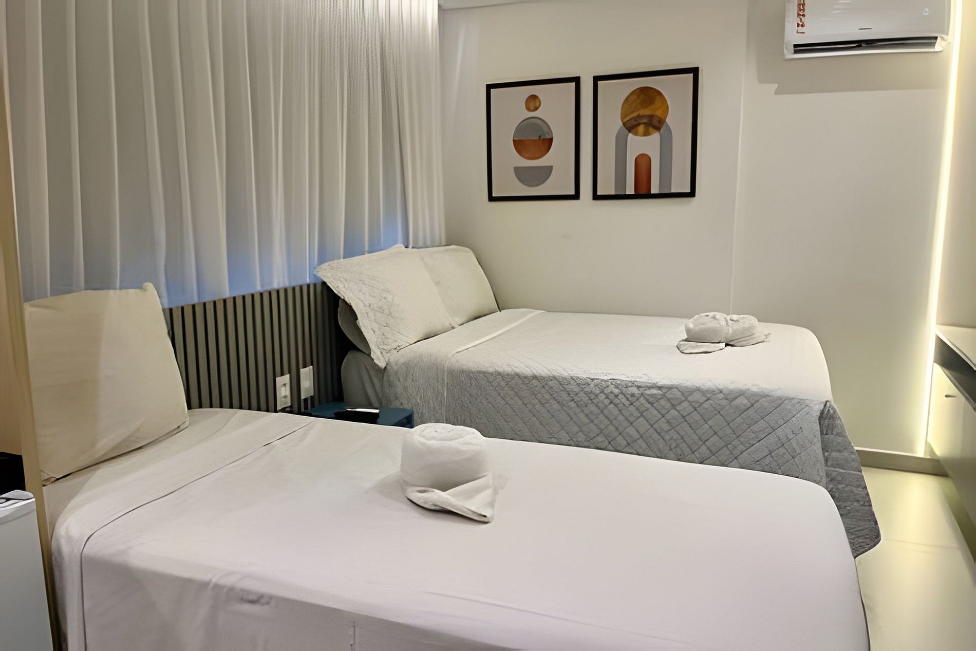 - Quarto com 1 cama casal e 1 cama de solteiro, Guarda-Roupa, Espelho, Mesa com 2 lugares, SmarTV, Ar condicionado e janelão com vista mar;