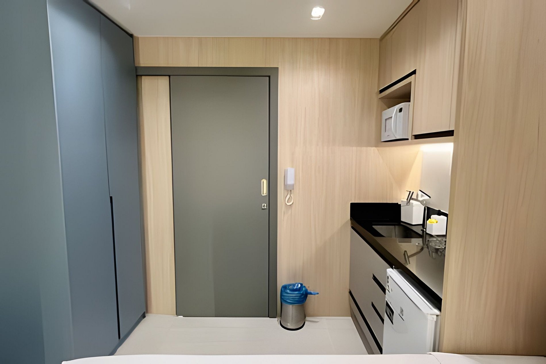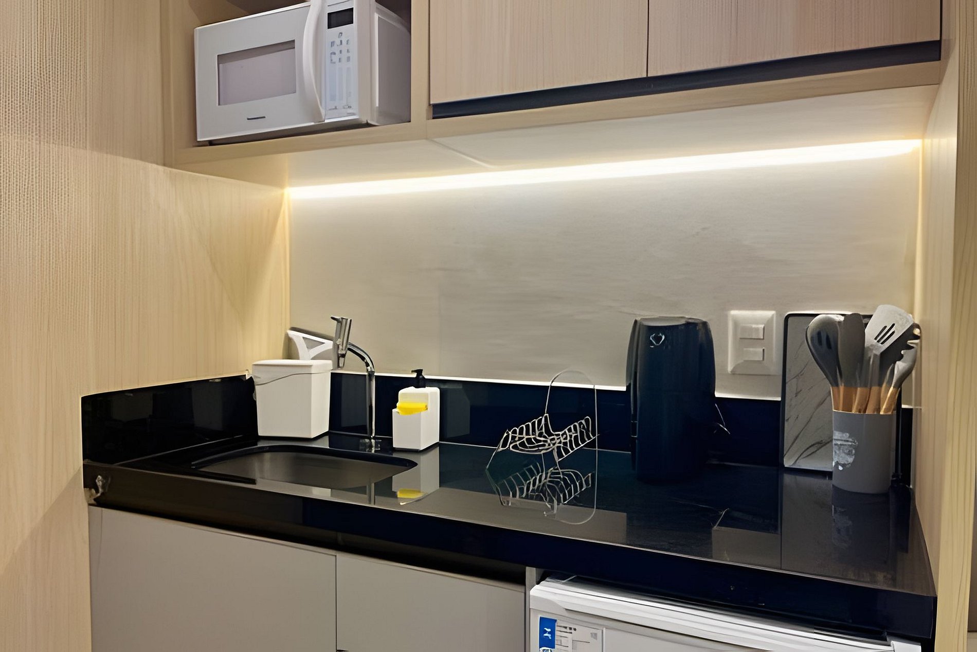 - Cozinha completa com Frigobar, Micro-ondas, Air Fryer, Liquidificador, Cafeteira (cápsulas por conta do hóspede) e Sanduicheira. Além de utensílios domésticos como pratos, copos, xícaras, taças, talheres. (No item comodidade não dispomos de óleo, tigelas, vasilhas, pimenta e Hashi).