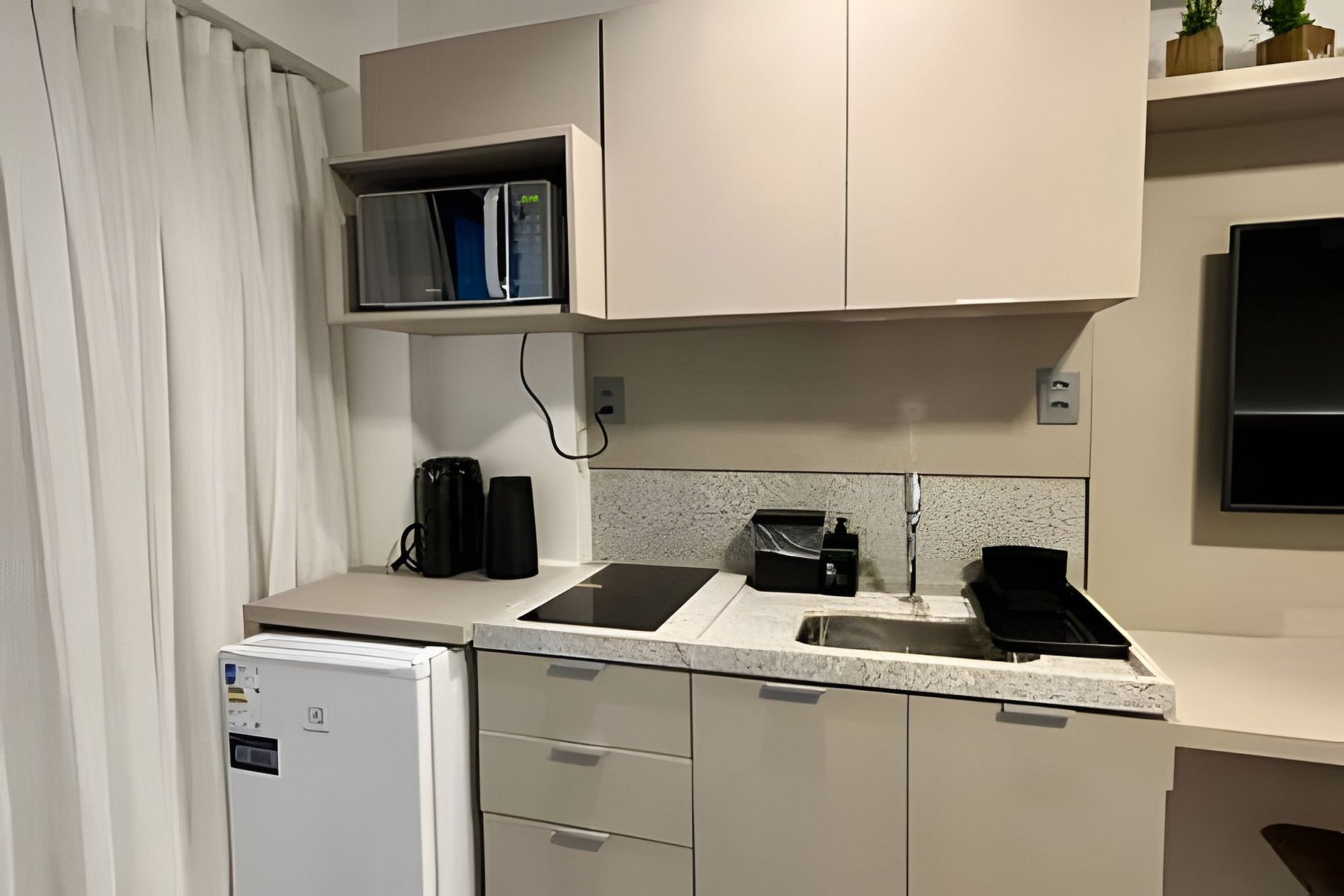 - Cozinha completa com Frigobar, Micro-ondas, Cooktop 2 bocas e Cafeteira (cápsulas por conta do hóspede). Além de utensílios domésticos como copos, xícaras, pratos, talheres e jogo de panelas básico. (No item comodidade não dispomos de óleo, tigelas, vasilhas, pimenta e Hashi).