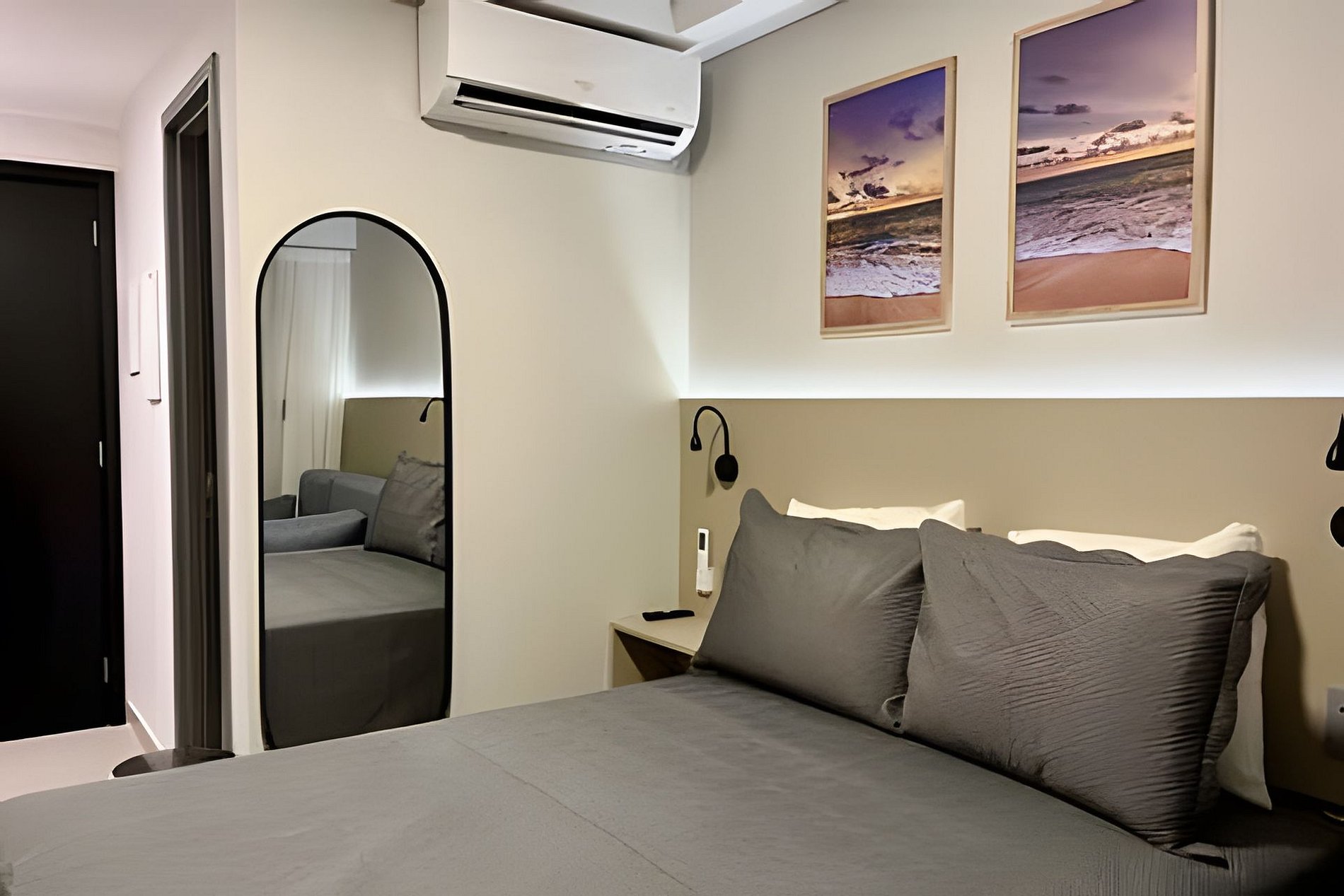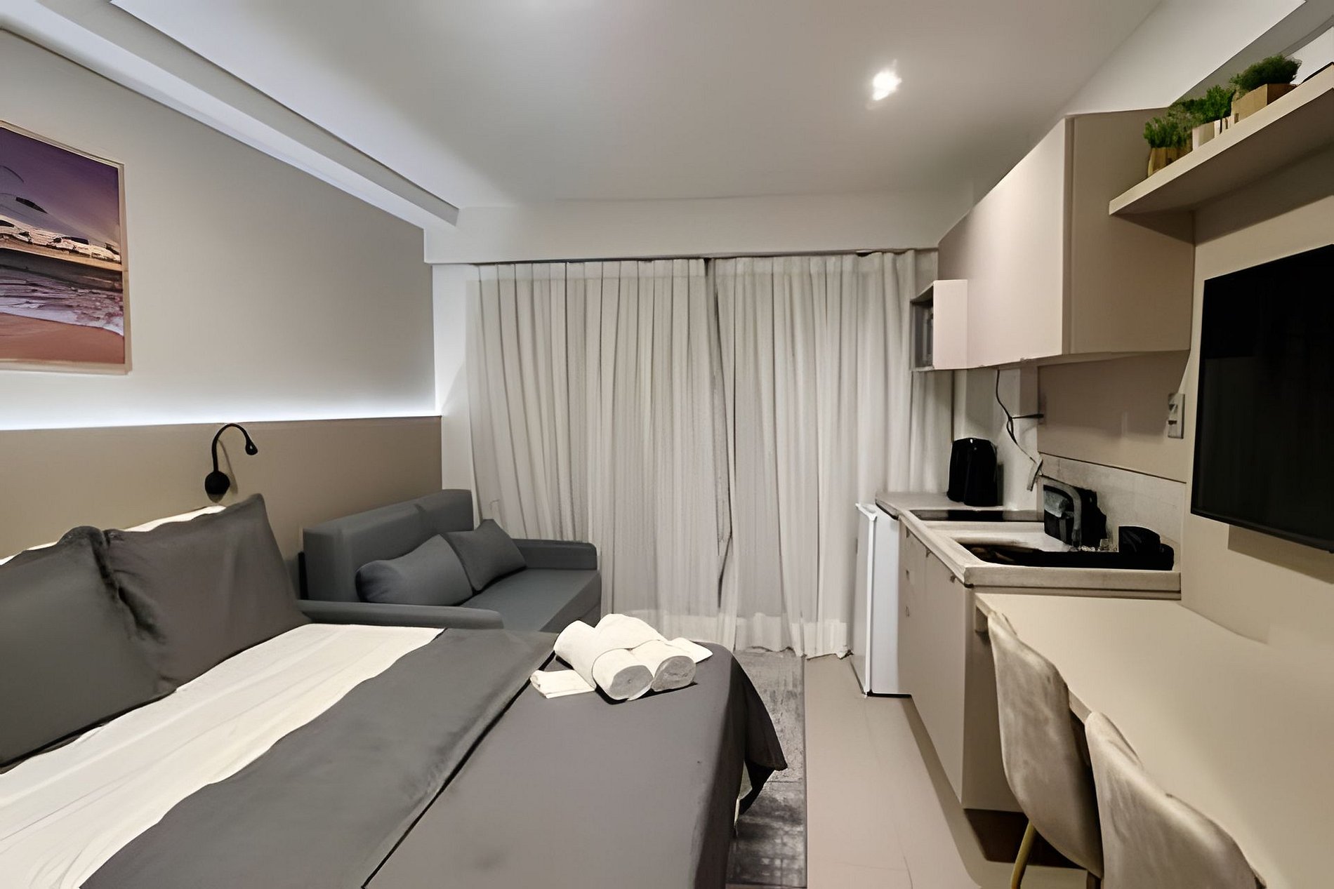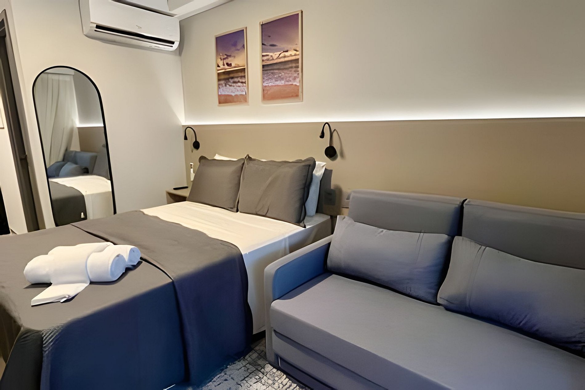 - Quarto com cama casal e 1 sofá cama casal, SmarTV, Ar condicionado, Guarda-roupa e Mesa com 2 lugares;