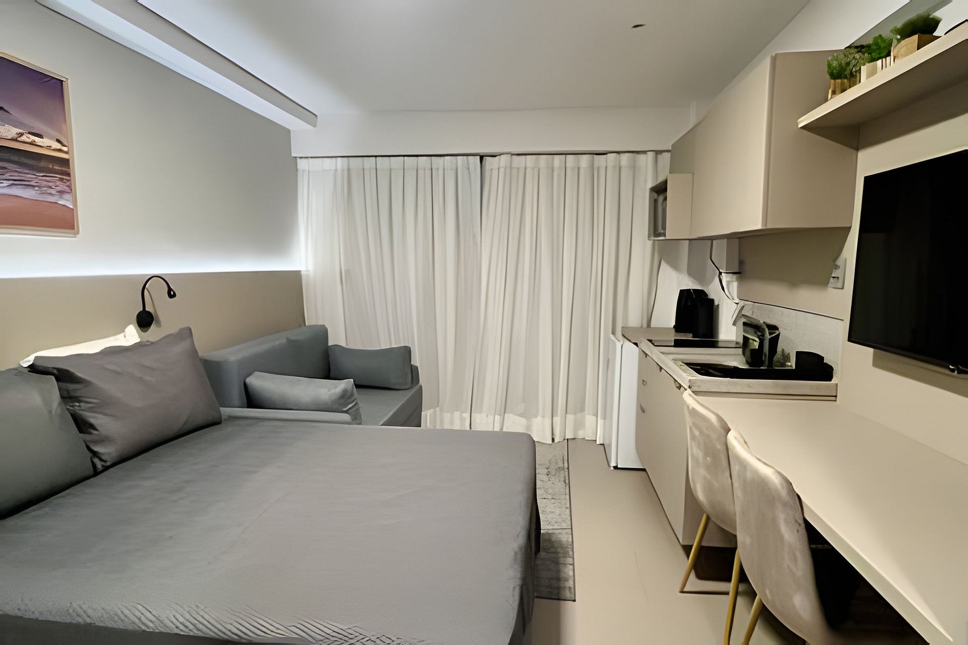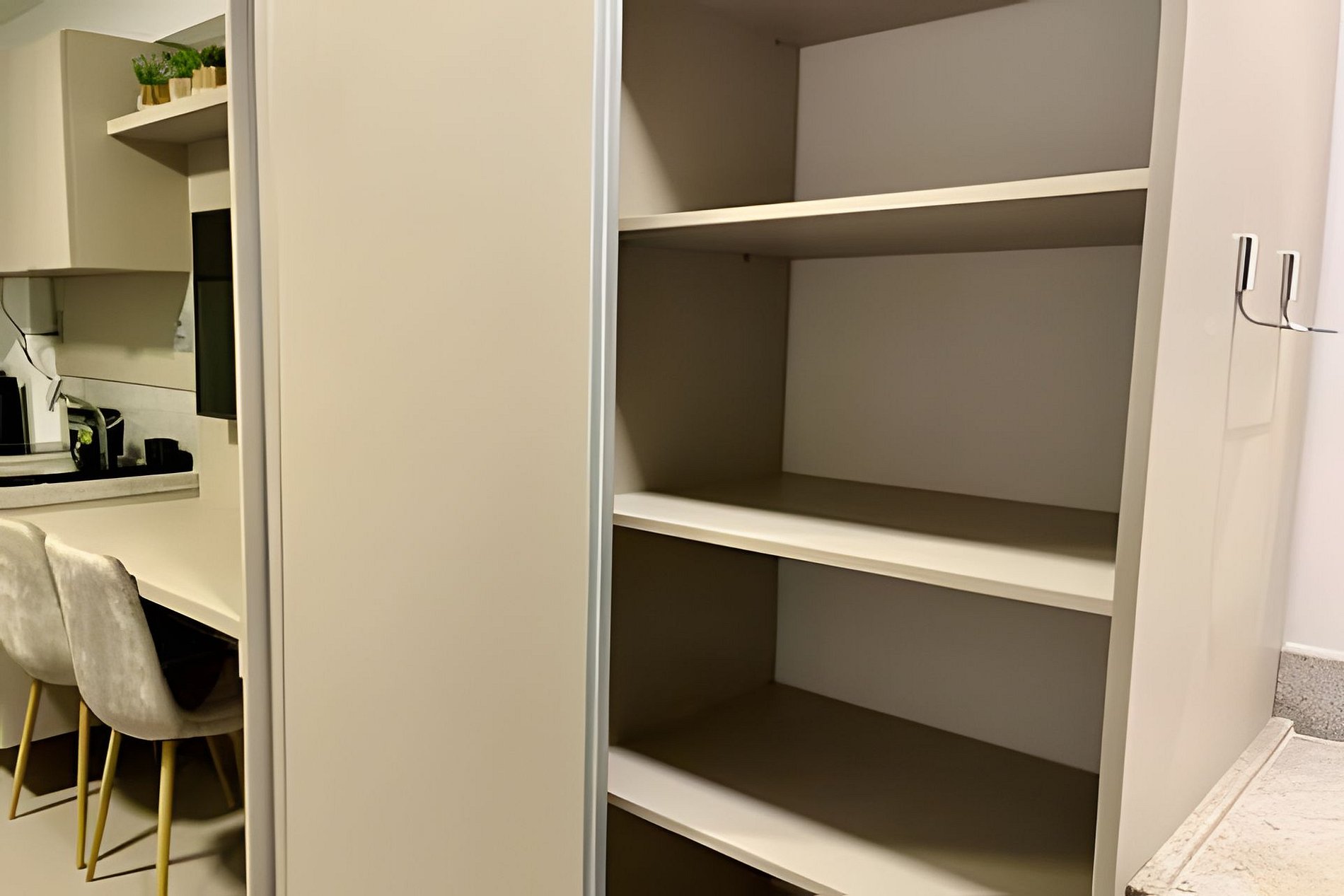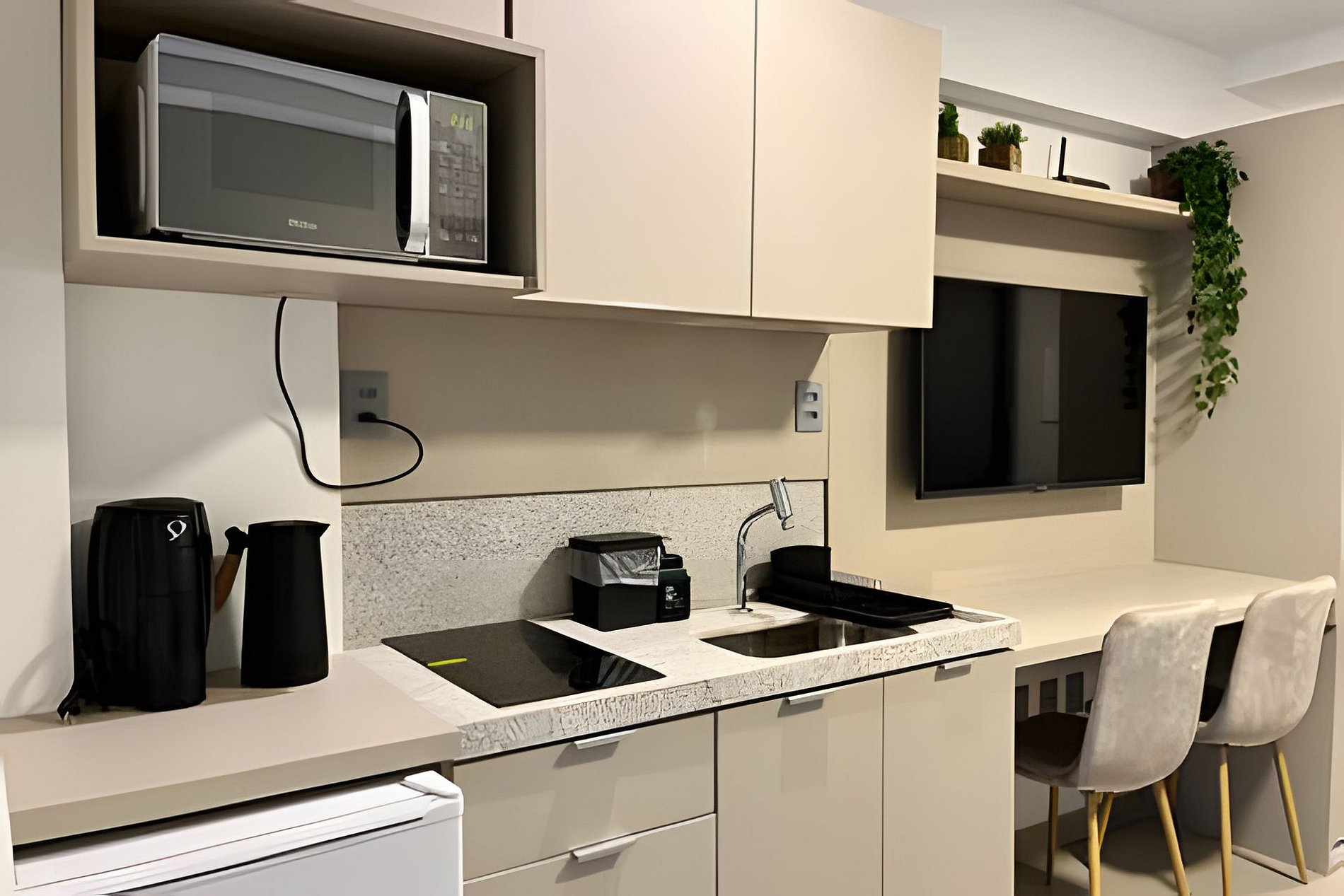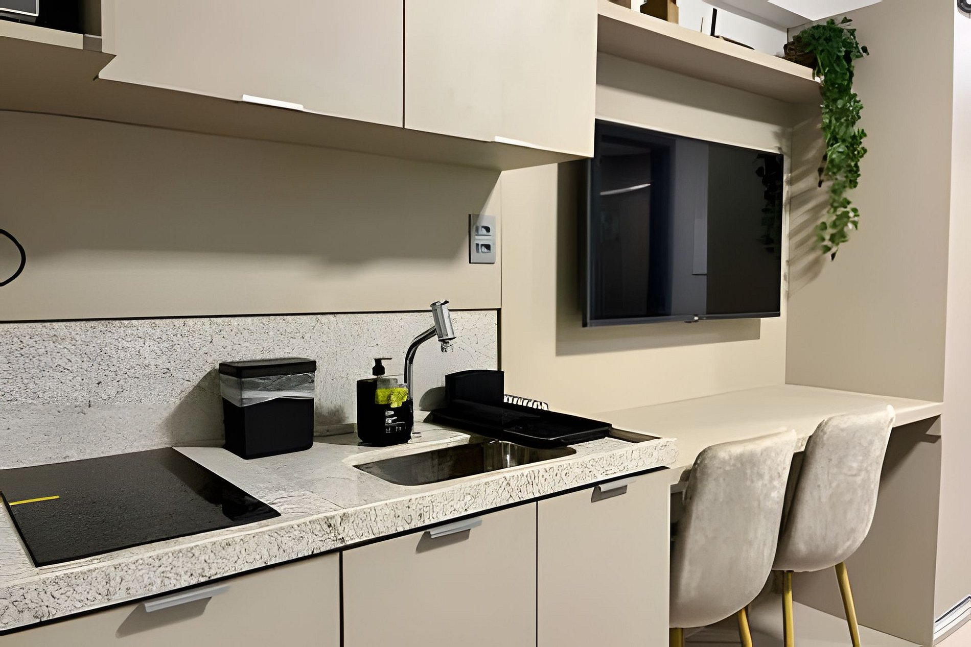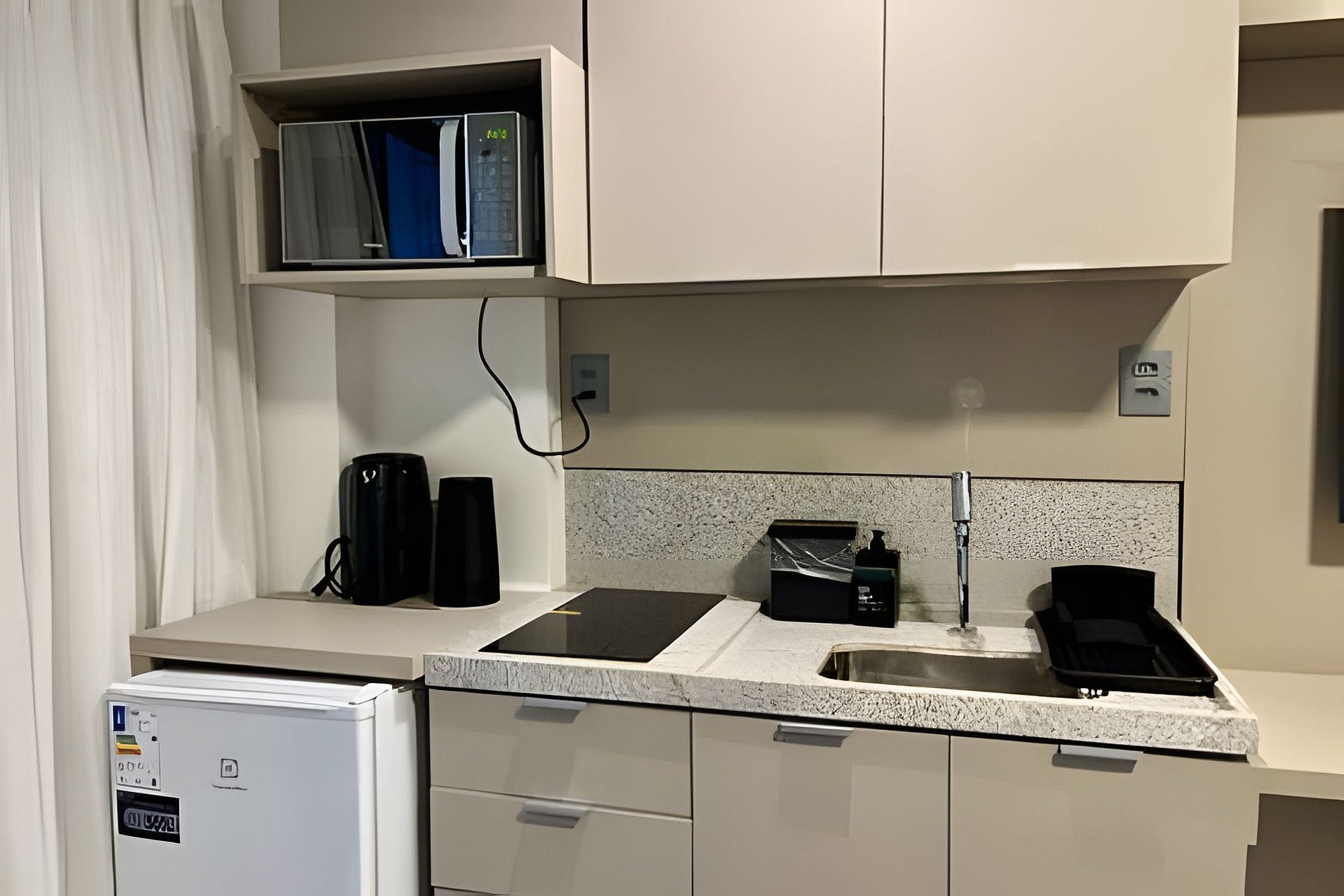- Cozinha completa com Frigobar, Micro-ondas, Cooktop 2 bocas e Cafeteira (cápsulas por conta do hóspede). Além de utensílios domésticos como copos, xícaras, pratos, talheres e jogo de panelas básico. (No item comodidade não dispomos de óleo, tigelas, vasilhas, pimenta e Hashi).