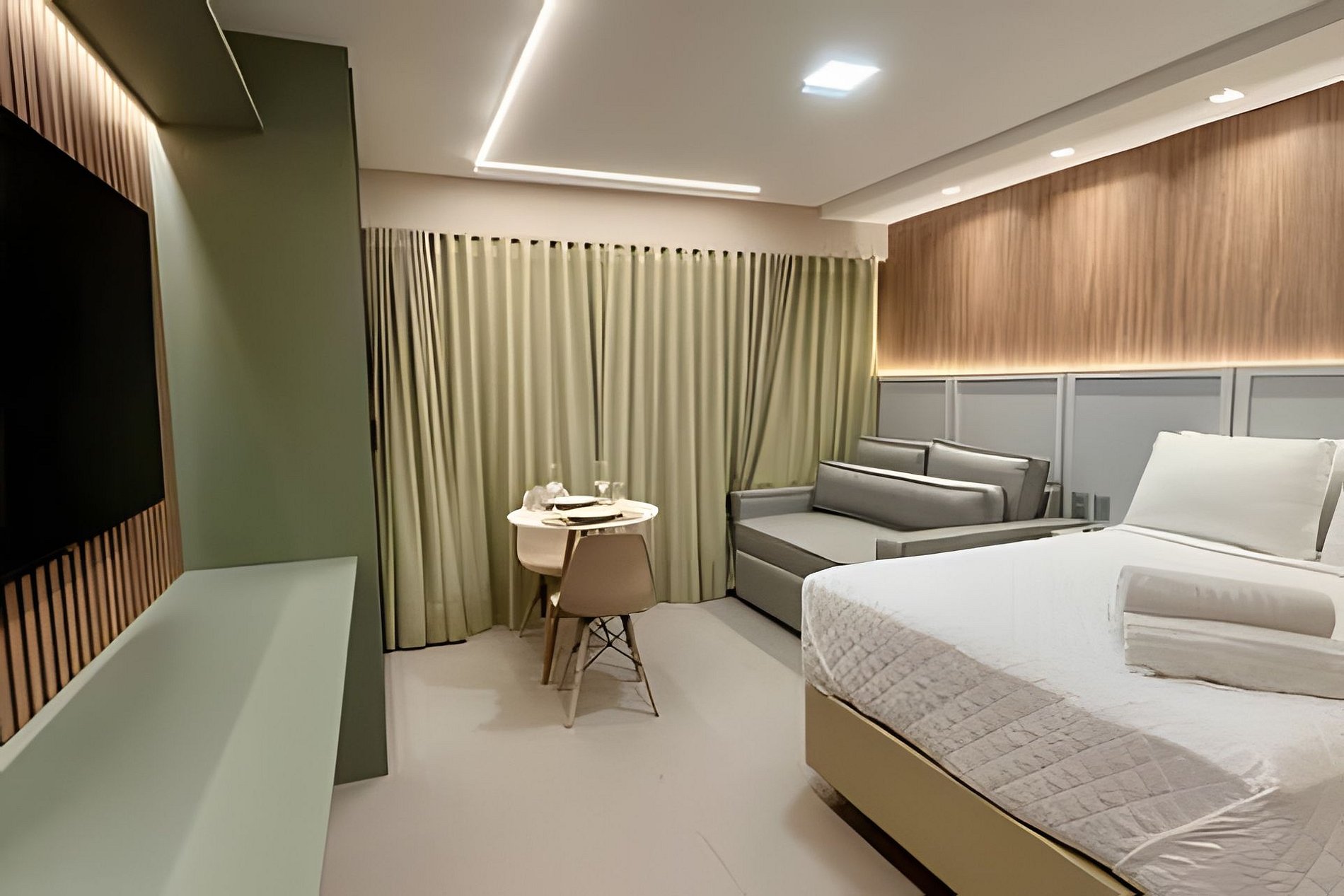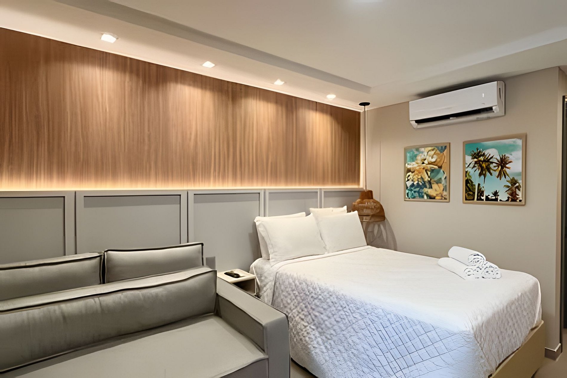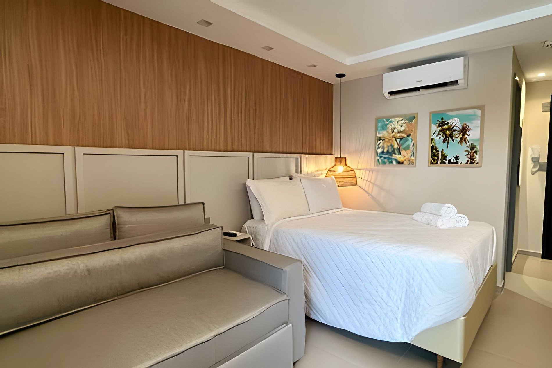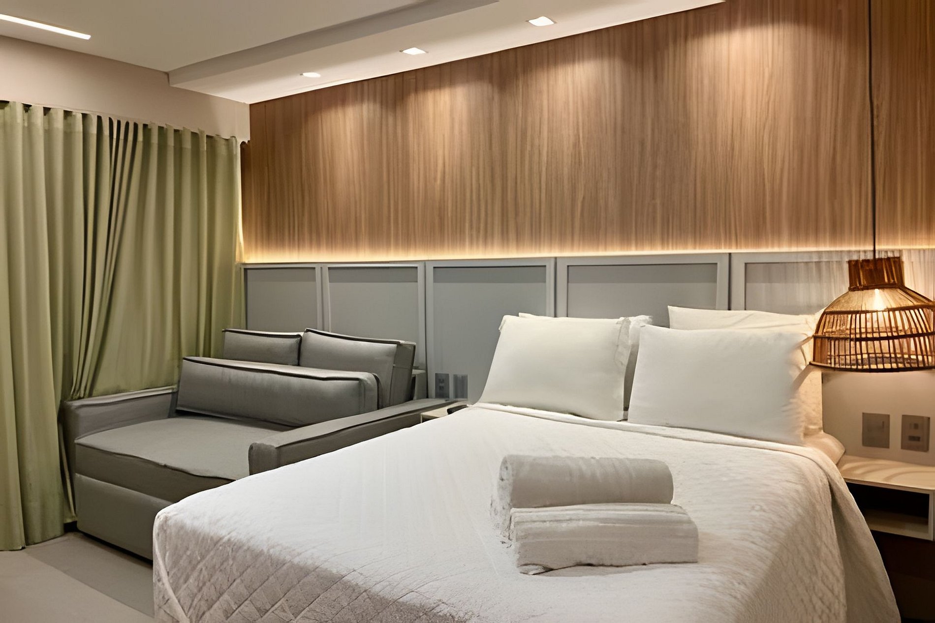- Quarto com cama Queen e 1 sofá cama casal, SmarTV, Ar condicionado, Guarda-roupa e Mesa com 2 lugares;