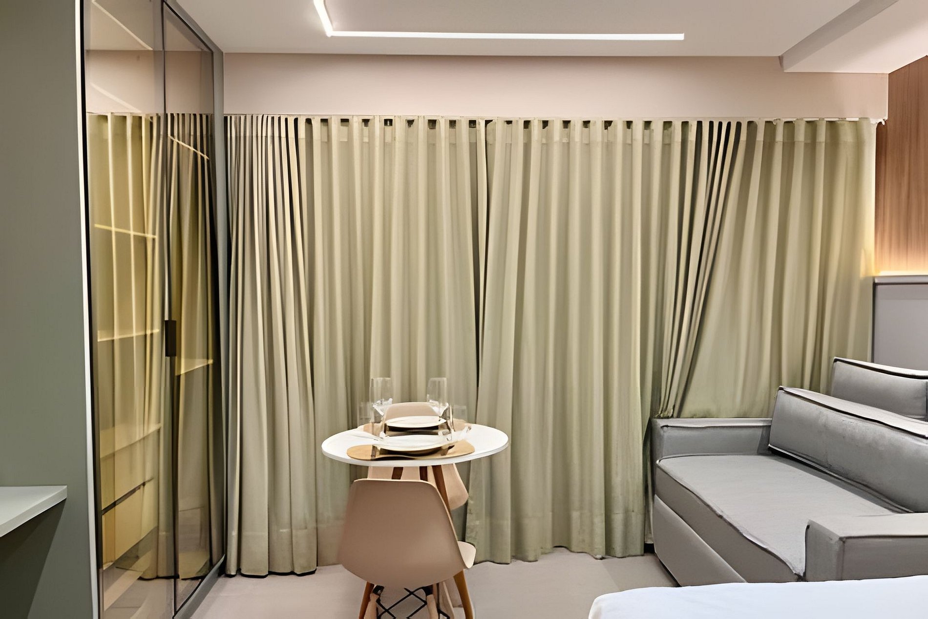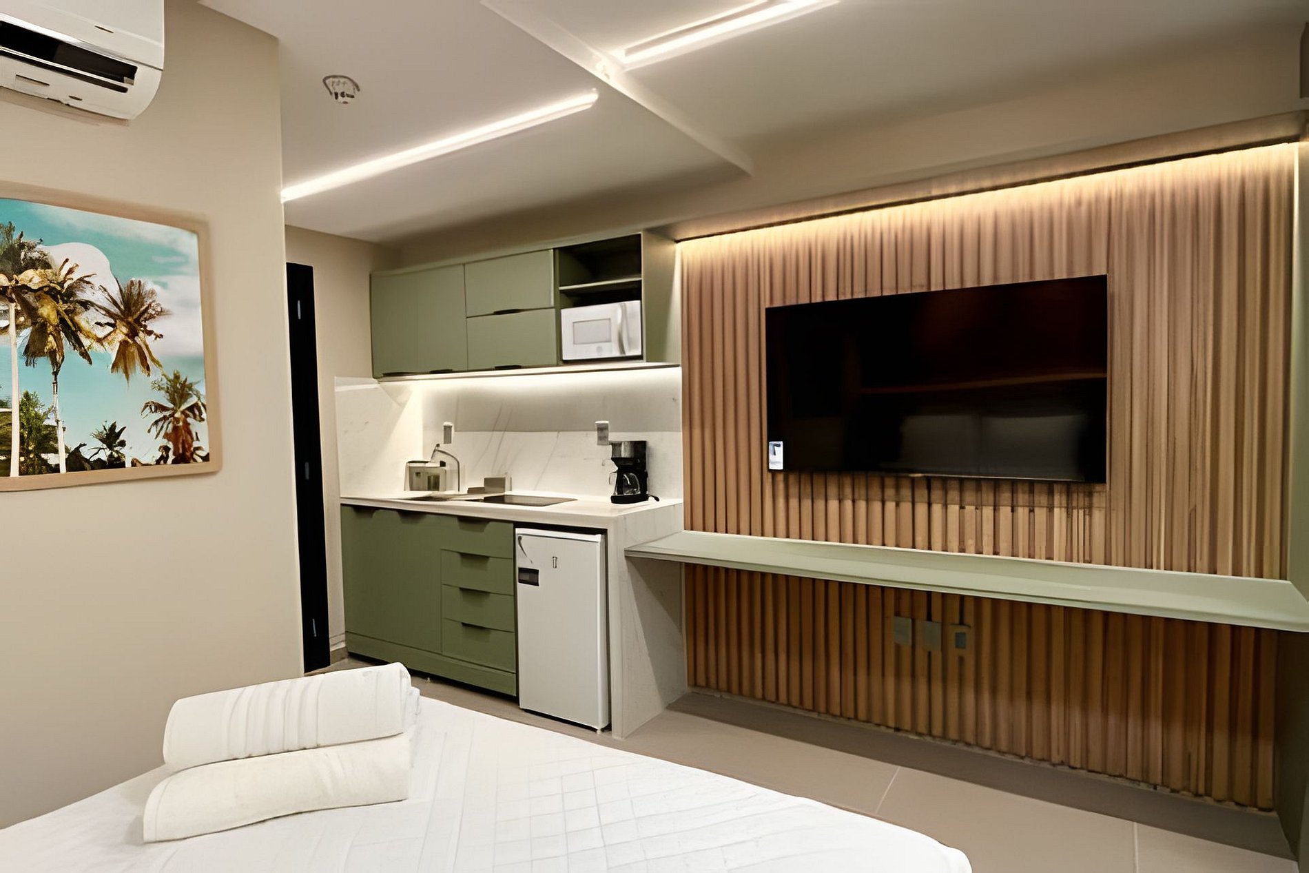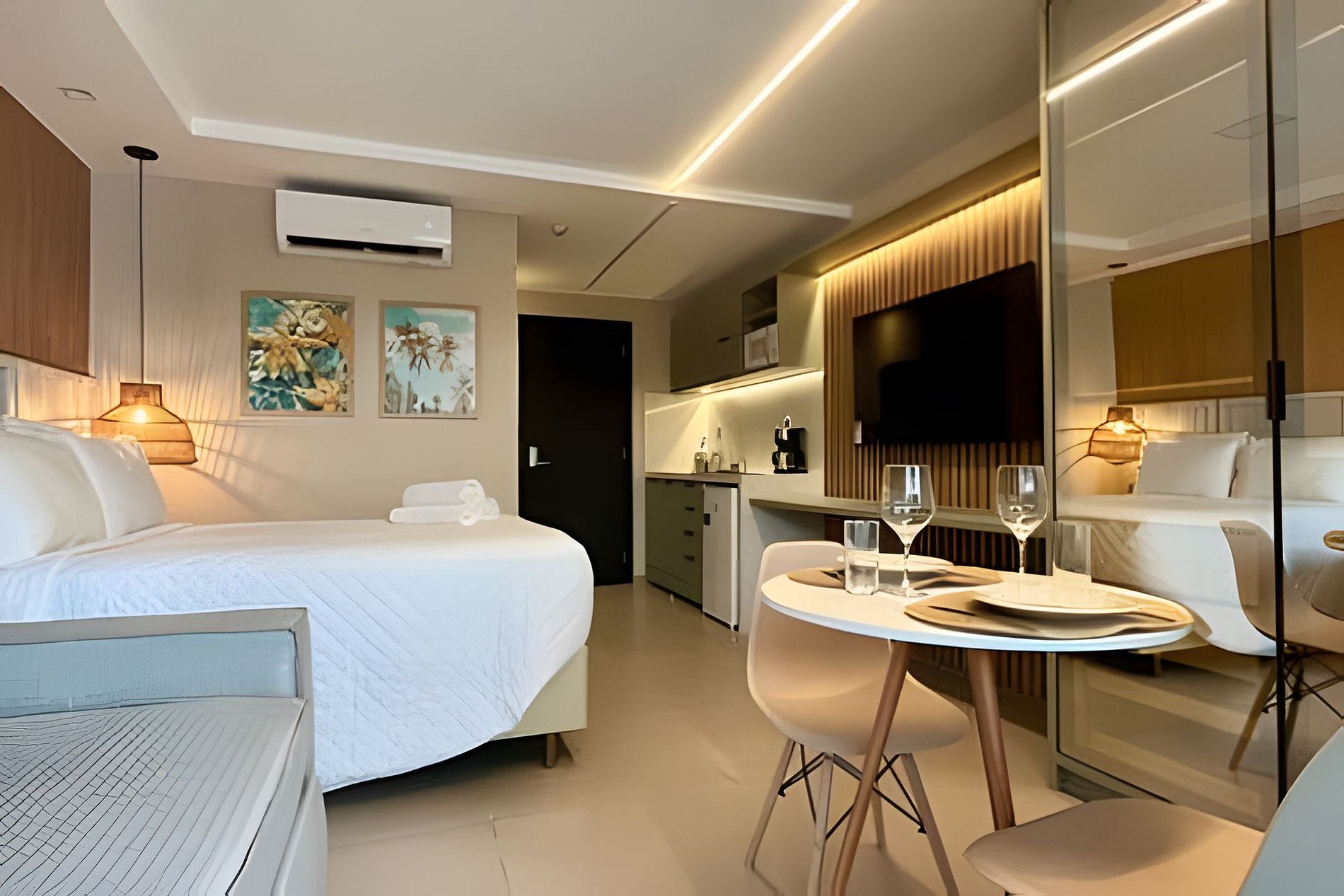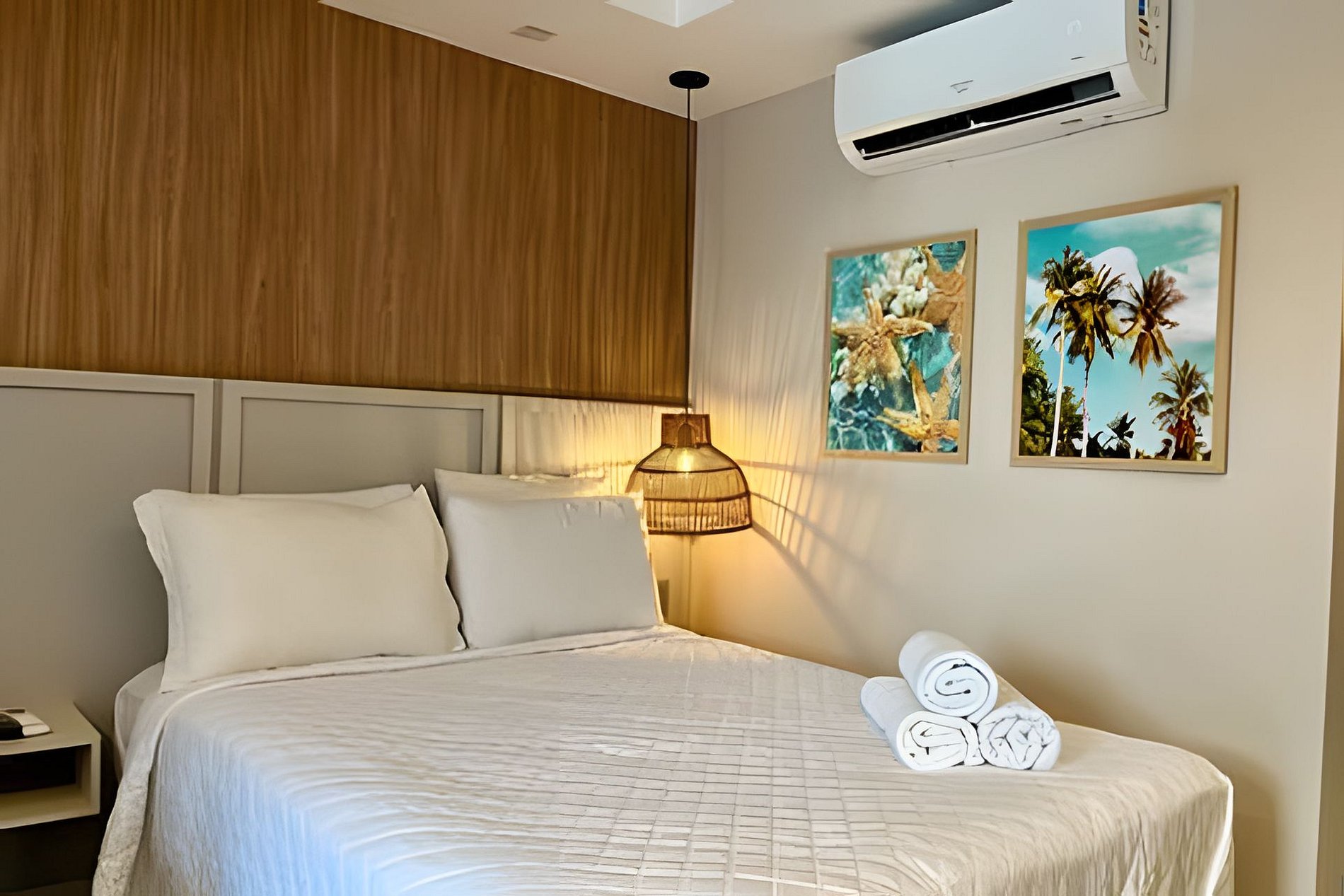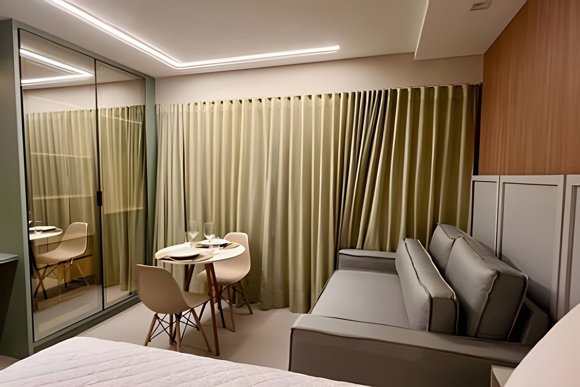 - Quarto com cama Queen e 1 sofá cama casal, SmarTV, Ar condicionado, Guarda-roupa e Mesa com 2 lugares;