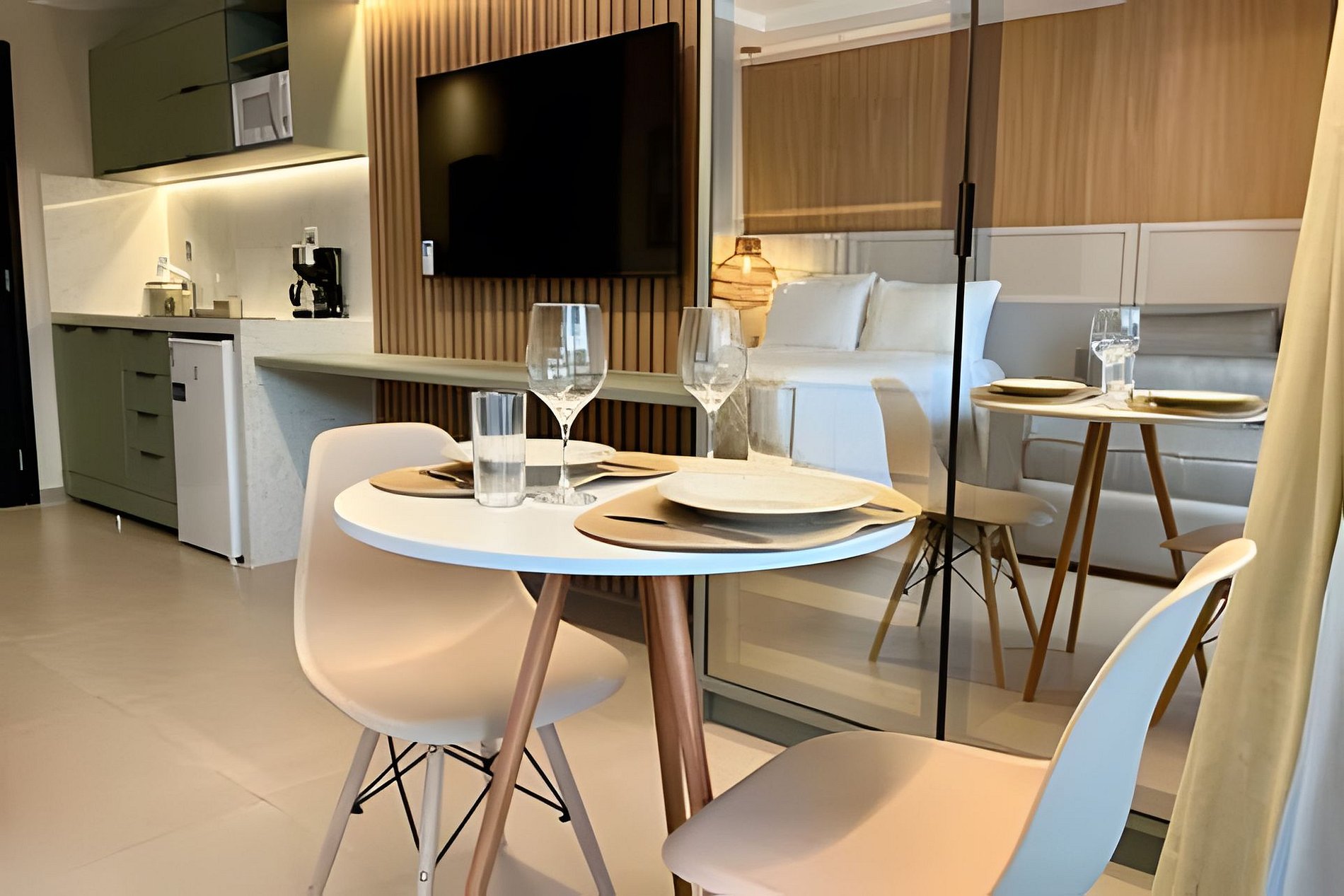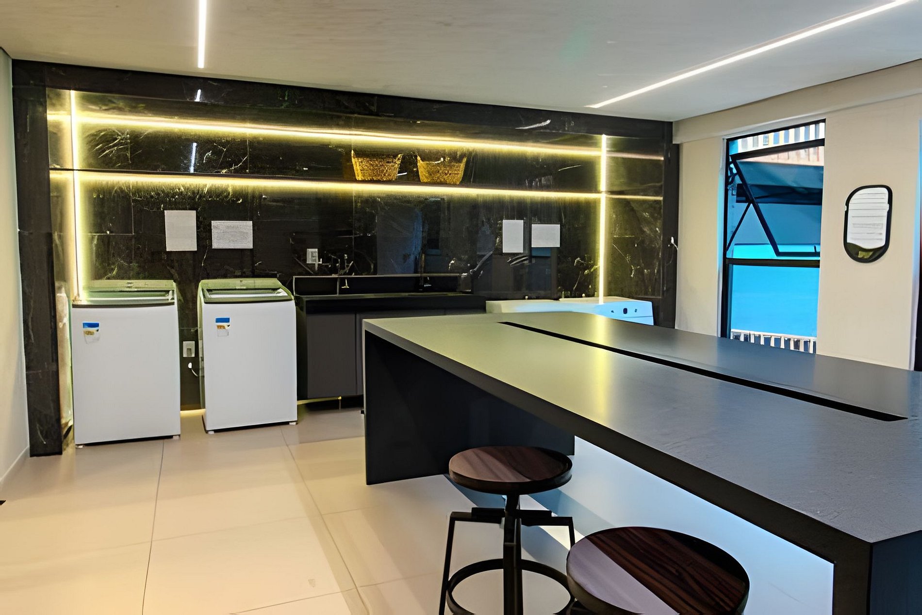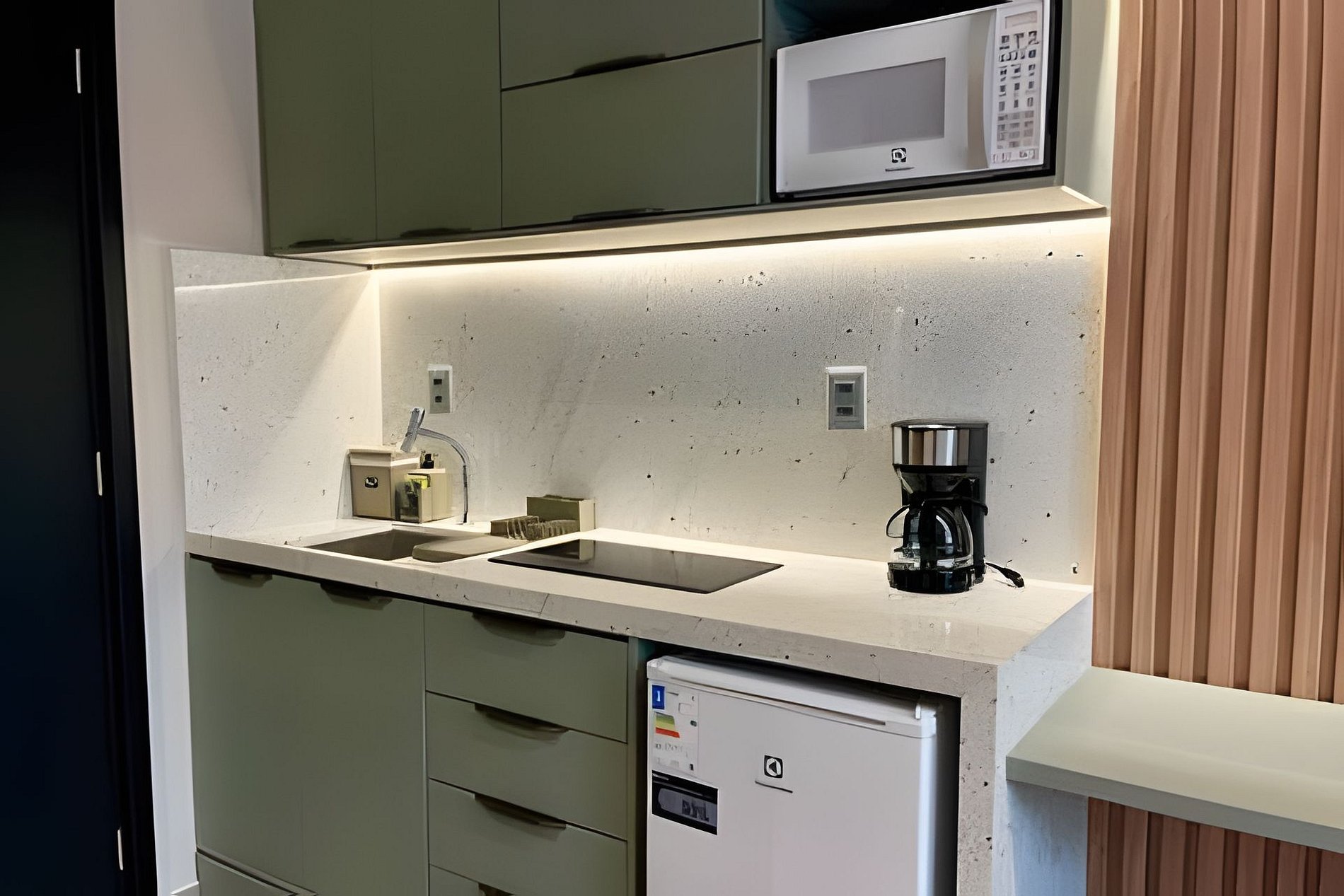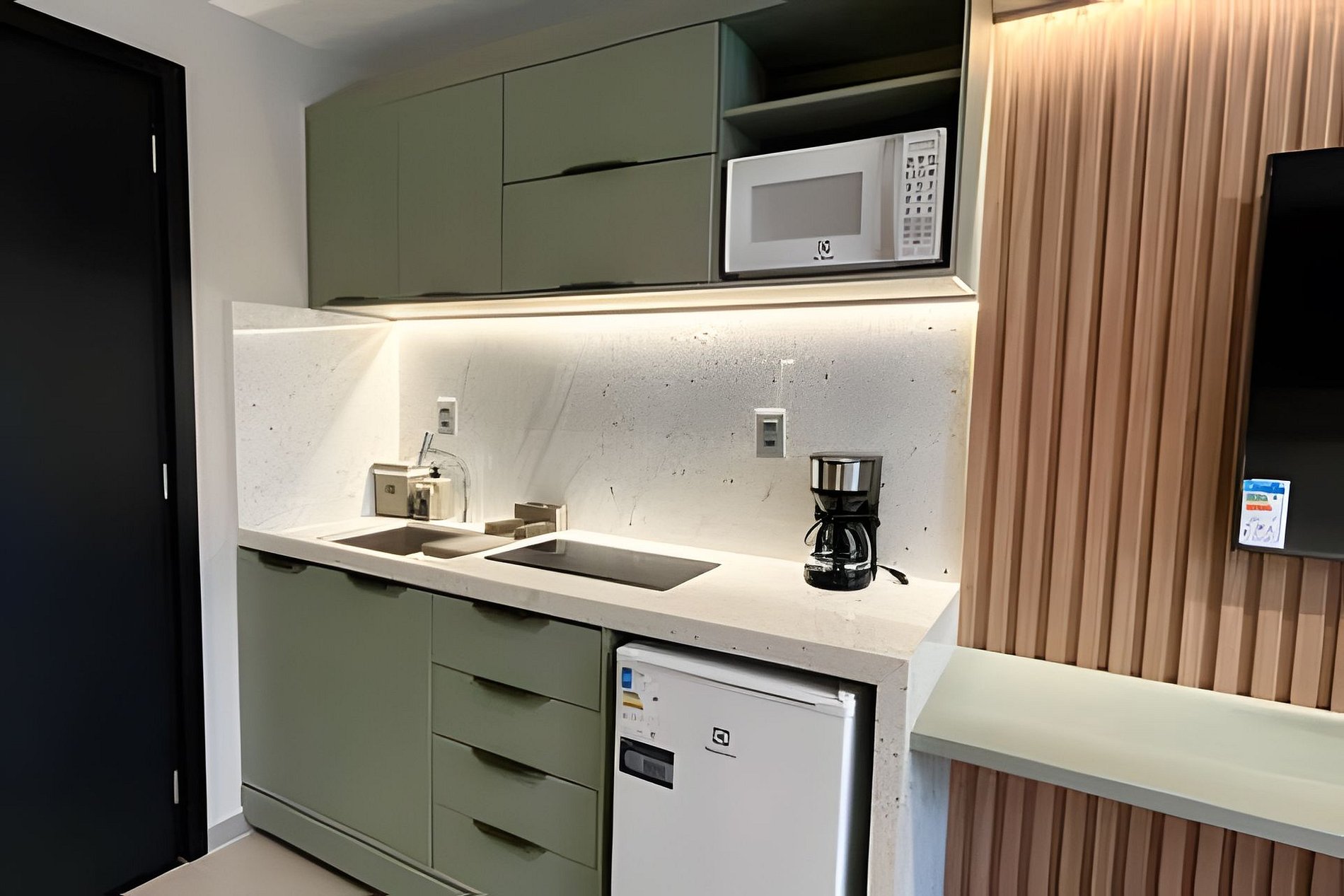 - Cozinha completa com Frigobar, Micro-ondas, Cooktop 2 bocas e Cafeteira. Além de utensílios domésticos como copos, taças, xícaras, pratos talheres, jogo de panelas básico e utensílios de cozinha. (No item comodidade não dispomos de óleo, tigelas, vasilhas, pimenta e Hashi).