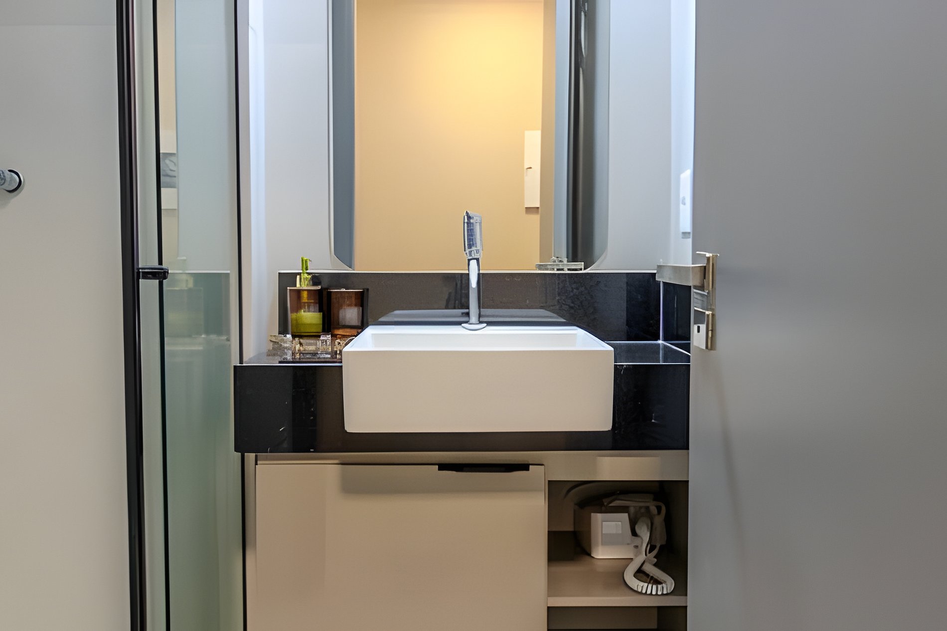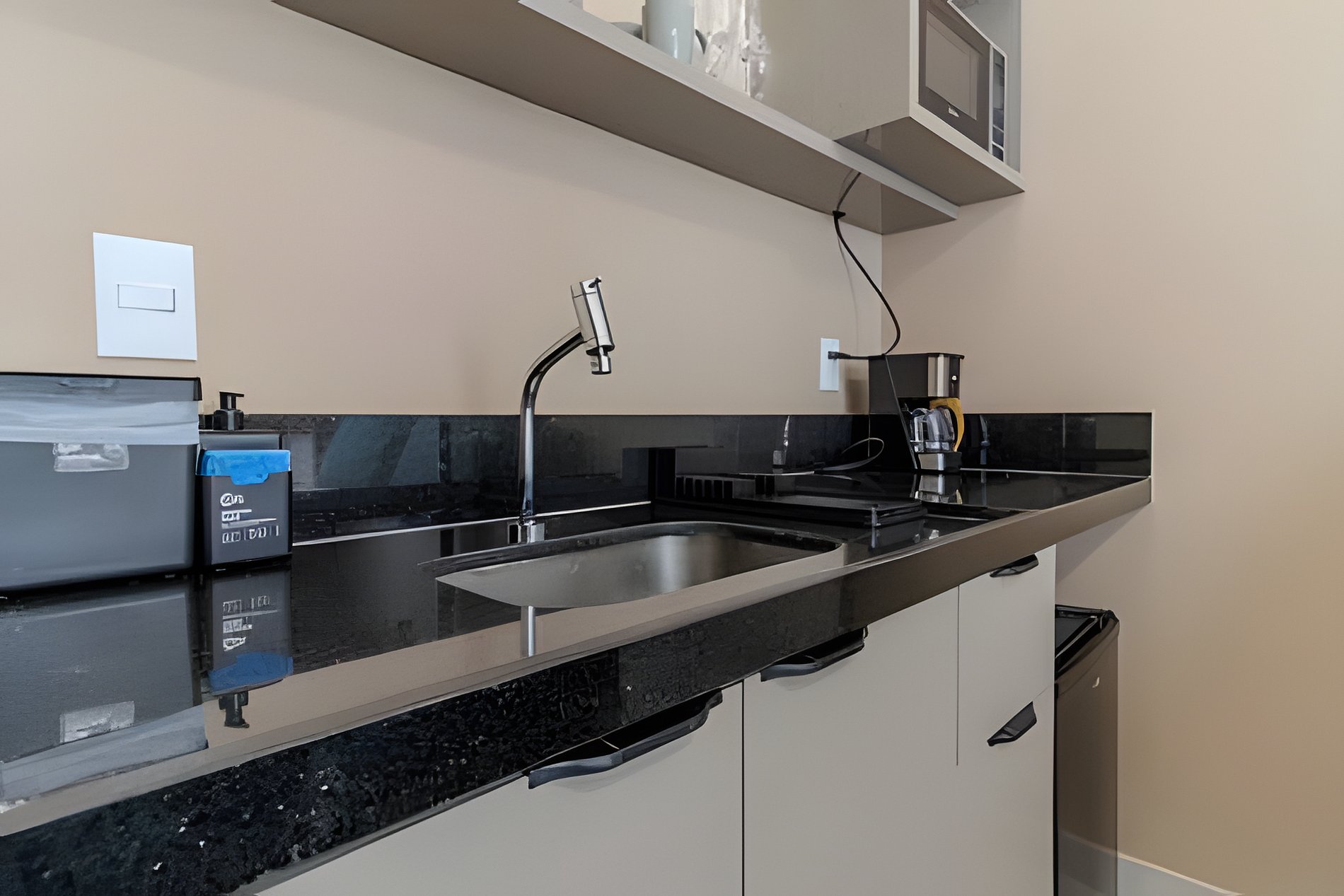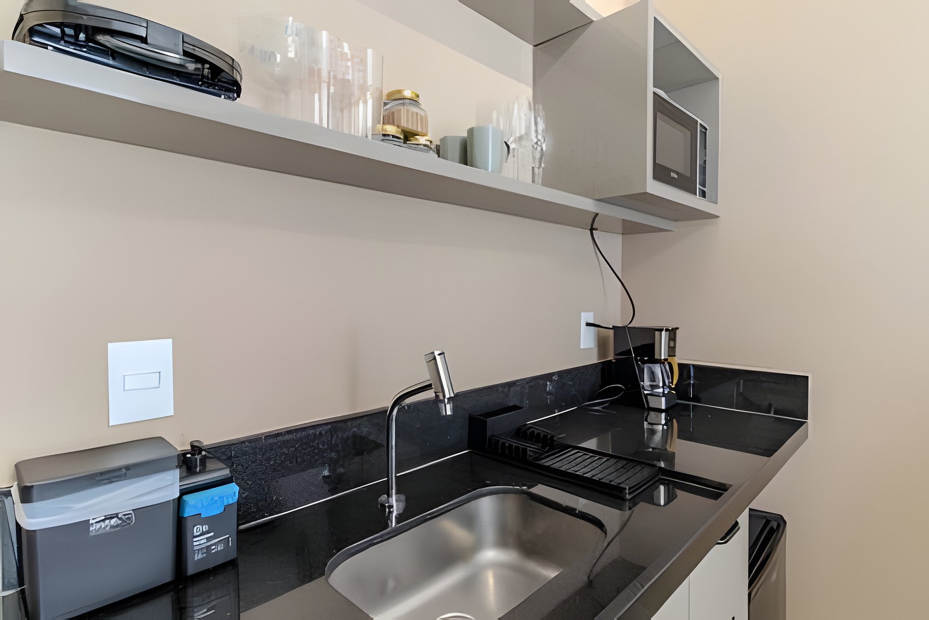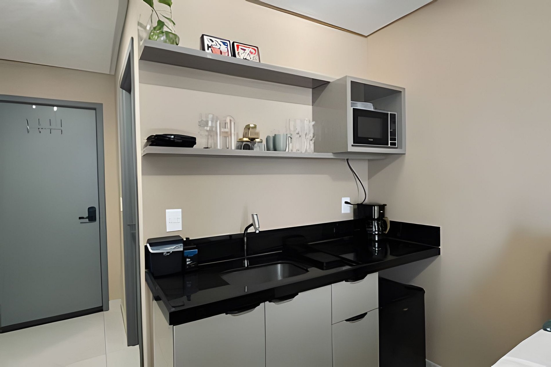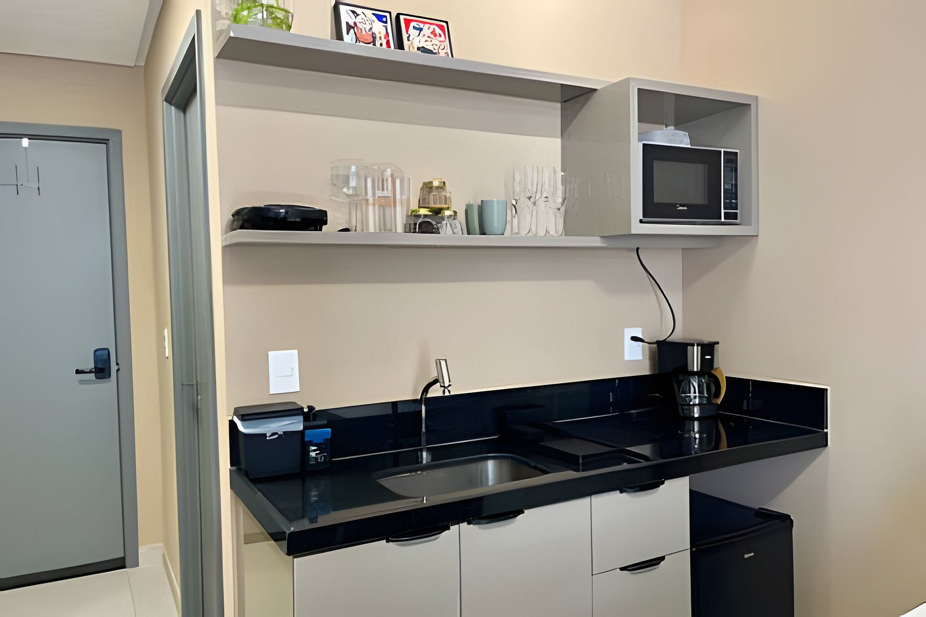 - Cozinha completa com Frigobar, Micro-ondas, Fogão de indução (1 boca), Cafeteira e Sanduicheira. Além de utensílios domésticos como copos, xícaras, taças, panelas, pratos, talheres e jogo de panelas básico. (No item comodidade não dispomos de óleo, tigelas, vasilhas, pimenta e Hashi).