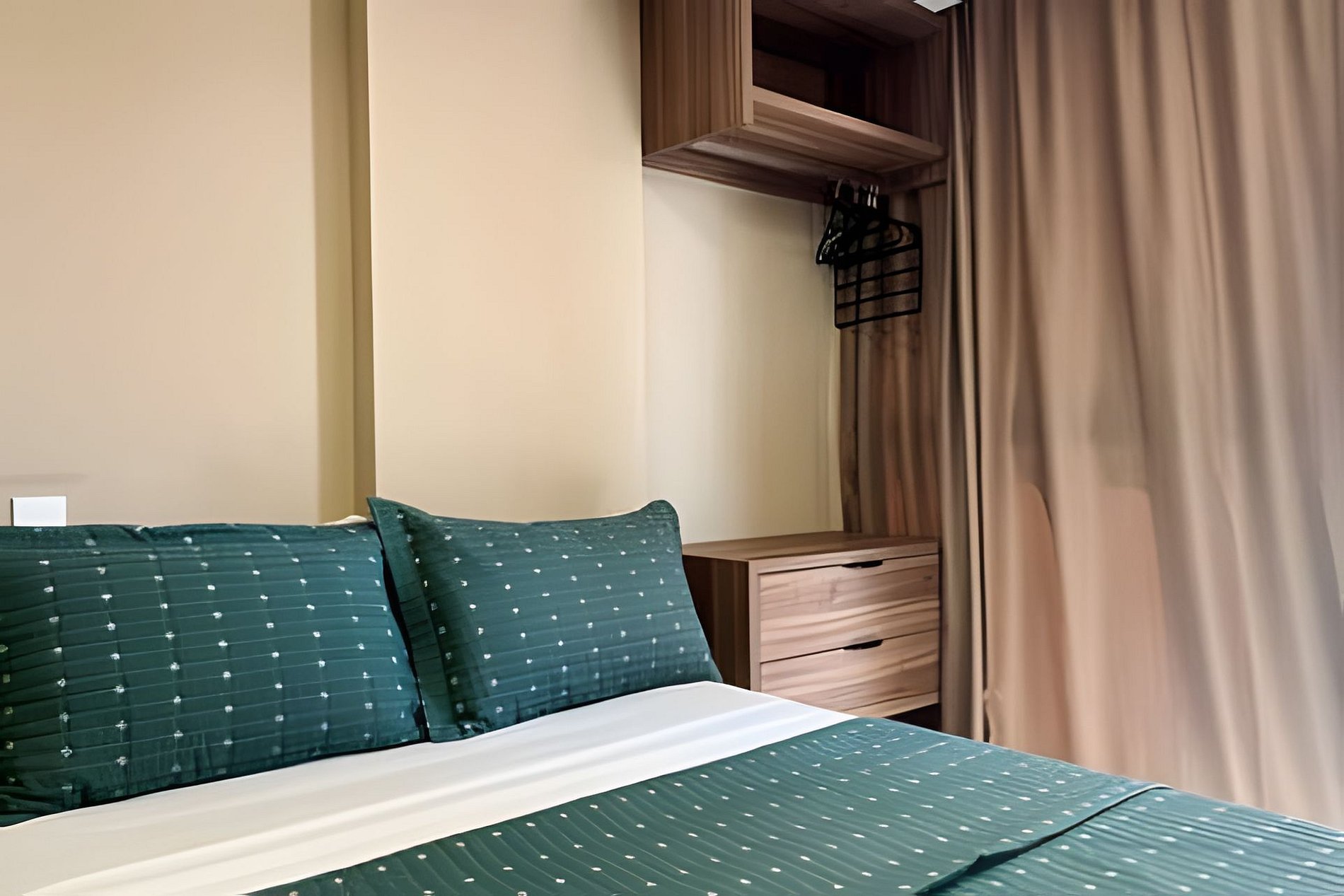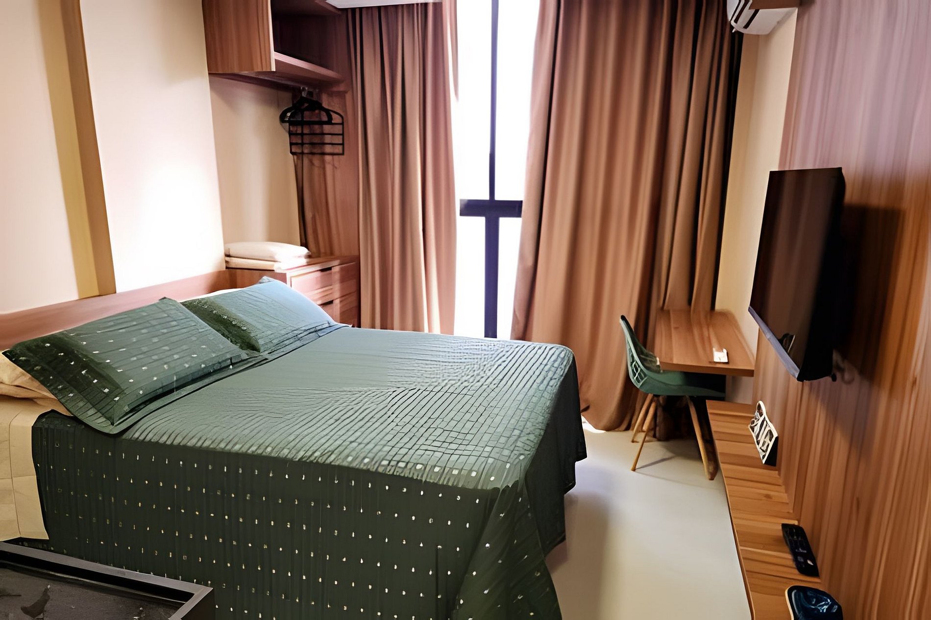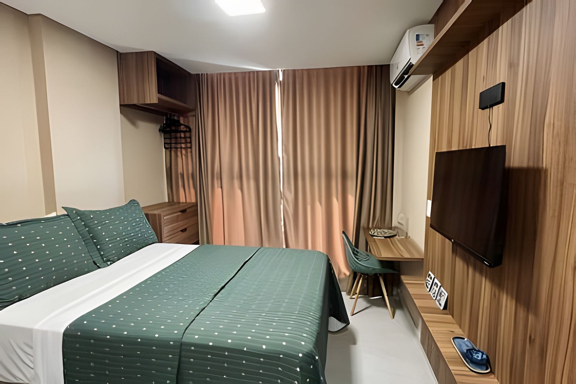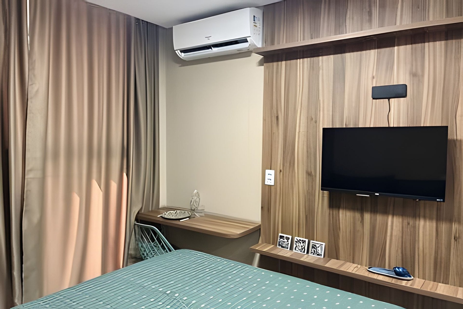 - Quarto com 1 cama casal, SmarTV, Ar-condicionado, Mesa com 1 lugar e Espaço para roupas;