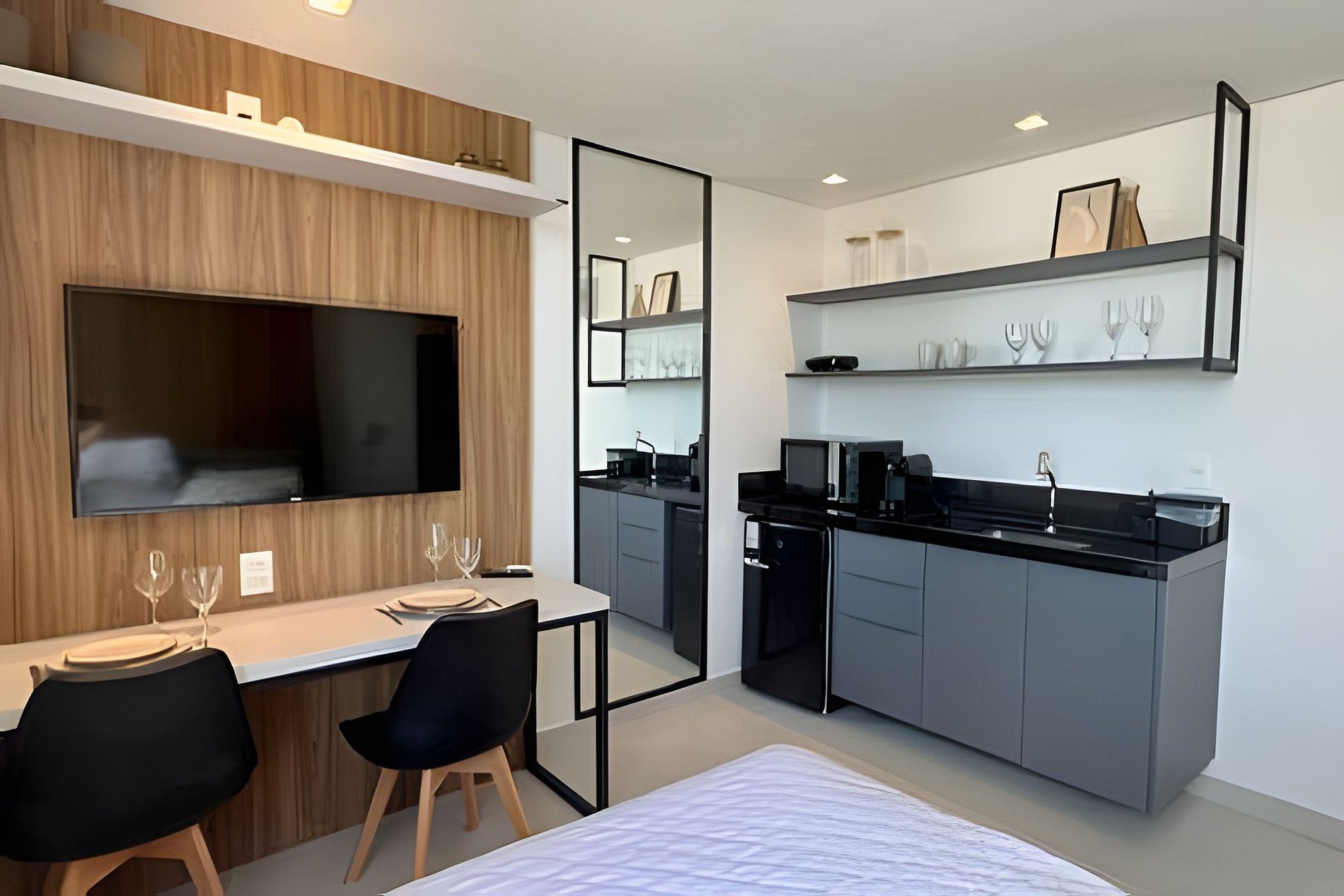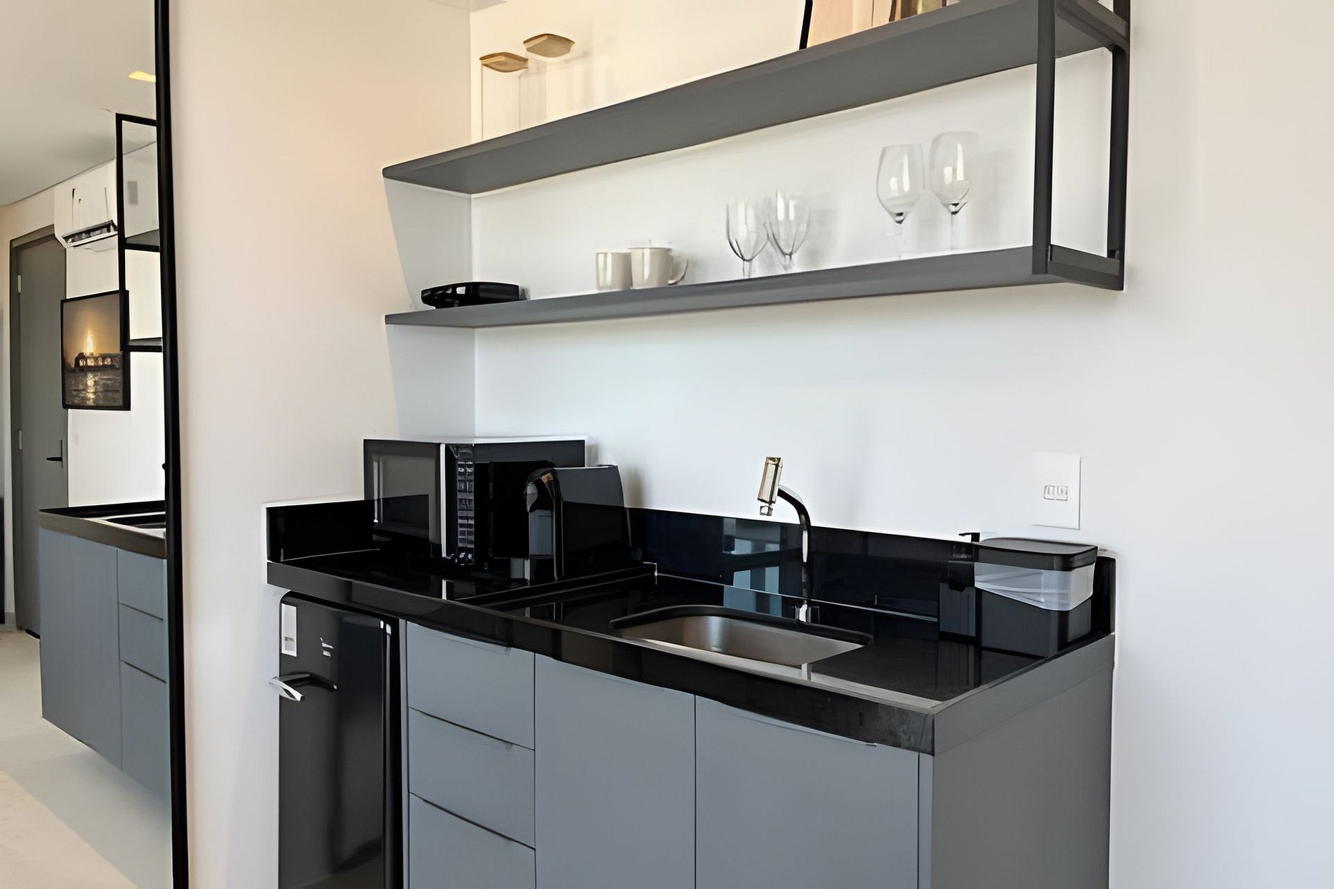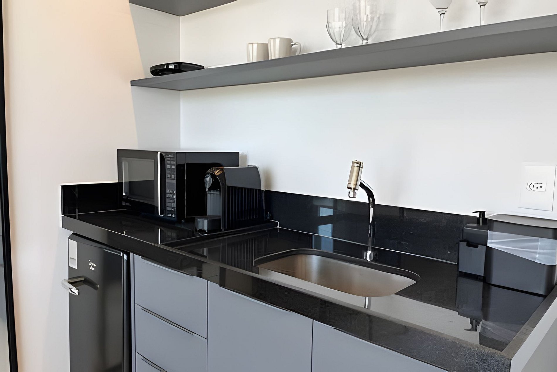 - Cozinha com Frigobar, Micro-ondas, Sanduicheira e Cafeteira (cápsulas por conta do hóspede). Além de utensílios como copos, xícaras, taças, pratos e talheres. (No item comodidade não dispomos de óleo, tigelas, vasilhas, pimenta e Hashi).