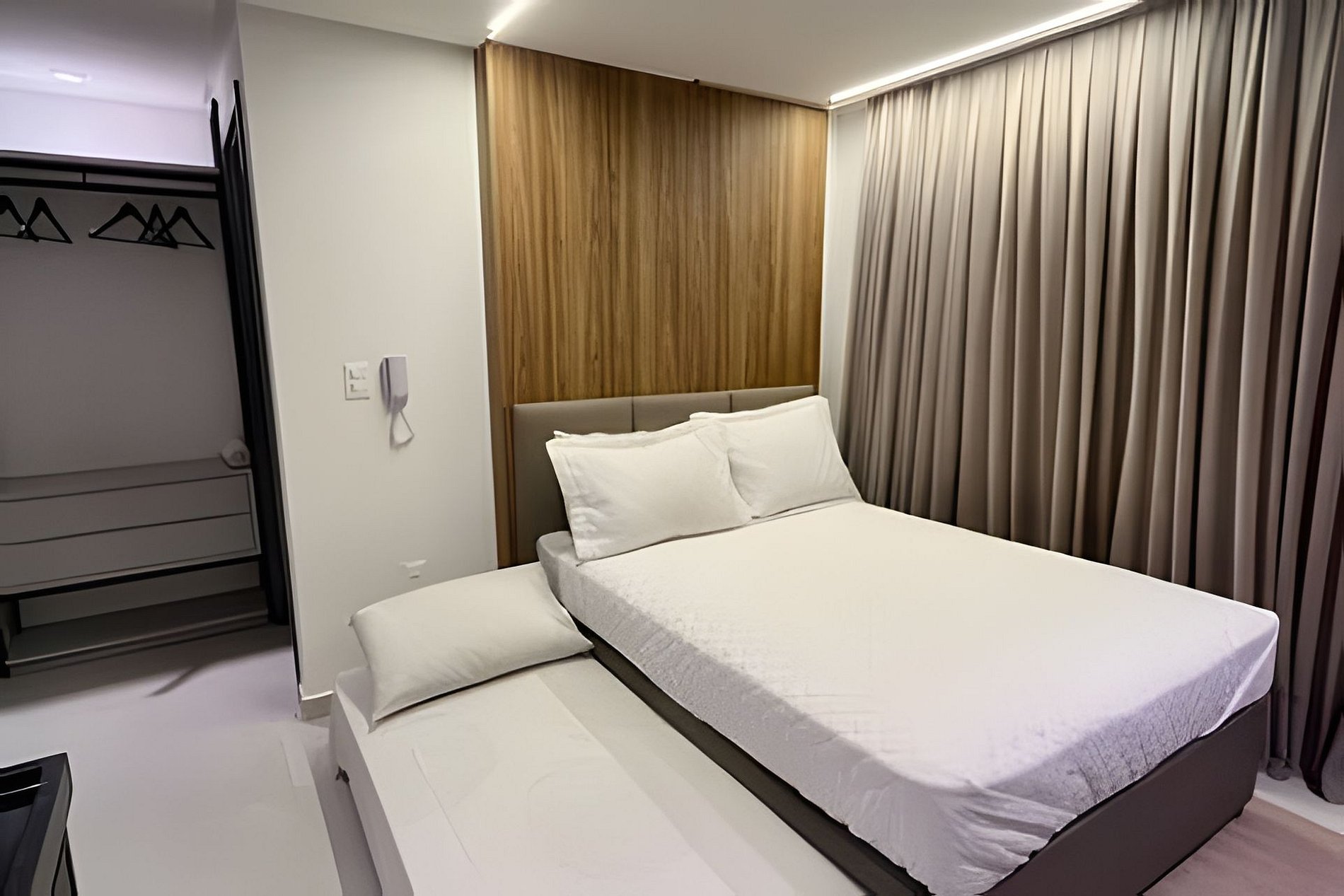 - Quarto com cama casal e 1 cama de solteiro acoplada, Espaço para guardar roupas, SmarTV, Ar-condicionado e Mesa com 2 lugares;